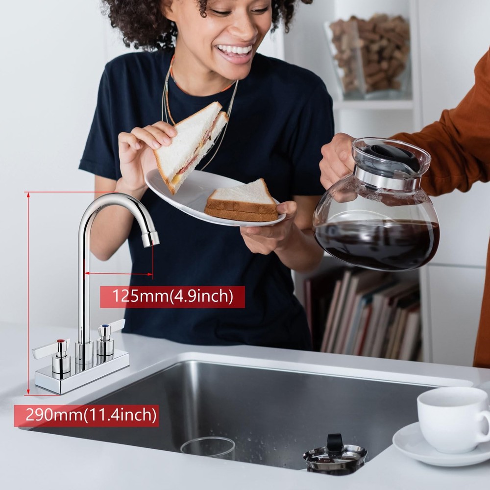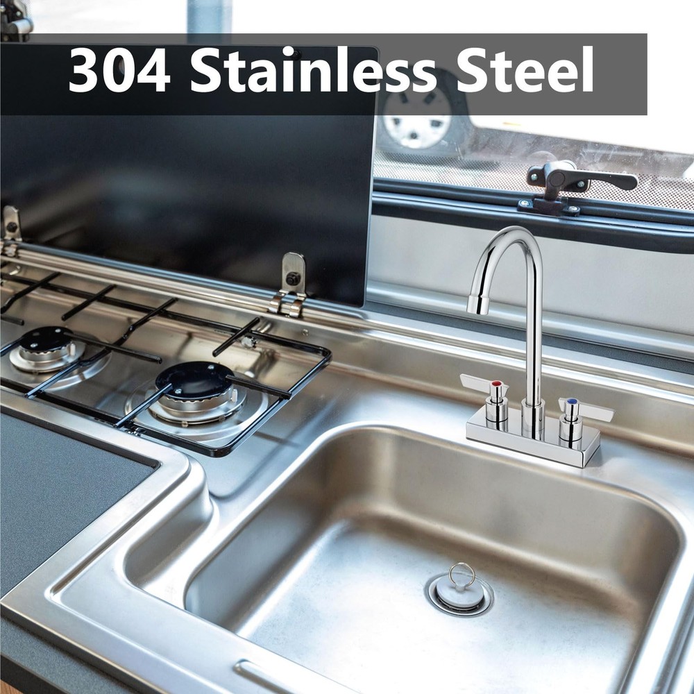 Multipurpose-Water Use Information: 1.2gpm 4.54L/min.Great choice for commercial and home use, perfect for bar sinks, laundry tubs, kitchen islands, prep sinks, bathrooms, RV sinks. Comes with removable aerator. Material- This bar sink faucet spout is made of SUS304 material, which is not easy to rust and practical. The overall appearance is modern and stylish. Temperature Control-Commercial faucets for sink 2or3 hole with two lever handles for easily and smoothly adjustments of water flow and temperature. Easy to install - 4" centerset, 2 holes deck mount,rotatable spout.Comes with instructions for easy installation. Easy to clean- The rotatable spout can easily clean every corner.