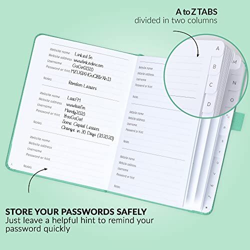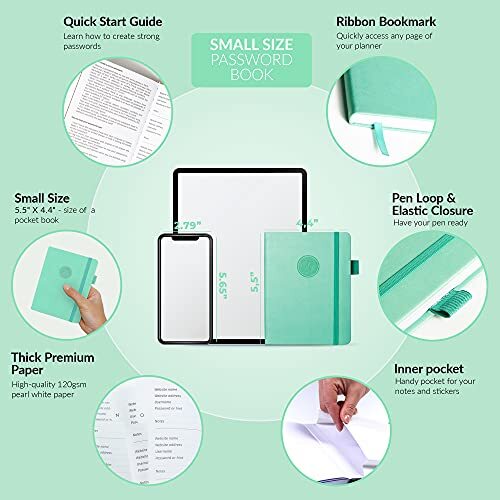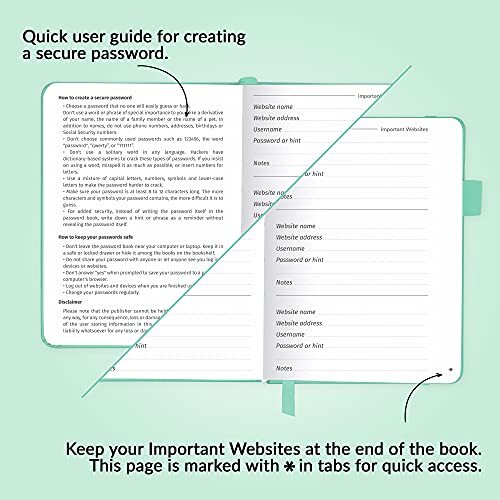 Return Policy Fast Delivery Trusted seller Password Book with Alphabetical tabs - Internet Address & Password Keeper Logbook for Password Organization. Journal Notebook for Saving Website Logins Pocket Size 4.0"x5.5", Emerald Product Description KEEP PASSWORDS SAFE- Password Book gives you the opportunity of a safe password organization in one place that no hacker can reach. And its classic hardcover does not give away the book's contents. CONVENIENT ORGANIZATION - Alphabetical tabs (A - Z) let you organize your website login information. The 1 letter per tab design helps minimize time spent searching for a specific password. IMPORTANT WEBSITES SECTION – At the back of this password logbook, we added a separate section for the most important websites. Here, you can store the logins you use most frequently, so you can find your passwords quickly every time. POCKET FORMAT & PREMIUM MATERIALS – Password notebook comes in a pocket format (4x5.5 inches) and has an eco-leather hardcover, thick 120gsm paper, lay-flat binding, elastic, pen loop, and pocket for loose notes. 60-DAY MONEY-BACK GUARANTEE - We will exchange or refund your Password Organizer if you aren’t satisfied with your password journal for women and men for any reason. Reach out to us via message to refund your password keeper. Shipping Returns Payment Shipping Shipping is FREE to all addresses other than APO/PO boxes in the lower 48 states. All our stock ships from US-based warehouses. Shipped via USPS or UPS (depending on location and package weight) Unless stated otherwise, all orders will ship within 24-72 hours of your payment being processed. Check our feedback to see the great reviews of FAST shipping we offer. Returns Seller does not accept returns Payment We currently accept payment via eBay managed payments only. Once payment is cleared, we will dispatch your shipment within 1-3 business days. Please refer to the "Shipping" tab for more information regarding shipping speed to your destination.
