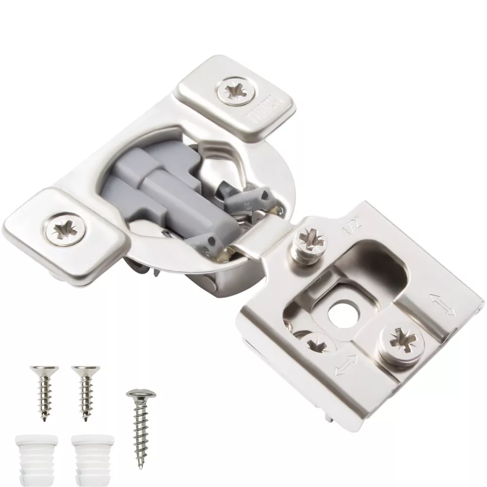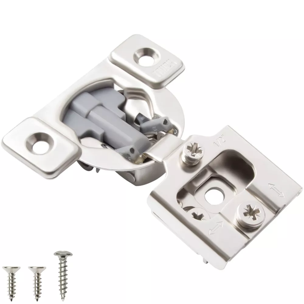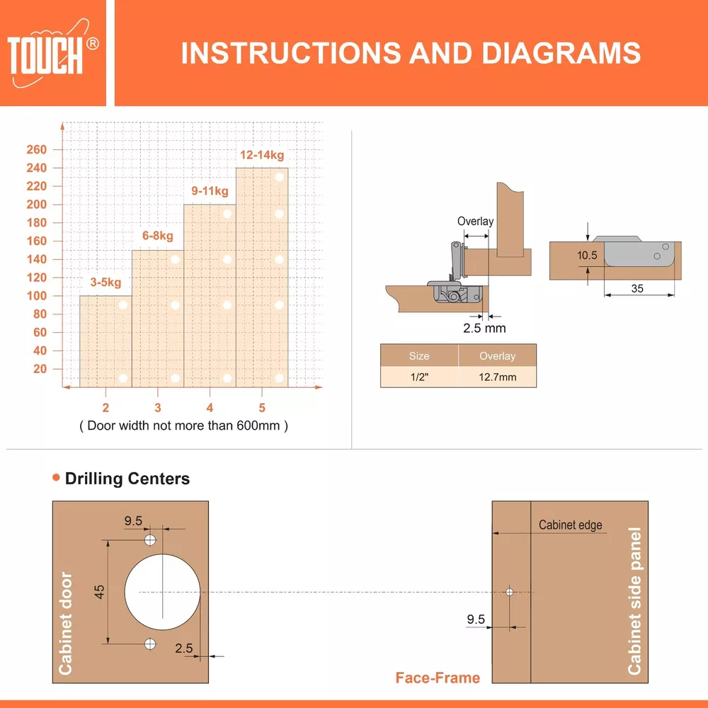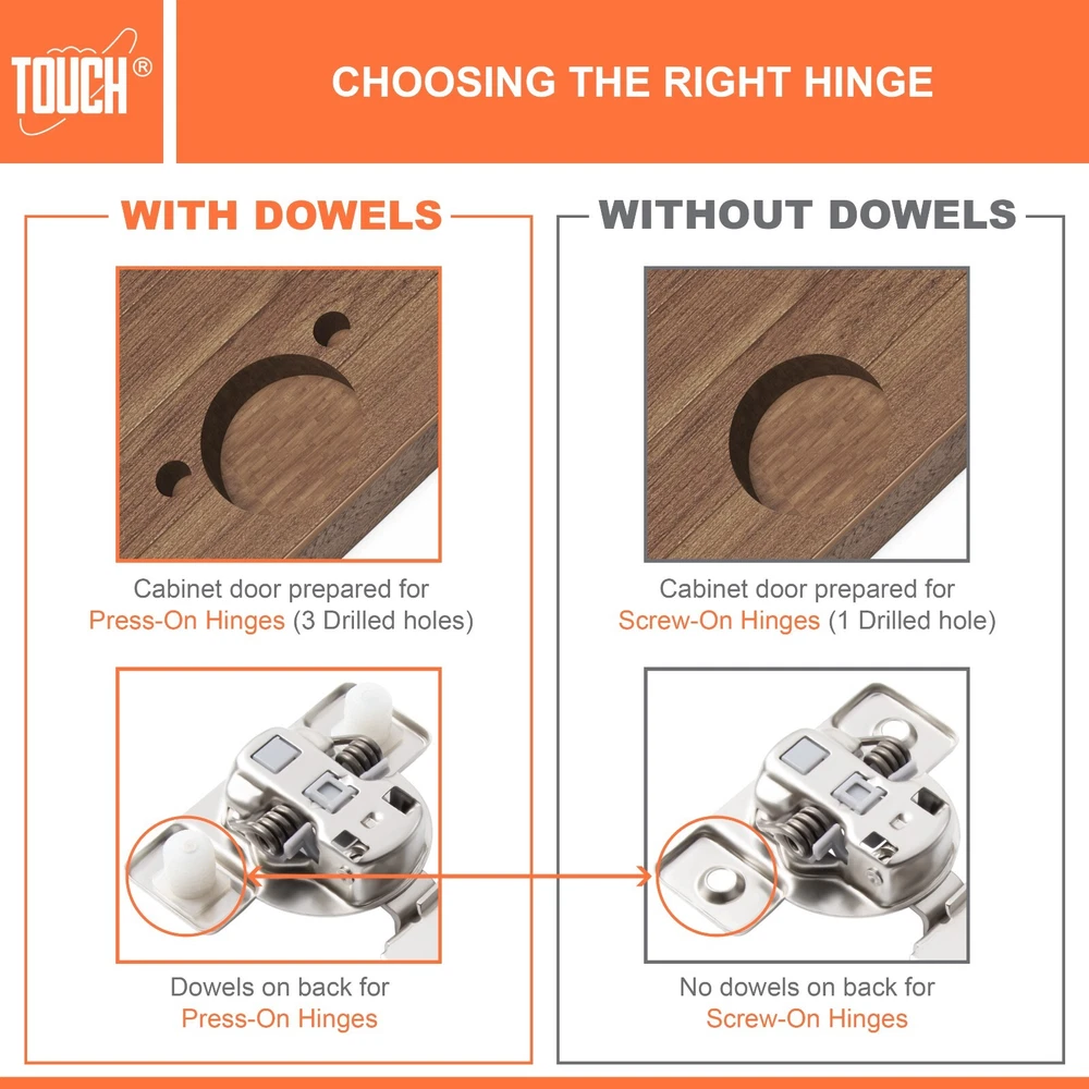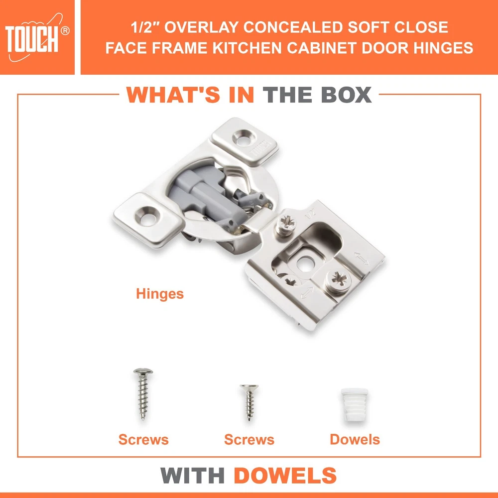 High-Quality Products TOUCH Cabinets Hardware is committed to providing a high-quality cabinet hardware, such as Door Hinges, Drawer Slides, and other kitchen cabinets hardware. Why TOUCH? Unlike other hinges, TOUCH compact - hidden soft close cabinet hinges come with two screw holes on the cabinet side to secure the hinge. The hinge’s unique design makes it height, depth and side adjustable, leaving room for no awkward gaps or clashing doors! Your satisfaction is our main priority, and we trust that our product will meet your needs. A 30-days full return/replacement is offered if faced with any obstacles, NO questions asked! SOFT CLOSE COMPACT CABINET HINGES 3D CAM ADJUSTMENT Keep your cabinets easy to open and simplify your bathroom or kitchen setup with these kitchen cabinet hinges. These cabinetry hinges allow cabinets to close easily and silently, making this cabinet hardware perfect for use with kitchen cabinet doors, bathroom vanity cabinet doors, wall cabinet and furniture cabinets. Ideal for use with face frame cabinets, the slide hinges are constructed with cold-rolled steel and can be conveniently installed for use with new cabinets, or as a replacement for old kitchen cabinet hardware, vanity and bathroom cabinets. The hinge hardware includes plastic dowels and cup covers for easy mounting, measure 1/2", and feature an opening angle of 105 degrees. SPECIFICATIONS Application: Face frame cabinet Closing type: Soft Close Mounting type: Screw-on or with dowels Opening angle: 105° Degree Diameter of hinge cup: 35mm Height of hinge cup: 10.5mm Distance of cup holes centers: 45mm Door thickness: 14-21mm CLOSING TYPE Soft close cabinet hinges features a built-in hydraulic damper. ADJUSTMENT 3D cam adjustment for easy adjust and precise Installation. OPENING 105° degree opening angle it’s easier to open doors to suit your kitchen needs. Mounting Type: Overlay Type: Closing Type: Face Frame 1/2" Half Inch Overlay Soft Close Face Frame 3/4" Overlay Soft Close Face Frame 1" Full Overlay Soft Close Face Frame 1.25" Overlay Soft Close