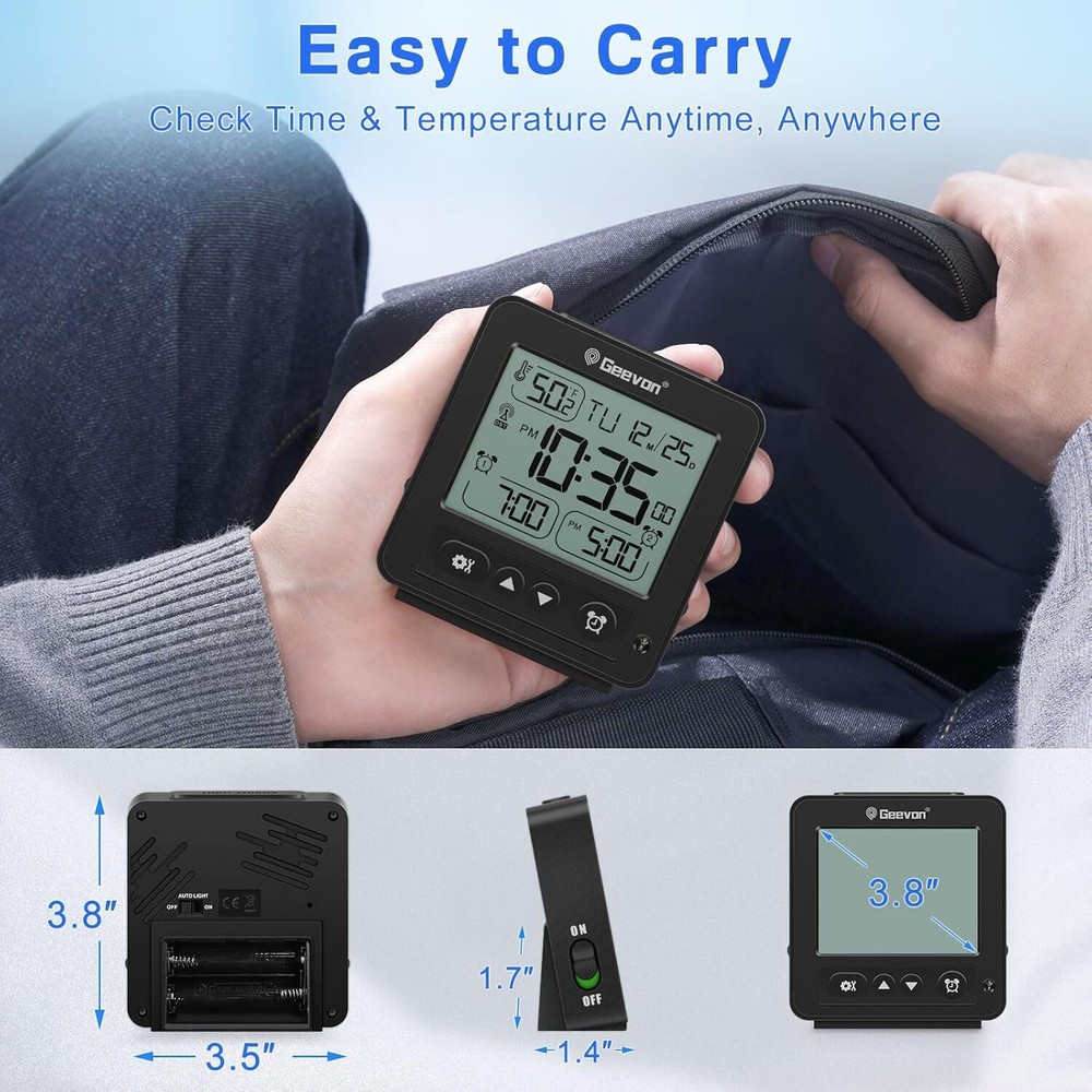 [Reliable RCC Time Sync for Accurate Timekeeping] Automatically syncs with RCC signals at 1:00 a.m., 2:00 a.m., 3:00 a.m., 4:00 a.m., and 5:00 a.m. Ensure your time zone is set correctly for precise updates. Manual syncing is also available by holding the “down” button for 2 seconds [Dual Alarms for Flexible Scheduling] Set two different alarms to match your daily routines or multiple schedules. This feature is suitable for couples, families, or anyone who needs separate wake-up times, making mornings easier and more convenient [Auto Light Function for Nighttime Convenience] The "Auto Light" button activates a soft blue glow in the dark, providing clear visibility of the time without being too bright or disruptive during sleep [Compact & Travel-Friendly Design] With a size of just 3.5"x3.8"x0.98", this portable alarm clock is easy to pack and carry, making it a perfect travel companion or a space-saving solution for bedside tables [8-Second Backlight for Quick Visibility] A simple press of the top button activates the backlight, which stays on for 8 seconds, allowing you to check the time easily in dim or dark conditions