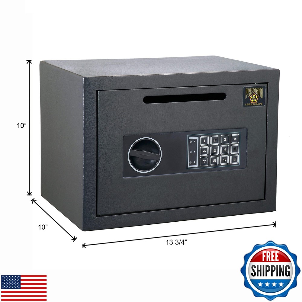Drop Safe - Digital Safe Compact Steel Money Security Box with Keypad - Deposit Cash Easily – For Home or Business by Paragon Safe - Black Features DEPOSITORY SAFE – The money drop box can conveniently be utilized in your home or business and is designed with a front slot to easily deposit money or coins. This safe deposit lock box can be mounted on your wall or floor for added security. LED KEYPAD – This cash drop box is protected with a LED keypad that can be programmed with master and guest codes 3-8 digits long. Equipped with 2 manual override keys, you never have to worry about being locked out of your safe if you forget the code. SECURE CASH STORAGE – The slot safe is constructed of 11-gauge solid powder-coated steel with concealed inside hinges for extra security. Enjoy the peace of mind in knowing that your valuable assets are locked up safely. AUTOMATIC LOCK – After 3 incorrect entries, the built-in alarm on the money lock box with slot will sound for 20 seconds, and after 3 more incorrect entries, the drop safe for business will sound for 5 minutes, alerting you to attempted access. PRODUCT DETAILS – Materials: Powder-Coated Steel. Dimensions: (L) 13.75” x (W) 10” x (H) 10”; Interior: (L) 13.5” x (W) 7.25” x (H) 9.5”; Slot: (W) 6” x (H) 0.5”. Weight: 22lbs. 4AA Batteries and Anchor Bolts Included. Color: Dark Gray. Shipping Free & Fast Shipping: We offer free shipping to most of the USA with a normal delivery time of 3-7 days. However, due to the current situation, additional delivery time (up to 3 weeks) may be required for some items. Alternative Carriers: We may use alternative carriers (e.g., USPS, FedEx, UPS) to ensure your package arrives safely and on time. Due to the use of multiple carriers, we are unable to provide a tracking number automatically. Handling Time: Orders are processed and shipped within 1-2 business days of receiving cleared payment. Shipping Restrictions: Shipping to Alaska, Hawaii, Puerto Rico, Guam, and other US territories may incur shipping charges or delivery restrictions. Please contact us before ordering, or your order can be refunded/cancelled. State Restrictions: Certain items may not be shipped to California due to state regulations. Contact for Tracking Updates: If you require tracking updates or have any concerns about the delivery of your order, please feel free to contact us, and we will be happy to assist you. Return Policy 30-Day Hassle-Free Returns: If you are not completely satisfied with your purchase, you can return the item for free within 30 days of receiving it for a full refund or exchange. Easy Return Process: Contact us, and we will provide you with a prepaid return shipping label and detailed instructions. No Restocking Fee: There are no restocking fees for returns. However, the buyer is responsible for return shipping costs if the return is not due to a seller's error. Refund Processing: Refunds will be processed within 1 business day of receiving the returned item in its original condition. Payment We accept all major credit cards, PayPal, and Apple Pay for your convenience. Your payment information is secure and encrypted to ensure a safe and seamless transaction. Please complete your payment within 3 days of purchase to avoid any delays in shipping. Feedback Your feedback is extremely important to us. We strive to provide the best products and customer service possible. If you are satisfied with your purchase, please take a moment to leave us a positive review. If you have any concerns or issues with your order, please contact us before leaving negative feedback. We are committed to resolving any problems and ensuring your satisfaction. Contact Us If you have any questions or concerns, please feel free to reach out to our customer support team. You can contact us through the eBay messaging system. We are available Monday to Friday, 9:00 am to 5:00 pm EST, and we will do our best to respond to your inquiry within 24 hours. Thank you for supporting our small family business!