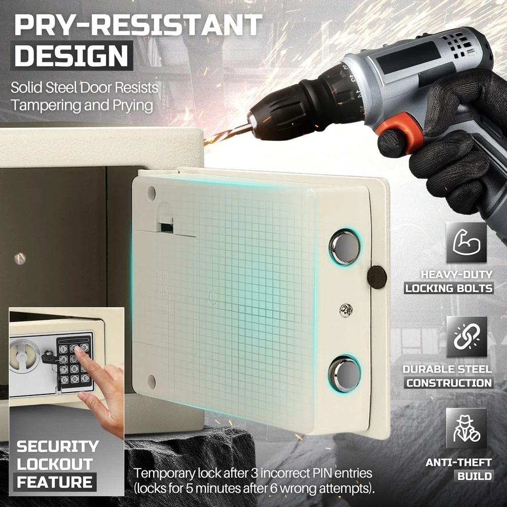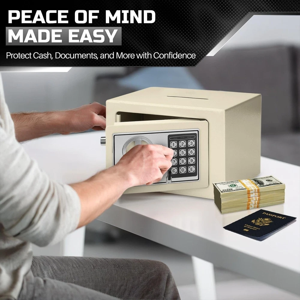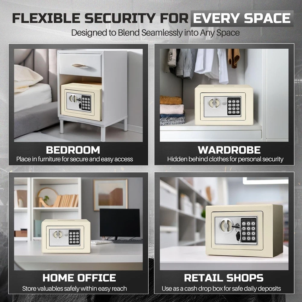 The small money drop slot is the perfect solution for secure storage at home, in the office, or for business use. Designed as a money drop box with lock and slot, it allows hassle-free deposits without needing to open the safe, making it an excellent cash drop box for business operations or cash handling tasks. This cash drop safe features a digital keypad with reprogrammable access codes, offering keyless convenience and enhanced security. Built to resist tampering, this security safe box is equipped with live-door bolts and concealed hinges for superior protection. With over 550 cubic inches of storage capacity, this is ideal for safeguarding your valuables, including cash, important documents, and jewelry. Its compact design and adjustable shelf make it versatile, functioning as a drop box safe, a safe deposit box for home, or even a hotel safe. For added convenience, this electronic safe includes emergency override keys and mounting hardware, allowing secure installation on floors, walls, or shelves. Protect your valuables with this reliable and durable, crafted to deliver peace of mind and security in any setting. Specification: Operation: Digital PIN or Override Key Dimension: 12" x 8" x 8"(W x D x H ) Material: Solid Steel Color: White Package Content: 1x Small Safe Box with Drop Slot - Electronic Drop Safe Box for Money with Digital Combination Keypad Lock - Cash Safe Box for Cabinets, Home & Office Security (12"x8"x8"), White Secure and Durable Design: This cash safe box with drop slot offers over 550 cubic inches of secure interior storage space, perfect for safeguarding legal documents, jewelry, passports, cash, and other valuables. Ideal as a money safe for cash Reprogrammable Digital Access: Safe with code features a customizable 8-digit digital code for easy, keyless entry and enhanced security with a lockout mechanism after multiple incorrect PIN entries. Designed as a safe with drop slot, its perfect for securely storing cash, documents, and valuables Emergency Access with Override Keys: Includes 2 override keys to access your hotel safe or drop safe for business even if the code is forgotten or batteries run out Tamper-Proof Design: Built with solid steel, this safety deposit box for home features live-door bolts and concealed hinges to resist tampering, ensuring the safety of your valuables and serving as a reliable safe for money Adjustable and Mountable Design: This small safe box includes an adjustable shelf and mounting hardware, allowing you to secure it to a wall, floor, or shelf for added protection and convenience. Perfect as a small money safe to keep your valuables organized and secure