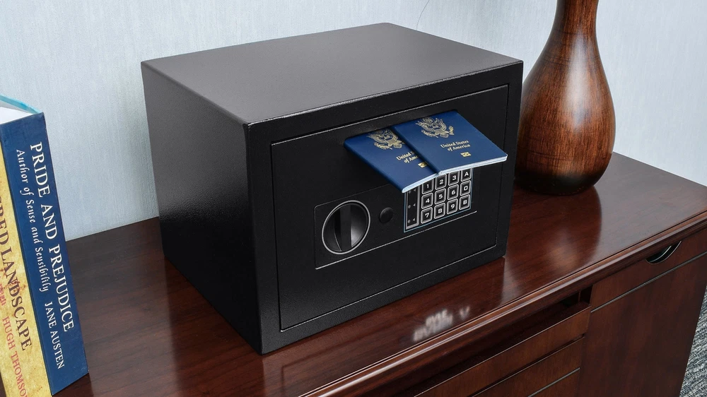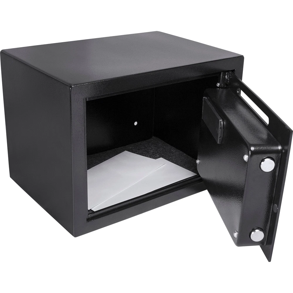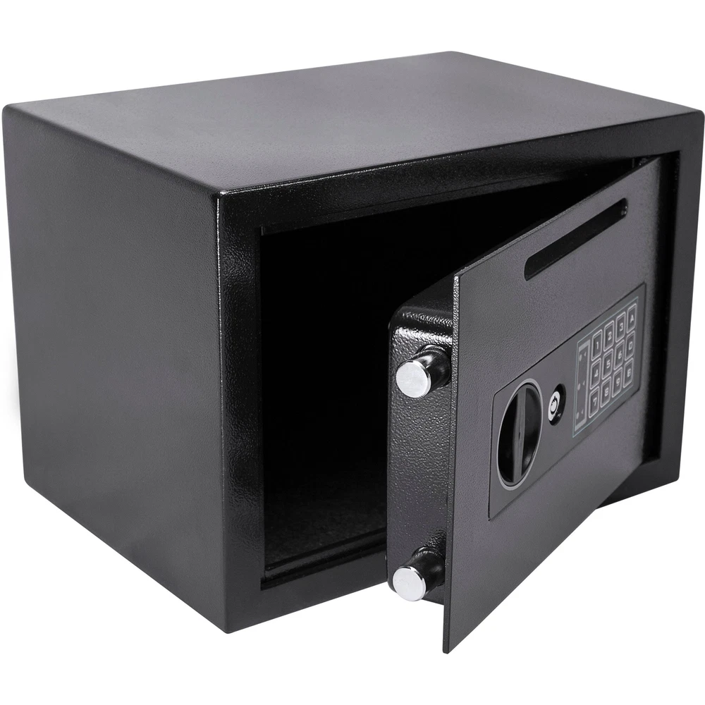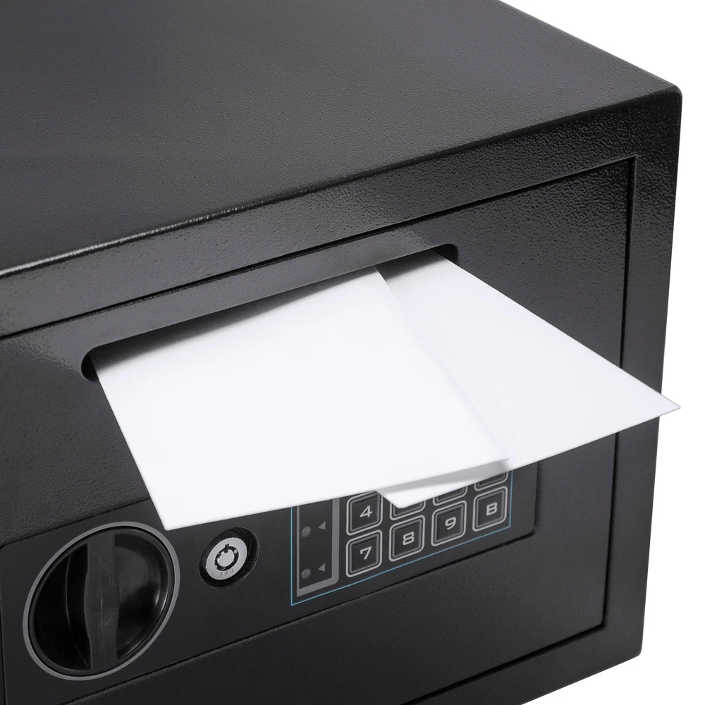 Secure Your Valuables with This Heavy-Duty Drop Safe This black steel drop safe is designed to keep your cash, checks, mail, and other small valuables secure from theft. It features a solid steel construction, anti-fishing baffles, and two built-in pry-resistant steel deadbolts. The digital keypad can store two unique PIN codes, allowing multiple authorized users access. 1 A temporary lockout mode activates when an unauthorized user attempts to input the incorrect PIN code too many consecutive times. 2 The safe comes with pre-drilled holes and mounting hardware for easy installation. Specifications: Main Color: Black Main Material: Steel Assembled Length (in.): 9.85 Assembled Width (in.): 13.75 Assembled Height (in.): 9.85 Weight (lbs): 22.50 Features: Drop slot allows deposits to be made while the safe is locked Solid steel construction Anti-fishing baffles 3 Two built-in pry-resistant steel deadbolts 4 Digital keypad with two unique PIN codes 5 Temporary lockout mode Pre-drilled holes and mounting hardware for easy installation
