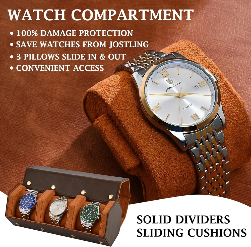 Compact Luxury Watch Roll for Travel - Holds 3 Watches in Brown Suede & Leather ‹ › ‹ › ‹ › ‹ › ‹ › ‹ › ‹ › ‹ › Compact Luxury Watch Roll for Travel ⌚ Holds 3 Watches in Elegant Brown Suede & Leather Pack your finest watches with confidence in our meticulously designed compact watch roll, ensuring you are prepared for every occasion with up to 3 exquisite timepieces. Features: Stylish and functional watch roll designed for the discerning traveler. Made from the most reliable and fashionable leather, complemented by luxurious velvet color matching. Soft suede interior provides optimal anti-scratching protection for your precious watches. Watch pillows secured with studs ensure that your timepieces remain stable and secure during travel. Compact size: 9"(L) x 3.35"(W) x 3.74"(H) makes it easy to fit in your luggage. Weighs just 1 pound, making it an effortless addition to your travel essentials. Enclosed in a classy hard white box, making it a perfect gift for watch enthusiasts or for yourself. Benefits: Outstanding protection from dust, spills, and minor falls, ensuring your watches remain in pristine condition. Convenient and stylish design to enhance your luxury watch collection. Easy to remove or replace watches without any hassle thanks to the secure yet accessible design. Satisfies your aesthetic sense while keeping functionality in mind. Why Choose Our Watch Roll? Elevate your travel experience with a watch roll that encapsulates both luxury and practicality. Each component is thoughtfully crafted to convey sophistication while safeguarding your beloved timepieces. With the ability to hold three watches, this compact beauty ensures you are ready for any occasion, be it formal gatherings or casual outings. Don't just travel with style—do it with peace of mind. This watch roll comes with a full 30-day money-back guarantee, allowing you to purchase with confidence. Add this indispensable accessory to your travel collection today! Shipping Free & Fast Shipping - We offer free shipping to most of the USA with a normal delivery time of 3-7 days. However, due to the current situation, additional delivery time (up to 3 weeks) may be required for some items. Alternative Carriers - We may use alternative carriers (e.g. USPS, FedEx, UPS, etc.) to ensure your package arrives safely and on time. Due to the use of multiple carriers, we are unable to provide a tracking number automatically. Handling Time - Orders are processed and shipped within 1-2 business days of receiving cleared payment. Shipping Restrictions - Shipping to Alaska, Hawaii, Puerto Rico, Guam, and other US territories may incur shipping charges or delivery restrictions. Please contact us before ordering, or your order can be refunded/cancelled. State Restrictions - There may be restrictions based on your state of purchase. For example, certain items may not be shipped to California due to state regulations. Contact for Tracking Updates - If you require tracking updates or have any concerns about the delivery of your order, please feel free to contact us, and we will be happy to assist you. Return 30-Day Hassle-Free Returns - We want you to be completely satisfied with your purchase. If you are not, you can return the item within 30 days of receiving it for a full refund or exchange. Easy Return Process - To start a return, simply contact us and we will provide you with a prepaid return shipping label and detailed instructions. Restocking Fee - There are no restocking fees for returns. However, the buyer is responsible for return shipping costs if the return is not due to a seller's error. Refund Processing Time - Refunds will be processed within 5 business days of receiving the returned item in its original condition. Payment We accept all major credit cards, PayPal, and Apple Pay for your convenience. Your payment information is secure and encrypted to ensure a safe and seamless transaction. Please complete your payment within 3 days of purchase to avoid any delays in shipping. Feedback Your feedback is extremely important to us. We strive to provide the best products and customer service possible. If you are satisfied with your purchase, please take a moment to leave us a positive review. If you have any concerns or issues with your order, please contact us before leaving negative feedback. We are committed to resolving any problems and ensuring your satisfaction. Contact Us If you have any questions or concerns, please feel free to reach out to our customer support team. You can contact us through the eBay messaging system. We are available Monday to Friday, 9:00 am to 5:00 pm EST, and we will do our best to respond to your inquiry within 24 hours. Buy it now and enjoy a pleasant shopping experience! UPC: Not Set Unit Quantity: 1 Material: Faux Leather,Suede Brand: Unbranded Type: Travel Pouch Color: Brown Capacity: 3 Watches Theme: Luxury Country/Region of Manufacture: Not Set Year Manufactured: Not Set MPN: Not Set Unit Type: lb Vintage: Not Set Handmade: Not Set Personalize: Not Set Personalized: Not Set