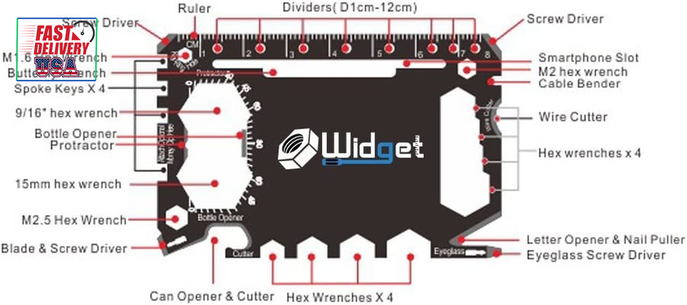 Store New Arrivals Add to Favorite View Feedback Contact , Multi Purpose Survival Pocket Tool - Stocking Stuffers for Men Great Christmas Gifts - Credit Card Wallet Size Ninja Multitool - 43 in 1 (Black) Description Item model number Widget-Black Part Number Widget-Black Item dimensions L x W x H 3.3 x 2.1 x 0.04 inches Item Weight 1.2 Ounces Item Package Quantity 1 Color Black Included Components Wrench, Screwdriver, Money Clip, Peeler, Letter Opener, Blade, Ruler, Bottle Opener, Sheath, Knife, Wire Cutter, Protective Case, Nail Puller, Can Opener Product Dimensions 3.3 x 2.1 x 0.04 inches Material Stainless Steel Style Widget Ninja card Black Thickness 0.04 Inches Global Trade Identification Number 00840194901956 Batteries Included? No Folded Size 3.3 inches (l) x 2.1 inches (w) x less than 0.04 inches (h) Batteries Required? No Number of Pieces 1 Is Discontinued By Manufacturer No Includes 1 Premium Widget Credit Card multitool with sleek carrying case | Great wedding gift for Best man, Gromesmen, Ushers and Marchers. | Must have for Hunting, Hiking, Camping trips, Boy scouts, Girl scouts, outdoor adventures and anybody who carries a wallet. The Original WIDGET multi-use Pocket Tool - 46 Tools packed in a small Stainless Steel flat multi tool - weighs only 1 ounce & fits flat in even the smallest of wallets. PREMIUM QUALITY - Forged from heat treated virtually indestructible 420 Stainless Steel. | No Jagged Edges & won’t pull or ruin your clothing or poke you. | Brushed Finish. Take Anywhere - TSA Compliant | Widget Credit Card multitool Fits in most wallets | Weighs merely 1 once | Virtually unbreakable! 43 Functions: 3x Screw Drivers ( Phillip & Flatehead), Box Cutter/ Blade, Bottle Opener, 2x Ruler (cm/in), Can Opener, Cell Phone Mount, Nail Puller, Eye Glasses Screw Driver, M2 Hex Wrench, 4x Open Hex Wrench (M3,M4,M5,M6), 4x Closed Hex Wrench (7/16, 3/8, 11/32, 5/16), M1.6 Hex Wrench, Butterfly Wrench, 4x Spoke Keys (.127, .130, .136, .156), 9/16" Hex Wrench, Protractor, 15mm Hex Wrench, M2.5 Hex Wrench, 8x Dividers (D1cm-12cm), Key Ring hole, *Money clip (*Money Clip version only) and more We all heard of the Swiss Army Knife. But who wants to walk around with bulky knifes hanging from their keychain or bulging from their pockets. The Widget multitool is a top rated slim waterproof “widget” that stands out from the rest & will not rust or hurt your hands. Smaller than your average credit card, our stainless steel multi tool will fit in any walet, purse, or you can store it in your back pocket using the black pouch that it comes with. The Widget has more gadgets than you can imagine and makes a great gift for both Men & Women. Whether you are a Do-it-yourselfer, into carpentry, live on a boat, love the outdoors, work in construction, an avid camper, or simply need to open boxes or even to use as can openers – our slim multitools will function for a lifetime. One of the most unique products around. Designed to never bend and will not break in your hand. You will never want to leave your house without it. Perfect gifts for Groomsmen, home improvement enthusiast, carpenters, mechanics, ninjas, business owner, or any mens or womens occasions – there will never be a dull moment. The Widget comes in 2 colors (Black & Silver) & 2 Styles with and without a money clip. 43 Handtools: (3x) ScrewDrivers – Phillips / Flat Head Box Cutter – Blades - knives Bottles Opener (2x) Rulers ( cm / inch ) Can Opener Mount for Smart Phones Cable Bender Wire Cutter / Peeler Letter Opener Pulls Nails out (Nail Puller) Eye Glasses Screw Driver M2 Hex Wrench (4x) Open Hex Wrench (M3,M4,M5,M6) (4x) Closed Hex Wrench (7/16, 3/8, 11/32, 5/16) M1.6 Hex Wrench Butterfly Wrench (4x) Spoke Keys (.127, .130, .136, .156) 9/16" Hex Wrench Protractor 15mm Hex Wrench M2.5 Hex Wrench (8x) Dividers (D1cm-12cm) Key Ring hole *Money clip (*Money Clip version only) ABOUT US We offer the best prices around on high quality products. Our E-store includes media such as books, movies, music and games while offering electronics, toys, sporting apparel, clothing, tools, general home, garden items and more. SHIPPING We are always working hard to ensure your package arrives as soon as possible. Please understand that some factors like weather, high postal traffic, and the performance of shipping companies are outside of our control. We offer free shipping to the lower 48 states and ship within 2 business days of payment, usually sooner. We do not accept P.O. Boxes. Please provide a physical address. For shipping outside of the continental USA, we only use eBay's Global Shipping Program.The item is shipped to KY and then sent to the rest of the world. International customers are responsible for all duties and taxes. Continue to check out in order to calculate costs for shipping the item to your country. Messages regarding eBay's Global Shipping Program MUST be directed at eBay EXCLUSIVELY. RETURNS We offer a 30-Day Return Policy on items which you are not completely satisfied with. You have the option for a full-refund or an exchange of the item. No returns are available on items shipped outside of the USA. PAYMENT We accept PayPal. CONTACT US This page content is yet to come Please ad us to your favorite seller and visit again later Thank You CUSTOMER SATISFACTION We try our very best to make sure every customer is completely satisfied. If there's a problem, message us! We're happy to help. WE ACCEPT Copyright © 2021 AutoDS. | All Rights Reserved