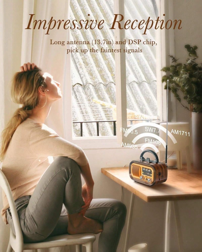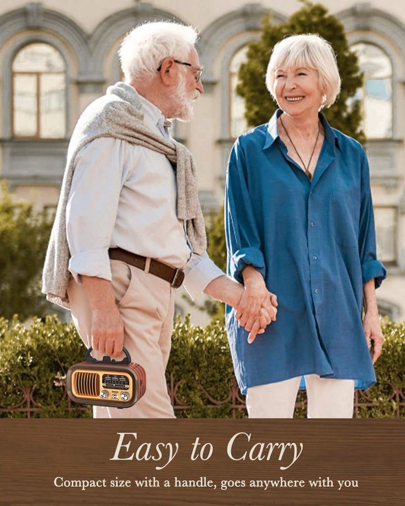 [Convenient to Carry]This vintage radio is small but not bulky with a handle, convenient for you to carry around. From a leisurely afternoon walk to an exciting camping night, you can enjoy this radio anytime. [Antique Appearance, Easy to Use] The antique wood grain gives it a vintage look, making it an indispensable interior decorative item. The tuning knob is much more convenient than the confusing buttons of a digital radio, and seniors can easily figure it out. This unique gift is suitable for everyone, especially the elderly and those who love vintage style. [3 Ways to Play: Bluetooth Speaker and TF/USB Play]It is not only a retro portable radio, but also plays your own music. The reliable Bluetooth technology allows you to stream music from your mobile phone to the radio speaker. You can also use USB drives and TF cards to play music if you're somewhere without an internet connection.