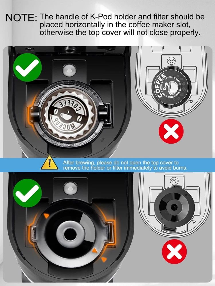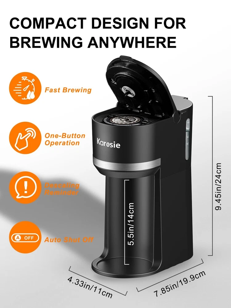 Single Serve Coffee Maker for K-Cup and Ground Coffee Pods & Grounds Specialty Single: The one cup coffee maker works with K-pods, and also comes with a big reusable filter for ground which you can fill with your favorite ground coffee. One-Button Fast Brew: Featuring one-button operation and fast brewing technology, this k cup coffee maker brews a 6-12oz cup of hot coffee in fast as fast 120s. Safety & Portable: The small coffee maker is made from BPA-free and heat-resistant materials to ensure durability and safety. At less than 4.33" wide, the incredibly slim and easy to use single serve coffee maker makes anywhere perfect for great coffee. Descaling Maintenance & Self-Cleaning: When your kcup coffee machine needs descaling, an indicator turns red. Just add descaling solution, hold the brew button for 2 seconds, and let it automatically clean itself. This prevents clogs and ensures optimal performance, extending the lifespan of your one cup coffee maker. Usage Tips: When your single cup coffee maker needs descaling, an indicator turns red. Just add descaling solution, hold the brew button for 2 seconds, and let it automatically clean itself. This prevents clogs and ensures optimal performance, extending the lifespan of your one cup coffee maker. 【Brew in 2 Ways】single serve coffee maker is compatible with both K pod and ground coffee, which satisfies the diverse taste needs of coffee lovers. With a brewing capacity of 6–12 oz, it features a one-button operation that fast brews a fresh cup of hot coffee. Great for chaotic mornings when you need caffeine ASAP 【Safety & Portable】The small coffee maker is made from BPA-free and heat-resistant materials to ensure durability and safety. It’s slim 4.33-inch width is idea for small kitchens, dorm rooms, offices, or RVs 【One-Button Fast Brew】Featuring one-button operation and fast brewing technology, this coffee machine brews a 12oz cup of hot coffee in fast as fast 120s 【Water Tank with View Window】The single cup coffee maker is built in a water tank with a view window for precise control of brewing strength. You can flexibly choose the amount of water to add according to your preference, thereby controlling the amount of coffee brewed 【Descaling Maintenance & Self-Cleaning】When your single cup coffee maker needs descaling, an indicator turns red. Just add descaling solution, hold the brew button for 2 seconds, and let it automatically clean itself. This prevents clogs and ensures optimal performance, extending the lifespan of your one cup coffee maker 【Usage Tips】When using for the first time, brewing with clean water once can help clean the pod coffee maker and maintain a better coffee taste. Please do not exceed the maximum water level when adding water. When descaling, make sure the capsule holder or ground coffee filter is empty