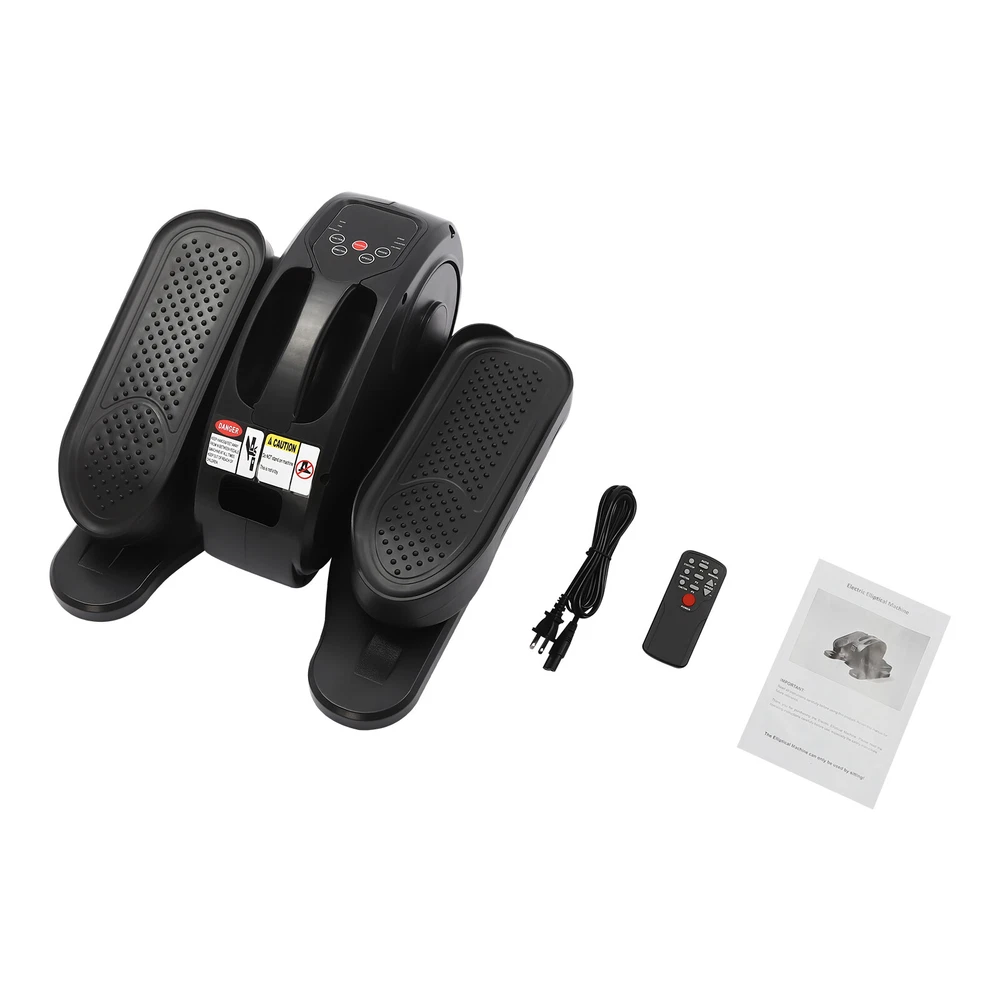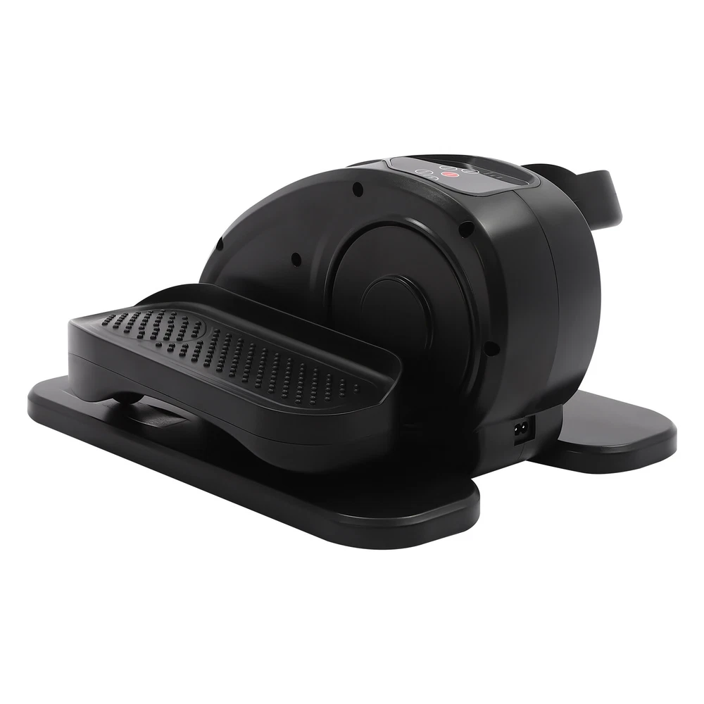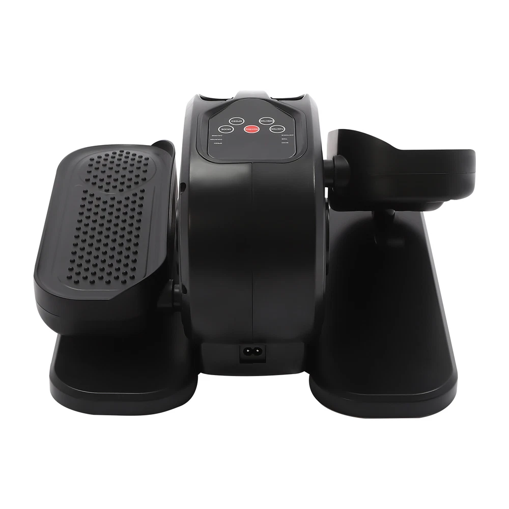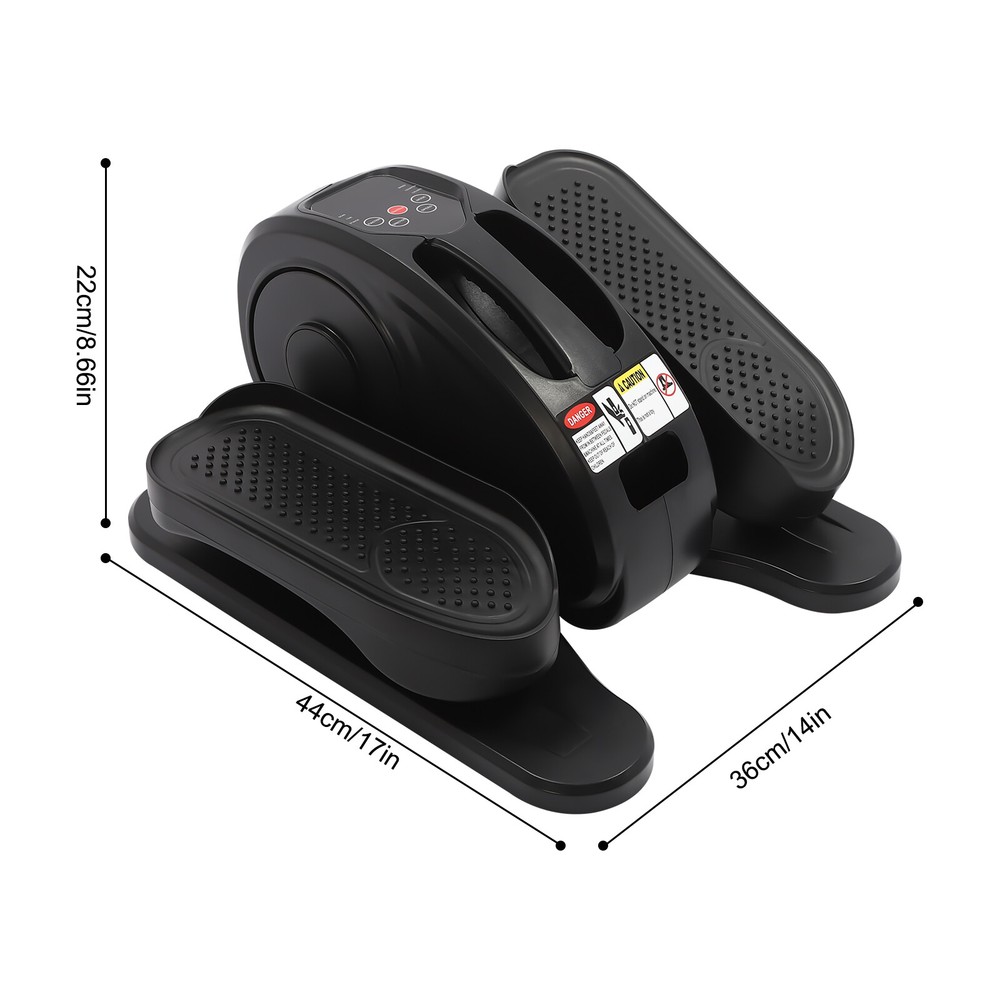 Electric Seated Leg Pedal Exerciser Under Desk Elliptical Machine w/ Remote Home Description Join us now with this mini under desk electric elliptical machine that combines technology, aesthetics, and practicality. It is suitable to be placed in your office or home to exercise your legs at any time. 5-speed adjustments and auto mode (P1, P2, P3) can meet your workout needs. The LED screen displays the calories you have burned in real time. The remote control and button adjustment are greatly convenient for your use. With this product, you can enjoy a more pleasant exercise experience. Specification Material: Steel, ABS, Copper Moter Type: All-copper Motor Color: Black Assembly Required: No Mount Type: Floor Standing Control Method: Remote Control, Button Screen Type: LED Power Source: Corded Electric Plug Type: US Standard Remote Control Battery: 2*AAA Batteries(Not Included) Power: 50W Voltage: 110-220V Manual Mode Adjustable Speeds: 5 Gears Auto Mode: P1, P2, P3 Overall Load-bearing Capacity: 25kg/55.1 lbs Remote Control Distance: About 1m/3.3ft Power Cord Length: About 1.85m/6.07ft Product Size: 44*36*22cm/17*14*8.66 in Package Size: 48.5*42*28cm/19.09*16.54*11.02in Gross Weight: 7.5kg/16.5 lbs Package Included 1* Under Desk Electric Elliptical Machine 1* Power Cord 1* Remote Control 1* English Manual Key Features Durable Upgrade: It is made of high-quality steel and ABS, making it not easy to rust and deform, ensuring durability and safety. It is the ideal choice for your long-term fitness partner. Excellent Performance: It is equipped with a high-quality all-copper motor and a steel flywheel to ensure efficient operation and stable performance. High Stability: The widened base with four non-slip foot pads makes it able to withstand a weight of 55.12 lbs, making it suitable for most people without tipping over. Thoughtful Design: There is a remote control compartment on the product for your convenience. Without an exposed crank, this product is safer and you can use it with confidence. Five-speed Regulation: Equipped with 5 manual speed adjustments, whether beginners or fitness enthusiasts, they can easily find the appropriate exercise intensity to meet the training needs of different stages. Scientific Training: The built-in intelligent preset program (P1, P2, P3) is designed according to scientific fitness principles, allows you to enjoy customized training plans without the need for planning, allowing professional guidance to accompany you. Helpful to Body: Oversized anti-slip pedals with many protrusions are designed for effective workouts and foot massages, intensifying stimulation of the soles of the feet, promoting blood circulation, and improving cardiovascular health. This machine lets you burn calories, lose weight, and improve mobility without applying too much pressure on your joints. Space-saving: The mini body (17*14*8.66in) takes up little space, making it ideal for office, or small apartments, and allowing you to easily store this product under your desk or in a storage room. Quiet Operation: It adopts advanced noise reduction technology. Whether in the morning or at night, it does not disturb family and neighbors, enjoying unrestricted exercise time. Multiple Functions: In addition to exercising leg muscles, you can place your palms or elbows on top to exercise your upper limbs, which is versatile and very affordable. Smart Life: High-definition LED screen can display distance, calories, speed, and time. You can adjust the start/stop, function, direction, speed, mode, and on/off by using the remote control or buttons on the screen. You can do the foot exercise when you are working, reading, watching TV, or even teleconferencing. Ideal Gift: With a beautiful appearance and practical function, it is an excellent Christmas, Thanksgiving, or birthday gift for your friends or the elderly who need to do recovery exercises. Ready to Use: This product is already assembled, so you just need to connect it to the power supply to use it without installation. Customer Service: We aim to provide quality products and services. If you have any problems, please feel free to contact us. We will reply and solve the problem for you as soon as possible. Details Remote Control: It allows for easy operation without bending down to press buttons. Convenient Carrying Handle: It can facilitate you to move the machine at any time. Smooth Edges: The smooth and burr-free edges enhance the beauty of the product and better care for your skin. Long Power Cord: Approx. 6.07ft power cord supports more flexible charging range. Moreover, it can be disassembled and plugged in as needed to ensure safe use. Application It is suitable for homes, gyms, hospitals, rehabilitation centers, nursing homes, hotels, schools, offices, and other occasions. It is ideal for the recovery of leg muscle strength, balance, and coordination in the elderly or patients, as well as daily exercise in young people. Notes Please check the plug and color before purchasing. The remote control does not include the batteries. You need to prepare 2 AAA batteries yourself. It is normal for the product to generate heat during use, please do not touch it after long-term use. Please read the instruction manual completely before installation and use, and pay particular attention to the safety instructions included. Please note that the maximum weight capacity of this product is 55.1 lbs. It is designed for seated use only, so please do not directly step on the whole. Please use the product after it has been energized. Please allow the slight color difference caused by the shooting light and 1-3cm error due to manual measurement and make sure you do not mind before ordering.