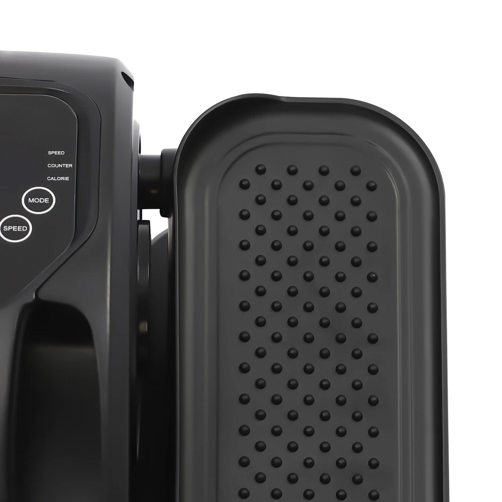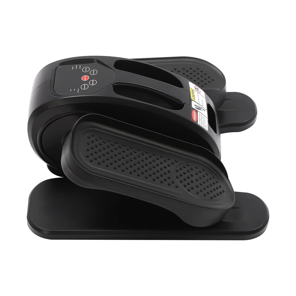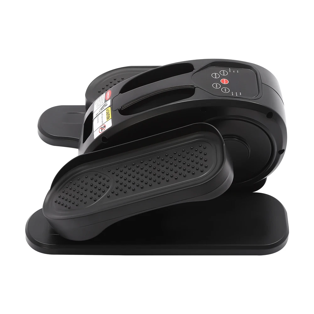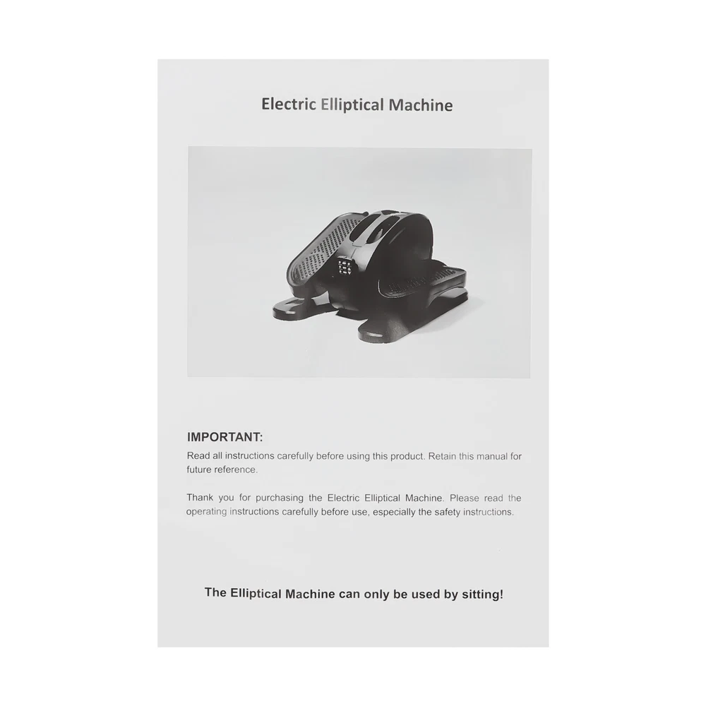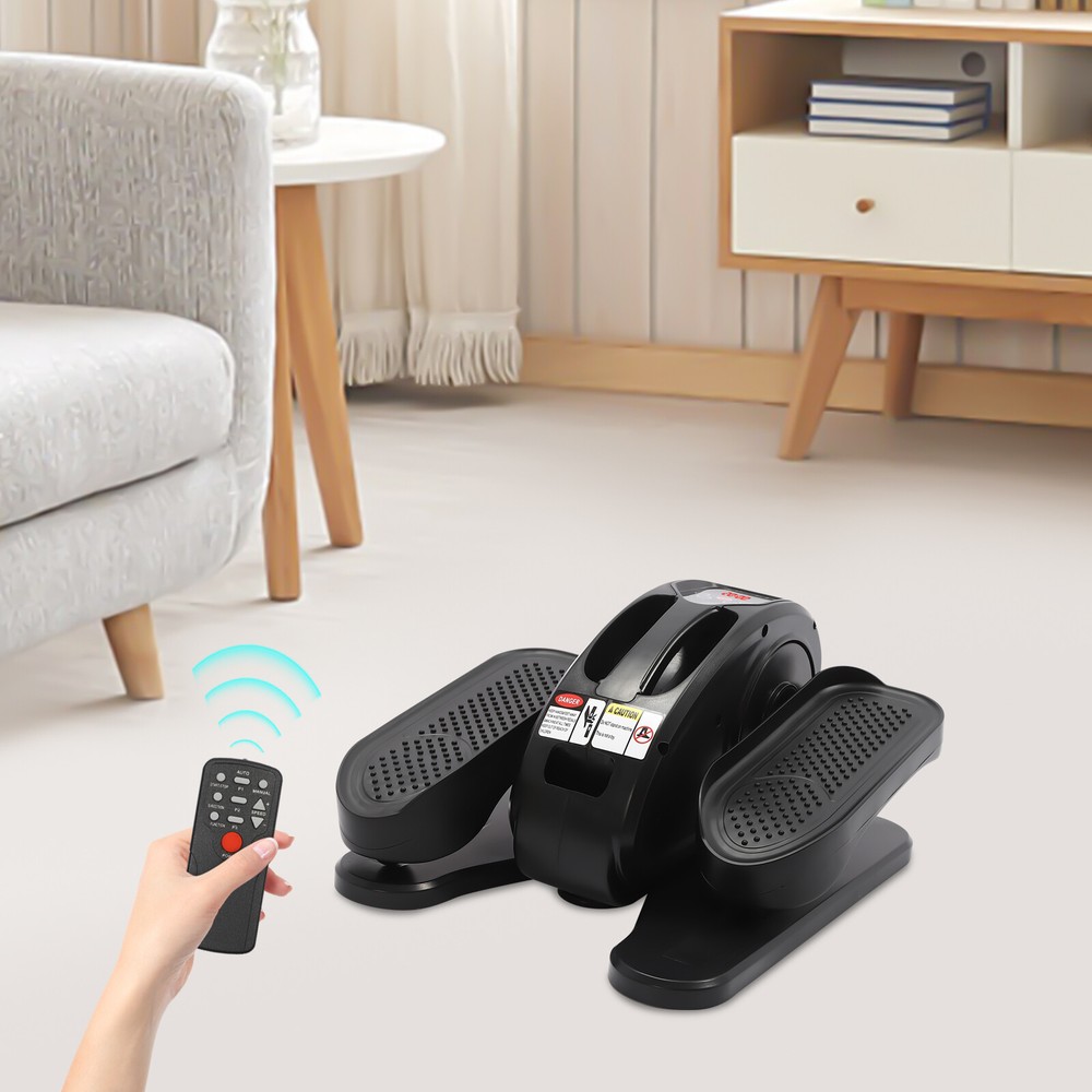 Electric Seated Leg Pedal Exerciser Under Desk Elliptical Machine w/ Remote Home Description Join us now with this mini under desk electric elliptical machine that combines technology, aesthetics, and practicality. It is suitable to be placed in your office or home to exercise your legs at any time. 5-speed adjustments and auto mode (P1, P2, P3) can meet your workout needs. The LED screen displays the calories you have burned in real time. The remote control and button adjustment are greatly convenient for your use. With this product, you can enjoy a more pleasant exercise experience. Specification Material: Steel, ABS, Copper Moter Type: All-copper Motor Color: Black Assembly Required: No Mount Type: Floor Standing Control Method: Remote Control, Button Screen Type: LED Power Source: Corded Electric Plug Type: US Standard Remote Control Battery: 2*AAA Batteries(Not Included) Power: 50W Voltage: 110-220V Manual Mode Adjustable Speeds: 5 Gears Auto Mode: P1, P2, P3 Overall Load-bearing Capacity: 25kg/55.1 lbs Remote Control Distance: About 1m/3.3ft Power Cord Length: About 1.85m/6.07ft Product Size: 44*36*22cm/17*14*8.66 in Package Size: 48.5*42*28cm/19.09*16.54*11.02in Gross Weight: 7.5kg/16.5 lbs Package Included 1* Under Desk Electric Elliptical Machine 1* Power Cord 1* Remote Control 1* English Manual Key Features Durable Upgrade: It is made of high-quality steel and ABS, making it not easy to rust and deform, ensuring durability and safety. It is the ideal choice for your long-term fitness partner. Excellent Performance: It is equipped with a high-quality all-copper motor and a steel flywheel to ensure efficient operation and stable performance. High Stability: The widened base with four non-slip foot pads makes it able to withstand a weight of 55.12 lbs, making it suitable for most people without tipping over. Thoughtful Design: There is a remote control compartment on the product for your convenience. Without an exposed crank, this product is safer and you can use it with confidence. Five-speed Regulation: Equipped with 5 manual speed adjustments, whether beginners or fitness enthusiasts, they can easily find the appropriate exercise intensity to meet the training needs of different stages. Scientific Training: The built-in intelligent preset program (P1, P2, P3) is designed according to scientific fitness principles, allows you to enjoy customized training plans without the need for planning, allowing professional guidance to accompany you. Helpful to Body: Oversized anti-slip pedals with many protrusions are designed for effective workouts and foot massages, intensifying stimulation of the soles of the feet, promoting blood circulation, and improving cardiovascular health. This machine lets you burn calories, lose weight, and improve mobility without applying too much pressure on your joints. Space-saving: The mini body (17*14*8.66in) takes up little space, making it ideal for office, or small apartments, and allowing you to easily store this product under your desk or in a storage room. Quiet Operation: It adopts advanced noise reduction technology. Whether in the morning or at night, it does not disturb family and neighbors, enjoying unrestricted exercise time. Multiple Functions: In addition to exercising leg muscles, you can place your palms or elbows on top to exercise your upper limbs, which is versatile and very affordable. Smart Life: High-definition LED screen can display distance, calories, speed, and time. You can adjust the start/stop, function, direction, speed, mode, and on/off by using the remote control or buttons on the screen. You can do the foot exercise when you are working, reading, watching TV, or even teleconferencing. Ideal Gift: With a beautiful appearance and practical function, it is an excellent Christmas, Thanksgiving, or birthday gift for your friends or the elderly who need to do recovery exercises. Ready to Use: This product is already assembled, so you just need to connect it to the power supply to use it without installation. Customer Service: We aim to provide quality products and services. If you have any problems, please feel free to contact us. We will reply and solve the problem for you as soon as possible. Details Remote Control: It allows for easy operation without bending down to press buttons. Convenient Carrying Handle: It can facilitate you to move the machine at any time. Smooth Edges: The smooth and burr-free edges enhance the beauty of the product and better care for your skin. Long Power Cord: Approx. 6.07ft power cord supports more flexible charging range. Moreover, it can be disassembled and plugged in as needed to ensure safe use. Application It is suitable for homes, gyms, hospitals, rehabilitation centers, nursing homes, hotels, schools, offices, and other occasions. It is ideal for the recovery of leg muscle strength, balance, and coordination in the elderly or patients, as well as daily exercise in young people. Notes Please check the plug and color before purchasing. The remote control does not include the batteries. You need to prepare 2 AAA batteries yourself. It is normal for the product to generate heat during use, please do not touch it after long-term use. Please read the instruction manual completely before installation and use, and pay particular attention to the safety instructions included. Please note that the maximum weight capacity of this product is 55.1 lbs. It is designed for seated use only, so please do not directly step on the whole. Please use the product after it has been energized. Please allow the slight color difference caused by the shooting light and 1-3cm error due to manual measurement and make sure you do not mind before ordering.