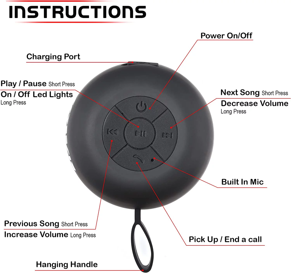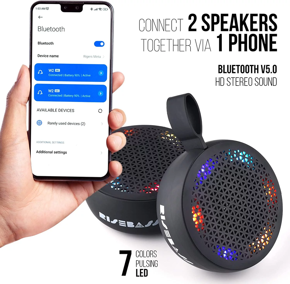 Boost and listen to that playlist you love all day: This portable Bluetooth speaker is sure to set the mood wherever you go! Our tiny Bluetooth speaker delivers a powerful sound without the need for an expensive bulky stereo. This compact yet reliable speaker provides high-definition quality stereo sounds without having to spend too much. Even with its small size, this Bluetooth radio speaker can achieve party-like audio without the hassle of lugging around massive speakers. Portable Bluetooth waterproof speakers Features multicolored ambient LED lights Equipped with long-life lithium-ion battery Compatible with any Bluetooth electronic devices from Apple, Android, and others Features hands-free built-in microphone for calls Let the music take you away with the RiseBass Portable Waterproof Mini Bluetooth Speakers: Our waterproof speaker boasts a tough build made from sturdy materials. This lightweight Bluetooth shower speaker is the perfect sound system for on-the-go shower radio in the morning. You can also take this waterproof Bluetooth speaker to the beach, gym, park, workstation, home, garden, and more Our Bluetooth speaker rocks the latest Bluetooth technology and pairs easily with any electronic device in seconds. This mini Bluetooth speaker can be used conveniently for conferences, classes, and outdoor parties No more interrupted music playing with the long battery life of this portable speaker. Get ready to sing your heart out in bubbles with this loud shower speaker. Enjoy the freedom of wireless connectivity and embrace the convenience that this bathroom speaker provides Feel that beat with the RiseBass Portable Waterproof Mini Bluetooth Speakers order yours today