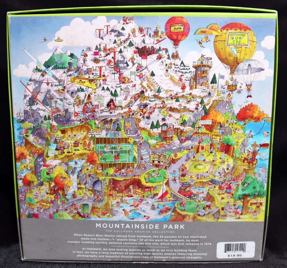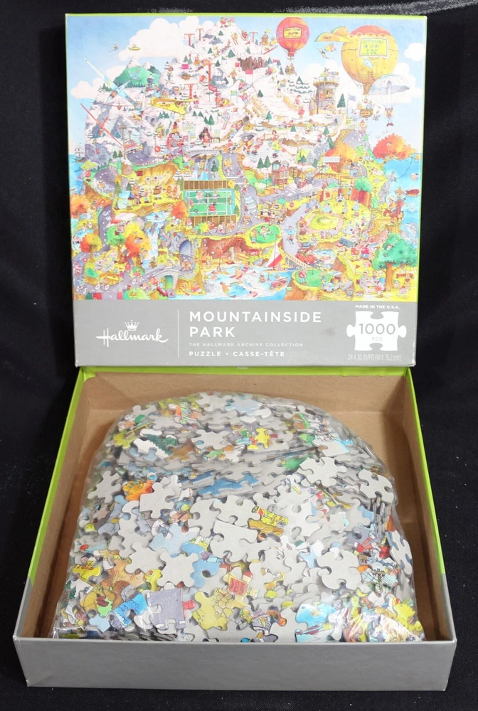 Enjoy the challenge of piecing together this beautiful 1000 piece Mountainside Park jigsaw puzzle from Hallmark's archive collection. The puzzle features a whimsical outdoor activity theme with vibrant multi-color puzzle pieces made of high-quality cardboard material. The puzzle is complete and bagged for easy storage, making it the perfect addition to any puzzle enthusiast's collection. This puzzle is recommended for ages 10 and up and was made in the United States. The puzzle measures 24" x 30" once assembled and is perfect for anyone who loves outdoor activities and puzzle challenges. Add this contemporary puzzle to your collection today! Doing puzzles has some hidden benefits Excellent qualities: Cultivate concentration, patience, and temper your will Movement development: Train hand-eye coordination and precise small movements Spatial intelligence: Improve visual discrimination of colors and shapes Critical thinking ability: Understand the relationship between parts and the whole, and draw inferences from one example to explore the future Relaxes your mind: Relieve work pressure and release yourself Brain development: Enhance memory and may help prevent or slow brain degeneration Anticipated Benefits of Puzzles for Children Overcoming attention deficit Strengthening visual memory Improving problem-solving skills Strengthening hand-eye coordination Improve fine motor skills Improve gross motor skills Shape recognition ability Gain the ability to set goals Learning patience Puzzle pieces are all bagged. Each item we ship is carefully packaged to prevent any damage and is shipped immediately with tracking.