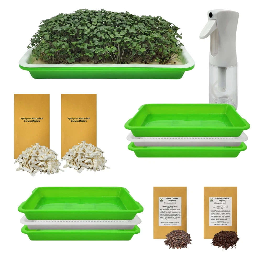 Transform your kitchen or office space into a thriving garden with ’s Complete Home Microgreens Kit. Specially designed for healthy foods enthusiasts and environmentalists alike, our kit provides everything you need for a productive indoor garden whether you live in a cozy apartment or have space to spare. Healthy, organic microgreens can be at your fingertips in a little more than a week. Our kit is fully equipped with two versatile tray sets for separate plantings, a premium spray mister, 2 pre-measured packages of hydroponic mat confetti growing medium, and two varieties of organic seeds. The detailed instruction sheet ensures you will have a satisfying experience whether you are a seasoned gardener or a beginner. Embrace the joy of growing your own food and join the movement toward sustainable, healthy living with ’s Complete Home Microgreens Kit. COMPLETE MICROGREENS KIT: This all-inclusive home microgreens kit features 2 sets of growing trays (8.8” x 5.5”), a premium spray mister bottle, 2 packages of pre-measured hydroponic mat confetti growing medium, 2 packs of organic seeds sourced in USA, and a detailed instruction sheet that ensures you will have a satisfying experience whether you are a seasoned gardener or a beginner. HYDROPONIC MAT CONFETTI GROWING MEDIUM: Each kit comes with two pkgs of hydroponic mat confetti (also known as micromat hydroponic confetti) as your growing medium. Easy to set up and maintain. Pre-measured for optimal microgreens growing success and consistent results. Refills available separately. ORGANIC SEEDS LEAD TO NUTRITIOUS GREENS: Your kit includes 2 pre-measured packages of organic seeds, 1 radish and 1 broccoli. Grow them in separate trays to produce two plantings of delicious microgreens packed with nutrients and flavor. Refills available separately. USE IN ALL TYPES OF LIVING SPACES: Convenient tray size works well in virtually any environment, including small urban apartments and offices. No experience needed to successfully grow your own microgreens. Great starter kit has everything you need. SUPPORTS SUSTAINABLE LIVING: Embrace the sustainable living movement with this kit’s reusable growing trays, recyclable bags and growing medium. is dedicated to promoting a healthier present for our families and a sustainable future for the planet.
