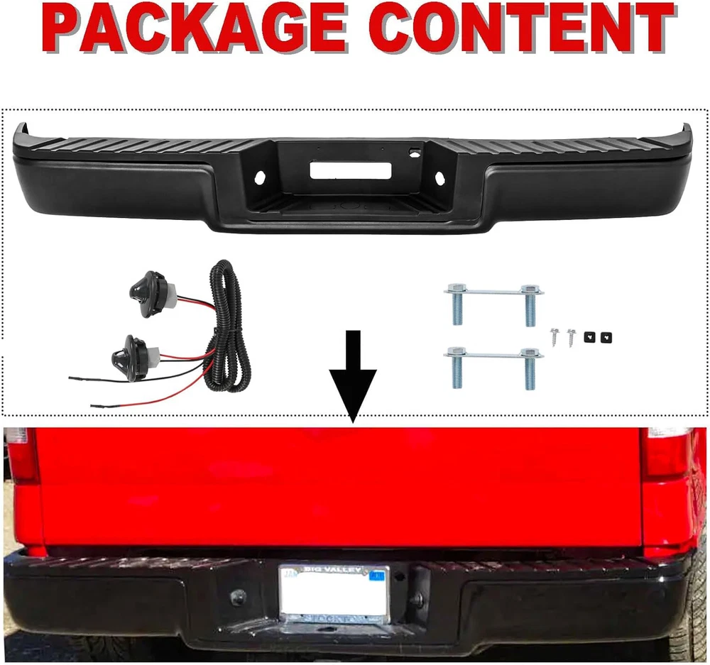 Rear Bumper Step Bumper Assembly Compatible with for 2006 2007 2008 Ford F150 W/O SENSOR Hole Carbon Steel,Texure Black Product Description About this item Compatible with: 2006 2007 2008 Ford F150 Pick Up Truck Attention: For Models WITHOUT Park Assist Sensor Hole. Package Include: Rear Bumper Face Bar & Step Pad and License Plate Lights, Bolt Kit High quality. The rear bumper is constructed of durable chromed carbon steel with a chromed finish for excellent wear and corrosion resistance to extend its life. Easy installation. All mounting hardware is included in the bumper kit; bolts directly on, and no modification or drilling is required. Bring the well protection to your vehicle. Notes: Confirm compatibility with your vehicle before purchase. Professional installation is strongly recommended. Allow slight color and measurement variations due to photography and manual handling. For any inquiries, contact us for prompt assistance. Payment Delivery Details Return Feedback Contact us Payment We accept payment by any of the following methods: Delivery Details Shipping Time Your item will ship within 3 days (Mon-Fri) of your cleared payment. Items will be shipped to the shipping address you specify via Paypal only. We are NOT able to change the shipping address once payment has been made. A tracking number will be provided once your item has shipped. Domestic Buyers No shipping to PO BOX and APO addresses. No shipping to PR, AK, HI. International Buyers International buyers please note: Import duties, taxes and charges are not included in the item price or shipping charges. These charges are the buyer's responsibility. Please check with your country's customs office to determine what these additional costs will be prior to bidding/buying. Return All returns must have RMA number. Returns with no RMA number will be avoided! 1. Changed your mind and don't want the item anymore? We back our products with a 30-DAY SATISFACTION GUARANTEE! (Item must be in the original condition as it was received. 30 Days Refund, 30 Day Replacement.). Brand New items will have 30 days warranty or replacement policy. 2. Restocking fees will be charged ONLY on Brand New items. 3. Defective/Dead items will be fully refunded or replaced after matching the serial number with the one in our records. 4. Mobile phones and tablets MUST be restored to factory setting. 5. If your order arrives incorrect or the package is damaged in result of a carrier company, you must notify us within 4 days of receipt. Defective items will be credited only after matching the serial number with the one in our records. We are aware of all fraud cases and have all the items details in our records. 6. If there is a quality issue or malfunction with the product, we strongly suggest you to contact the original manufacturer. 7. Any item needed to be returned must be securely packaged, insured and shipped with tracking for safety. We cannot be responsible for lost damaged packages. We carefully inspect returned items upon receipt before any possible refunds, credits, or exchanges. Feedback Customer satisfaction is our top priority. Please give us a chance to resolve any issues before posting a feedback. If you have any problem with your order, please contact us and we will do our best to make you satisfied. Contact us Business Hours: Monday - Friday : 9:30AM – 5:30PM Eastern Standard Time. Saturday, Sunday Closed. For any questions or concerns, please feel free to contact us!