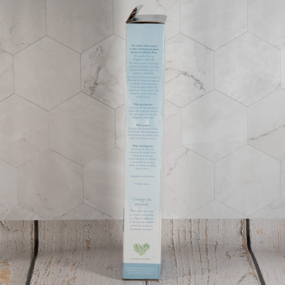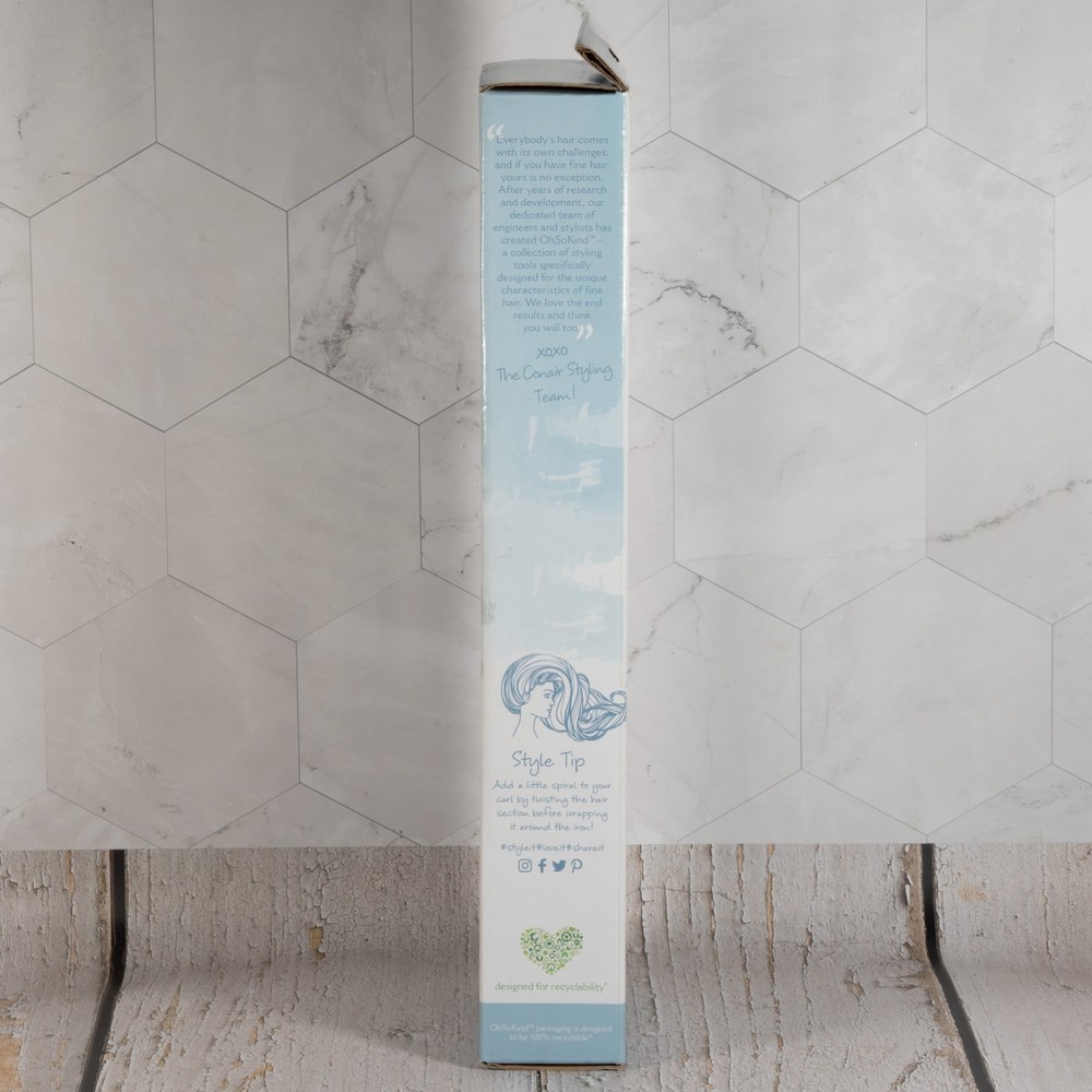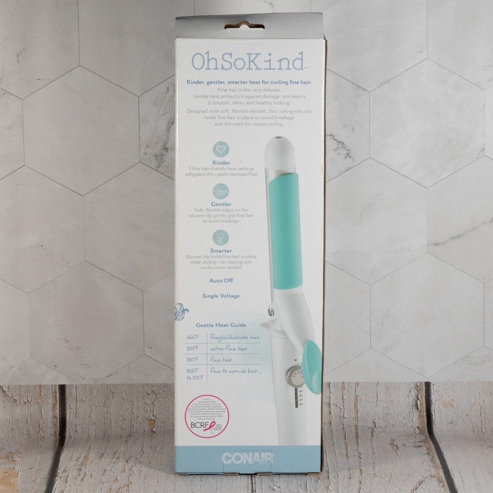 Add shine to your curls with the Conair Oh-So-Kind 1" Silicon Clip Curling Iron. This curling iron is designed with soft flexible edges to help reduce breakage, and it has a silicone clip to keep hair in place. 5 fine hair-friendly heat settings help safeguard thin, easily damaged hair. Heat ranges from 266°F to 375°F. Soft flexible edges reduce breakage. Silicone clip holds hair in place to prevent slippage. Automatic shutoff.