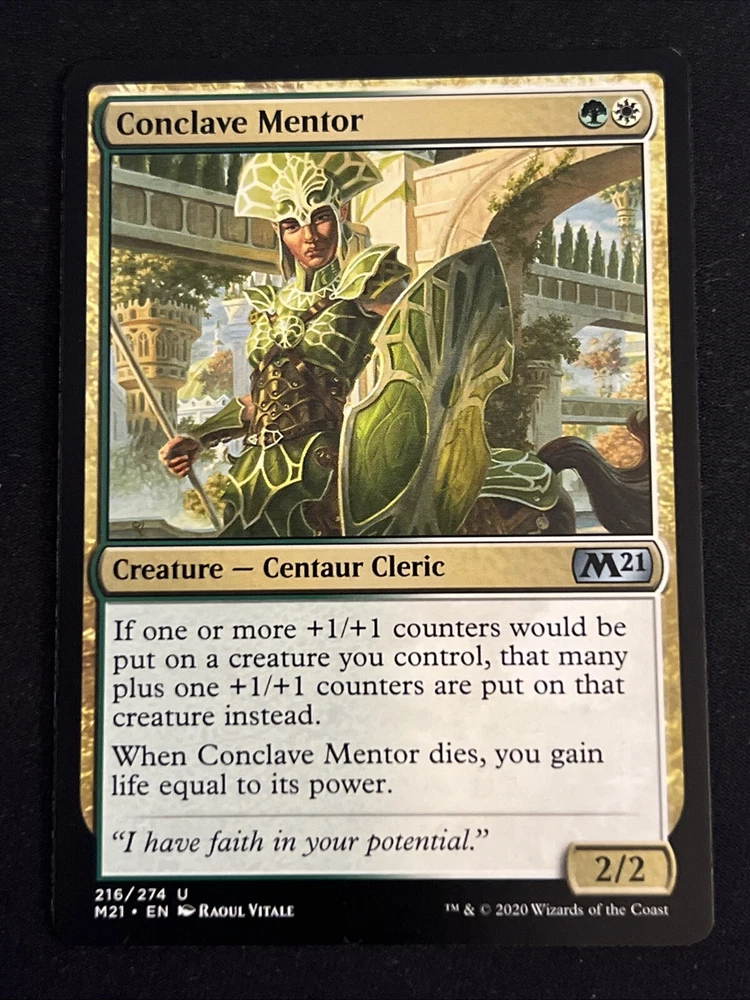 Language:EnglishSet:Core Set 2021Defense/Toughness:2Attribute/MTG:Color:White, Greenbrand:Wizards of the CoastIllustrator:Raoul VitaleFinish:RegularRarity:UncommonAdditional Description:Conclave MentorGame:Magic: The GatheringCard Name:Conclave MentorCreature/Monster Type:Cleric, CentaurCard Text:If one or more +1/+1 counters would be put on a creature you control, that many plus one +1/+1 counters are put on that creature instead.
