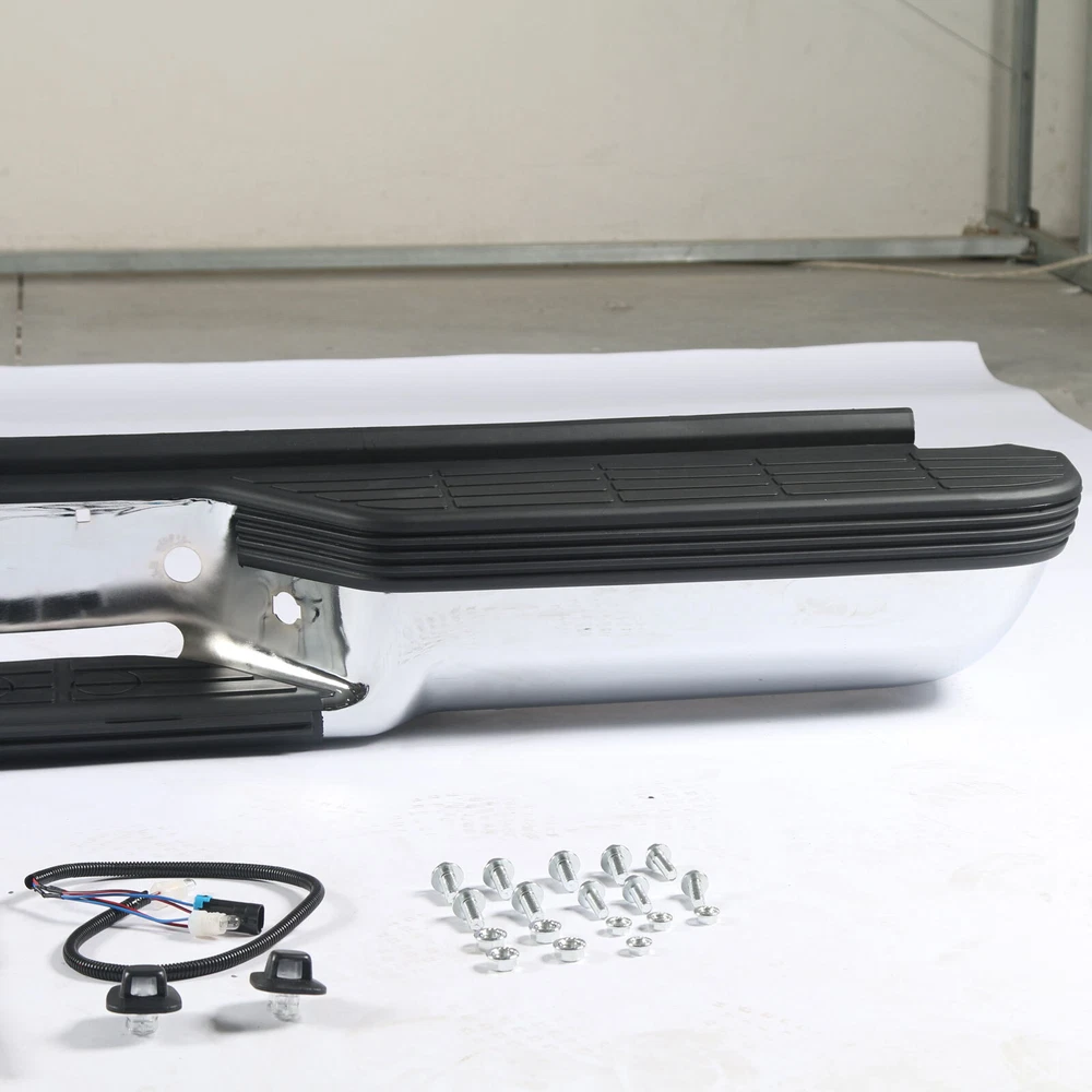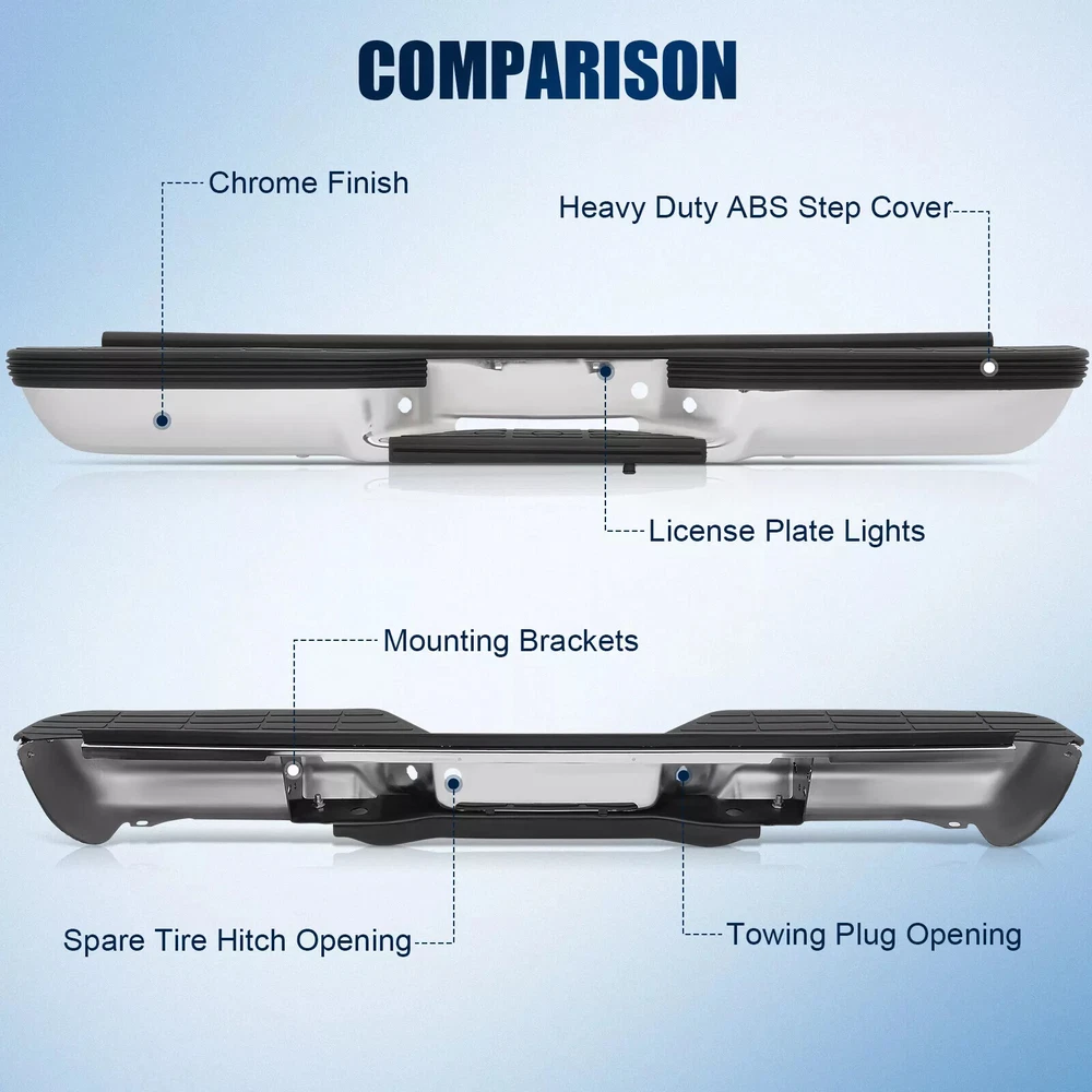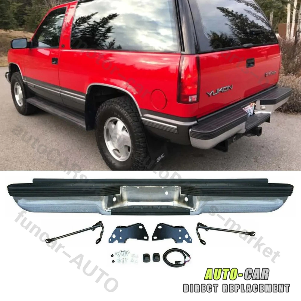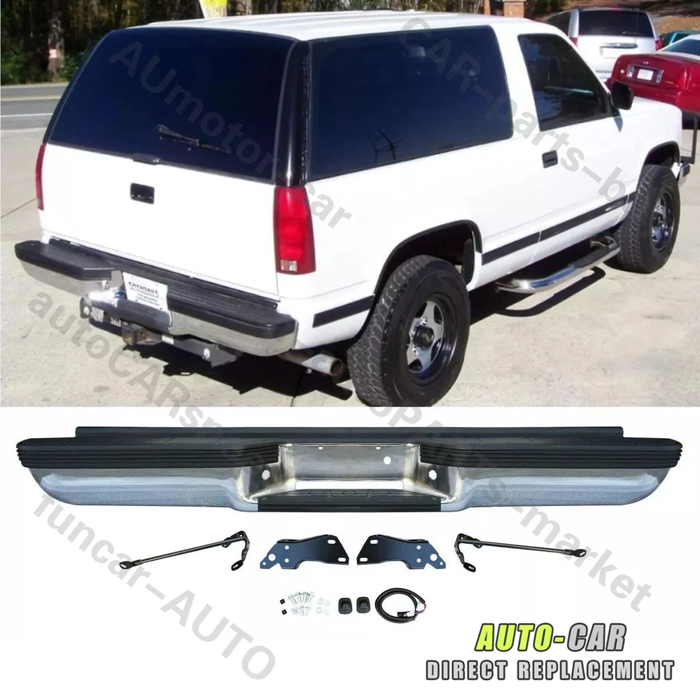 Compatible With: - For 1993 - 1999 Chevy Suburban 1500/Tahoe - For 1993 - 1999 GMC Yukon/Suburban Type:Rear Bumper Color:Silver Finish:Chrome Material:Steel Fitment Type:Direct Replacement Hardware Included:Yes Includes:- 1×Rear Bumper - 1×Pair of License Plate Light - 2×Brackets - 1×Bag of Bolts On Jun 13, 2024 at 20:21:12 PDT, seller added the following information: On Jun 15, 2024 at 14:03:58 PDT, seller added the following information: On Dec 3, 2024 at 12:35:32 PST, seller added the following information: