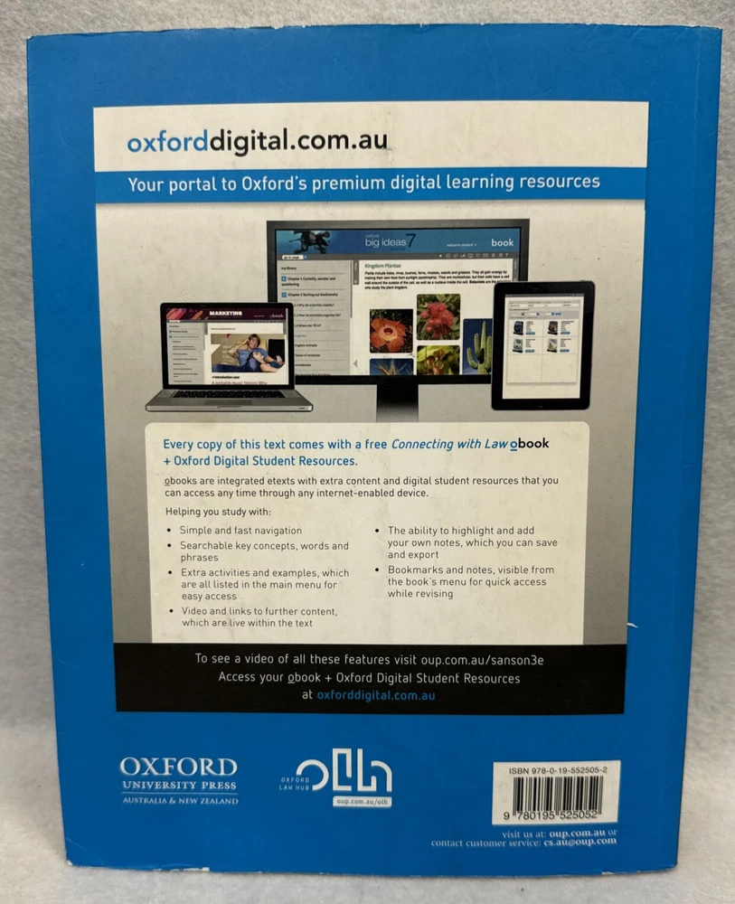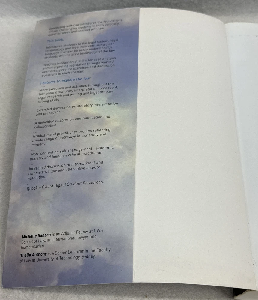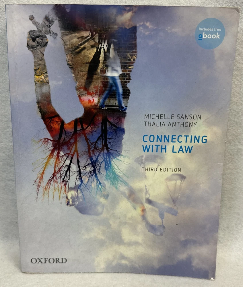 Dive into the world of legal studies with the third edition of "Connecting with Law" by Michelle Sanson and Thalia Anthony. Published by Oxford University Press Australia in 2014, this comprehensive textbook is an indispensable resource for undergraduate students seeking to deepen their understanding of the subject. Spanning 680 pages, the book covers a range of legal topics and is presented in clear, accessible English. The paperback format measures 246 mm in height and 190 mm in width, making it both a convenient and effective study aid. The book's ISBN is 9780190304522, ensuring you receive the exact edition required for your academic pursuits. Whether for classroom learning or independent study, this textbook is a valuable addition to any law student's library. Some wear & tear Some marks