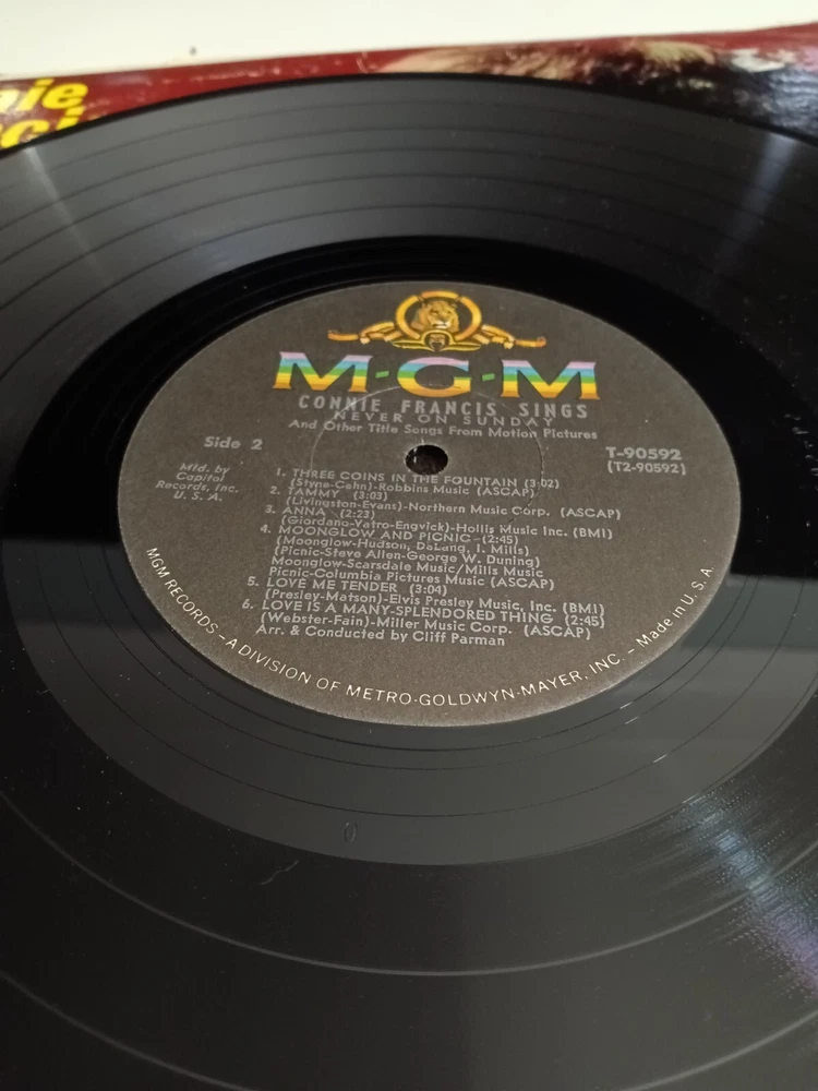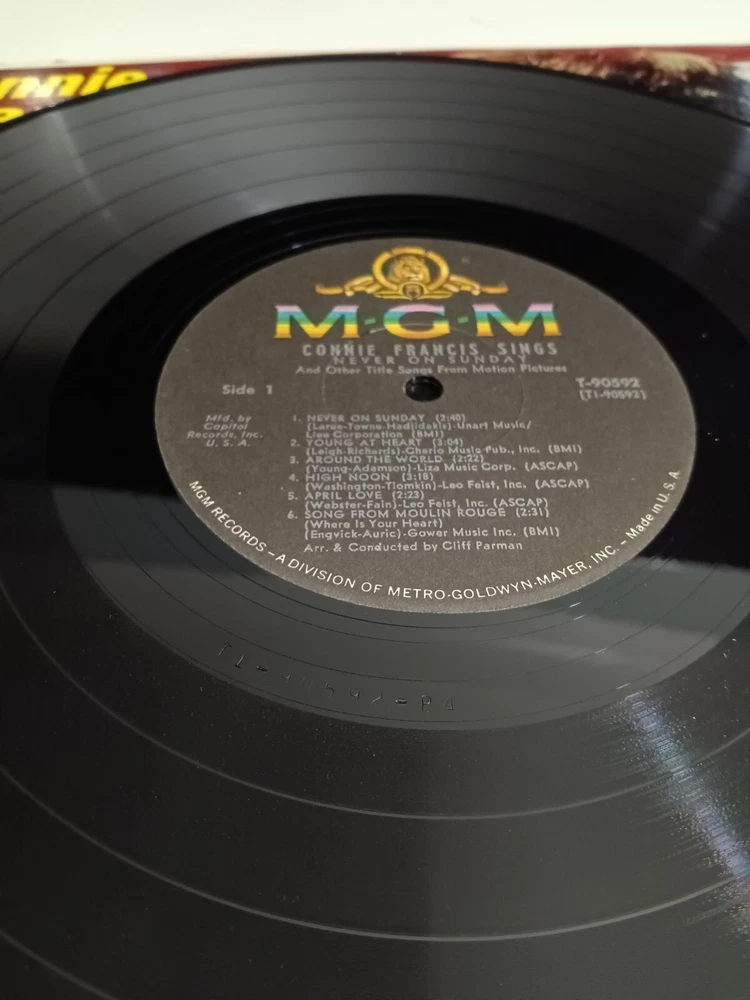 Seller Notes:“plays well and looks good”Type:LPRecord Size:12"Country/Region of Manufacture:United StatesRecord Grading:Very Good Plus (VG+)gtin13:Does not applyRecord Label:MGM RecordsFeatures:Original Inner SleeveRelease Year:1961Modified Item:NoFormat:RecordCatalog Number:t 90592Occasion:Birthday, Carnival, Christmas, Fourth of July, HalloweenRelease Title:Sings Never On SundayStyle:VocalSleeve Grading:Very Good (VG)Number of Audio Channels:StereoRun Time:lpCustom Bundle:NoSpeed:33 RPMInstrument:RecorderFidelity Level:High-FidelityCase Type:Cardboard SleeveUPC:Does not applyGenre:PopLanguage:EnglishEra:1960sMaterial:VinylArtist:Connie FrancisEdition:Special EditionColor:Multicolor