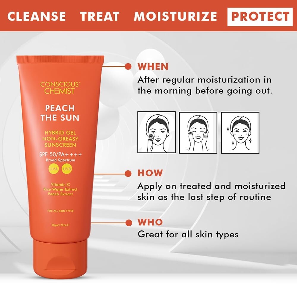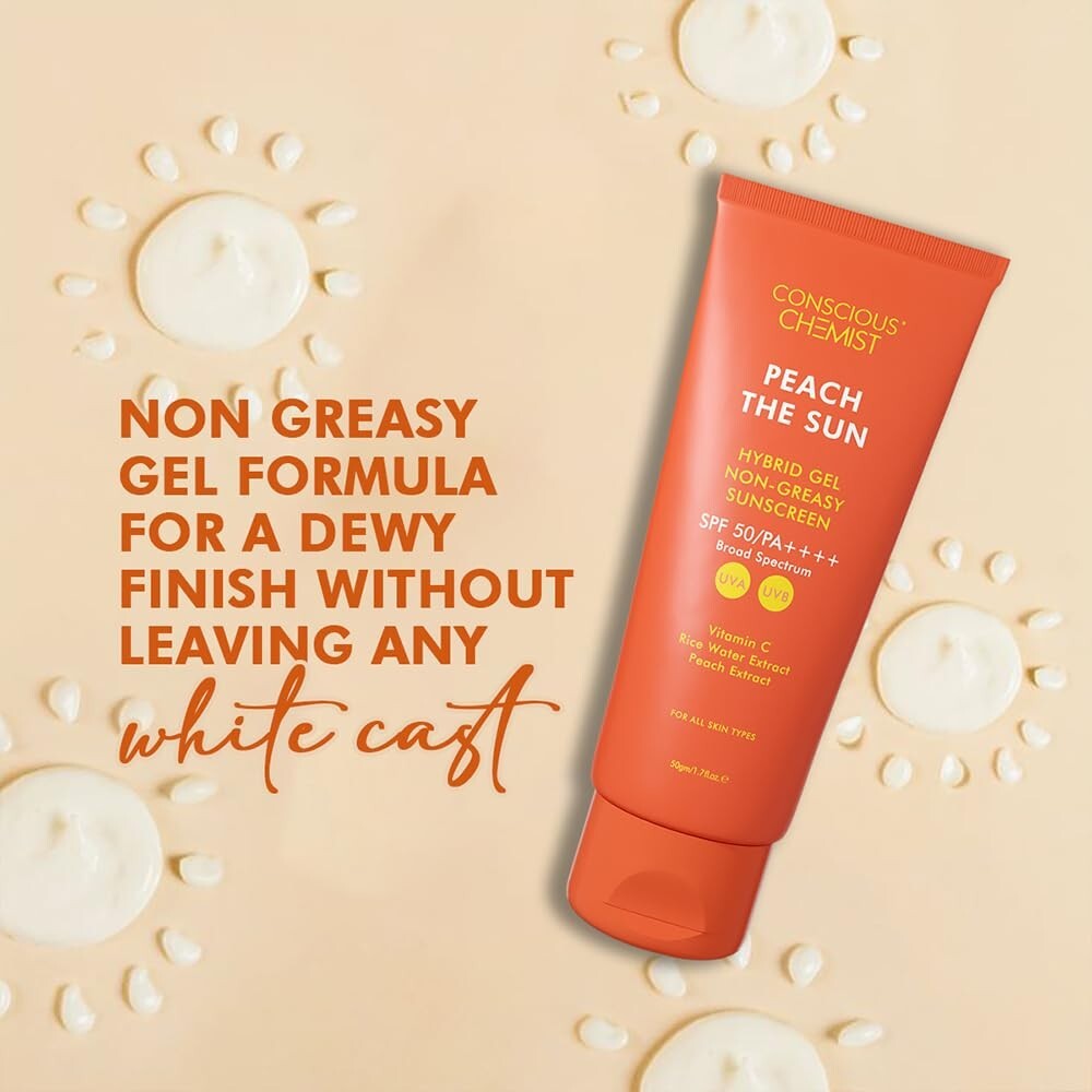 About this item PROTECTIVE SUNSCREEN : Our sunscreen offers gentle sun protection suitable for sensitive skin, safeguarding against harmful UV rays without irritation. COMPREHENSIVE SUN PROTECTION : Shield your skin from sunburns, aging, hyperpigmentation, and uneven skin tones with our sunscreen, an essential addition to every skincare routine for comprehensive sun protection with a hydrating touch. IMPROVE SKIN'S MOISTURE RETENTION : Experience long-lasting hydration as our sunscreen enhances your skin's ability to retain moisture, leaving it soft and supple. PLEASANT SCENT : Light peach fragrance adds a subtle touch of freshness to this sun protection cream that blends easily and absorbs quickly. DOUBLE SHIELD PROTECTION : Milk thistle extract and peach extracts provide a double shield against free radicals and pollutants, offering top-notch UVA and UVB protection. APPLICATION INSTRUCTION : Apply at least 15 minutes before sun exposure and reapply every 2 hours for optimal protection. Safety Information: For external use only. Avoid eye contact. Ingredients: Aqua, Titanium Dioxide, Ethylhexyl Methoxycinnamate, Butyl Methoxydibenzoylmethane, Octocrylene , 1,3, Butylene Glycol , Lecithin , Ceramide Np, Phospholipids, Aluminium Hydroxide, Stearic Acid, Helianthus Annuus (Sunflower) Seed Oil, Oryza Sativa (Rice) Extract, Sodium Polyacrylate, Xylitol,Prunus Persica (peach) Fruit Extract, Ethyl Ascorbic Acid, Sodium Lauroyl Lactylate, Glyceryl Stearate, Sodium Hyaluronate, D-alpha Tocopherol Acetate, C12 C15 Alkyl Benzoate, Sorbitol, Sodium Levulinate and Potassium Sorbate, Fragrance, CI 15510 Directions: This daily high protection sunscreen protects you from UVA & UVB radiations. Apply as the last step of your daytime routine at least 15 minutes before going outside. Reapply as needed. Use 3 finger length amount of sunscreen and spread evenly on your face and neck. From the brand Previous page We are not chemical-free, we are Conscious Chemist. We understand that Chemical and Natural are not contradictory but harmonious. We aim to give the best of skincare, that science has to offer. Calling something chemical-free is baffling, after all from what we understand, life is chemistry. We dive deep into research materials, beauty communities and consult with experts, to bring out the most safe, botanical & potent actives which show results. Try Our Most Loved Products Broad Spectrum Sunscreens Gear up to face the sun with our barrier boosting & lightweight range of sunscreens that protects skin from the harmful UVA & UVB rays. Next pag