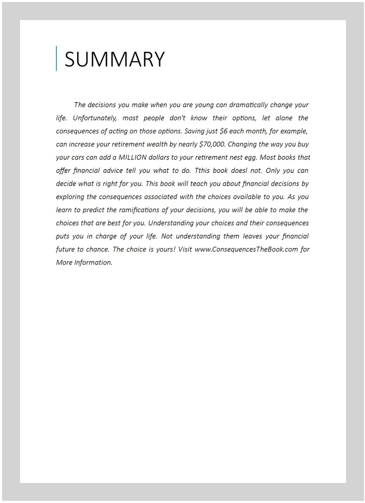 Consequences : A Unique Approach to Financial Planning for Young Adults, Paperback by Blankenship, John, ISBN 1438212445, ISBN-13 9781438212449, Brand New, Free shipping in the US The decisions you make when you are young can dramatically change your life. Unfortunately, most people don't know their options, let alone the consequences of acting on those options. Saving just $6 each month, for example, can increase your retirement wealth by nearly $70,000. Changing the way you buy your cars can add a MILLION dollars to your retirement nest egg. Most books that offer financial advice tell you what to do. Tthis book doesl not. Only you can decide what is right for you. This book will teach you about financial decisions by exploring the consequences associated with the choices available to you. As you learn to predict the ramifications of your decisions, you will be able to make the choices that are best for you. Understanding your choices and their consequences puts you in charge of your life. Not understanding them leaves your financial future to chance. The choice is yours! Visit for More Information.