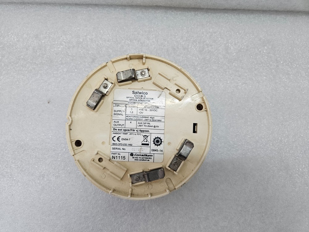 USED | CONSILIUM SALWICO DOS3 OPTICAL SMOKE DETECTOR N1115 The CONSILIUM SALWICO DOS3 Optical Smoke Detector N1115 is a smoke detector manufactured by CONSILIUM. It is designed for fire alarms and fire protection in industrial and commercial settings. This model uses optical technology to detect smoke particles in the air, providing an early warning system for potential fires.
