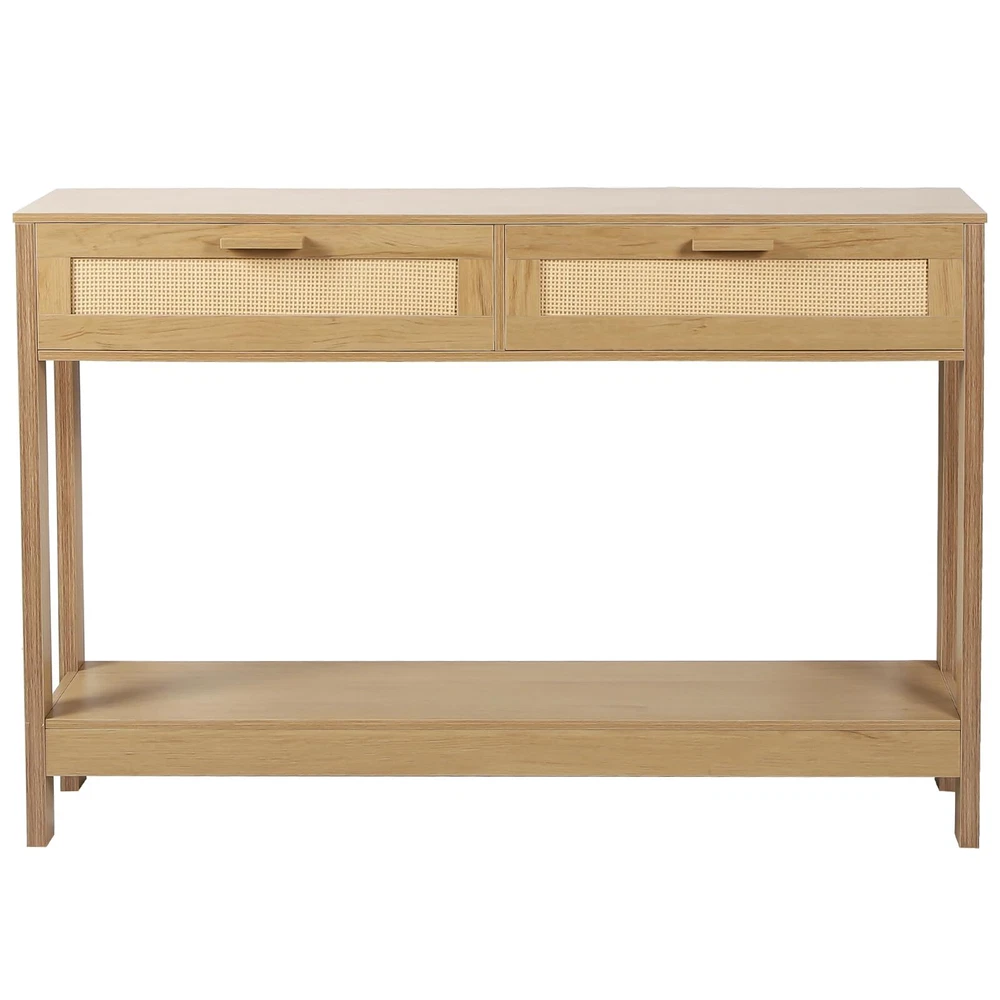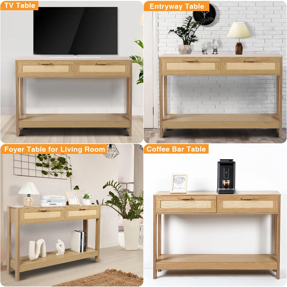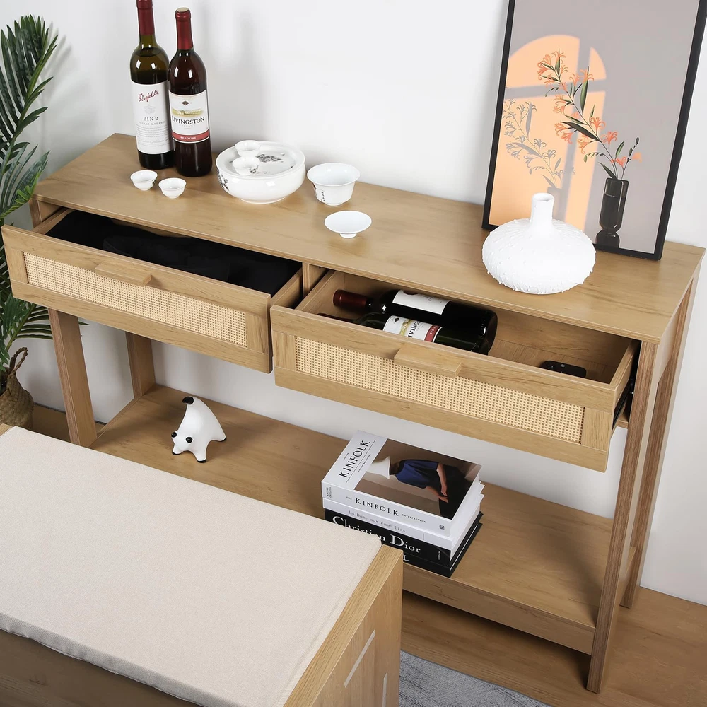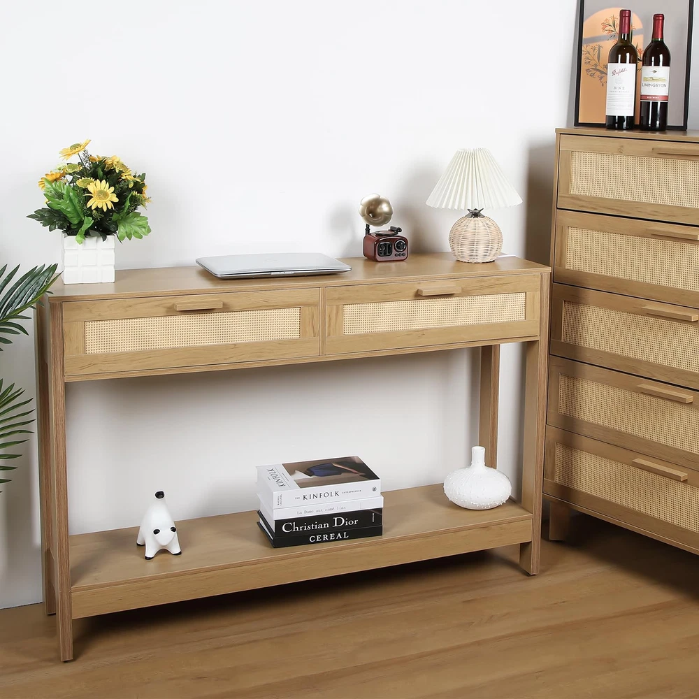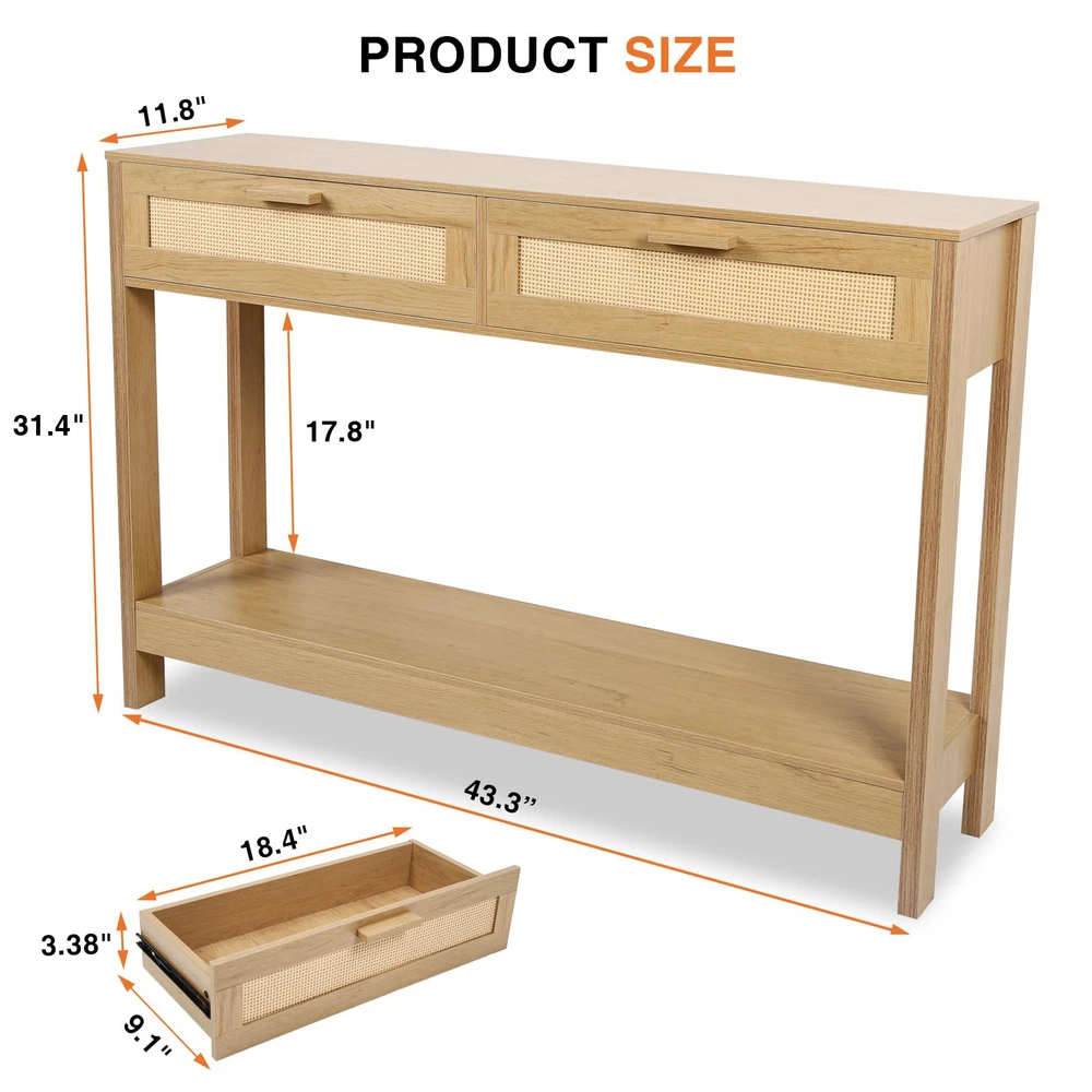 Designed with engineered wood wood grain and rattan-decorated drawers, has a clear texture. The classic design blends well with any style of decor, adding a sense of elegance to your room. Sized at 11.8"D x 43.3"W x 31.5"H [Storage Aplenty] This entryway table features 2 spacious drawers and a 2-tier storage shelf, used for storing and organizing your items. Make your desktop neater. Bouquets, scents candles, photos, books, or other items, everything has a suitable place to display. [Built to Last] Sturdy wooden material enhance safety and stability, making it last for long-time use. The back of the table has anti-toppling fittings to keep the console table stable. The Anti-Slip& mute sticker design at the bottom of the table corner protects the floor and prevents the table from tilting. [Versatile Uses] This hallway table works great as a console table, sofa table, entry table, small TV table, and coffee bar table. The appropriate size makes this entry table perfect for the living room, bedroom, dining room, foyer, balcony, office, and so on. Saving a lot of space for your living space. [Satisfaction Service] This entry table comes with all the accessories and instructions for quick setup. Please feel free to contact us with any questions and we will reply within 24 hours. For safety, be sure to secure the dresser to the wall with the included anti-tip kit. - There may be a smell of ""new"" when first opening the package; please air the dresser out in a well-ventilated place for a few hours."