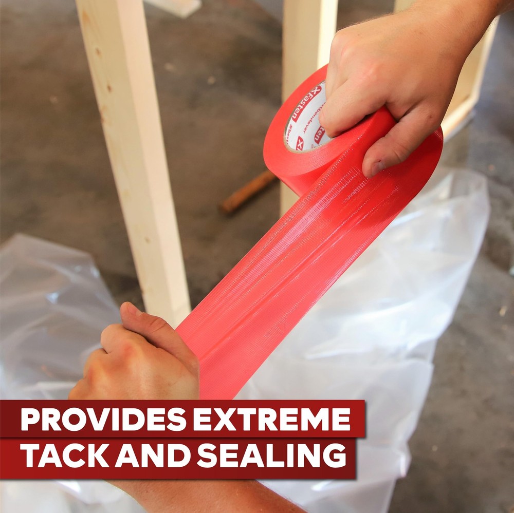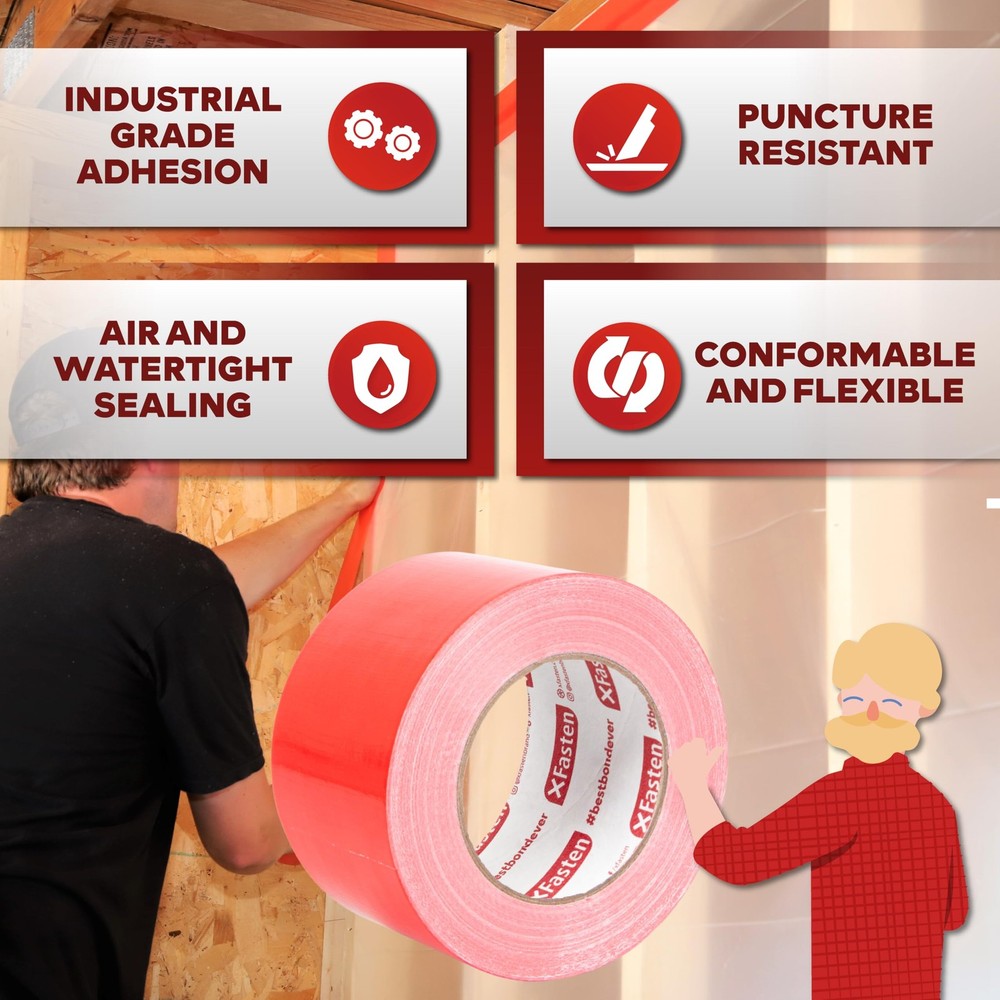 The Red Seaming Tape is a heavy-duty and all-weather construction tape built to last and withstands high humidity and extreme temperature (-4°F to 203°F). It sticks to all building material types- foam insulating boards, polyethylene sheets, house wrap, vapor barrier sheet, tile, wood, ceramic, concrete, roofing materials, and even epoxy resin. Why Choose the Red Construction Sheathing Tape? ● BUILT TO LAST. With a puncture and abrasion-resistant body, curling, and lengthwise-splitting resistant fiberglass backing, and weatherproof adhesion, the Red Construction Seaming Tape is designed to take a beating without falling off and maintaining its sealing properties to your vapor barrier sheets. ● MADE FOR BEGINNERS, FOR PROFESSIONAL PROJECTS. Say goodbye to clunky house wrap tapes that are difficult and messy to apply. Its non-stick outer layer prevents epoxy resin from sticking, making it a formidable epoxy resin tape. This tape produces neat and professional-looking finishes on crawlspace and vapor barrier film seams and joints. ● DOES NOT SPLIT AND BREAK UNNECESSARILY. Many red construction sheathing tapes on the market are too thin to the point that they often split lengthwise. When this happens, you will go through the hassle of slowly and meticulously working through the split tape until you get an unsplit piece, cut the end off, and only then can you resume your work. We solved this by incorporating a fiberglass middle-layer on the tape, allowing for optimal thickness while preventing the tape from splitting, breaking, or curling midroll. ● EASY TO PEEL AND STICK FOR FASTER APPLICATION. Best used by professionals and contractors as our tape is equipped with a quick-release adhesive backing, which allows for faster peeling and sticking- such that you can save time and instead focus on more crucial tasks. Durable and weather-resistant: Construction seaming tape is designed to withstand harsh weather conditions, making it an ideal choice for sealing seams and joints in building envelopes, roofs, and other construction applications. Its durable and weather-resistant properties ensure long-lasting protection against moisture, wind, and dust. Easy to apply: Construction seaming tape is easy to apply thanks to its pressure-sensitive adhesive that bonds quickly and securely to various surfaces, including concrete, wood, metal, and plastic. It can be applied by hand or automated dispensing equipment, saving time and labor costs. Versatile: Construction seaming tape suits various applications, from small repairs to large-scale construction projects. It can also be used on various substrates, such as vapor barriers, insulation, and ductwork. Cost-effective: Construction seaming tape is a cost-effective solution for sealing seams and joints in construction applications compared to other sealing methods. It requires minimal preparation and cleanup, making it a quick and easy solution that saves time and money. Compliant with industry standards: Construction seaming tape is designed and tested to meet industry standards for performance and durability, ensuring that it meets the strict requirements of building codes and regulations. It is an important component of building envelopes and air barrier systems, helping to achieve energy efficiency and sustainable building practices.