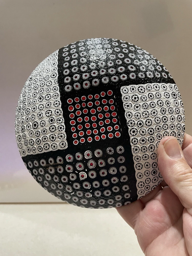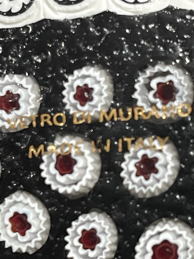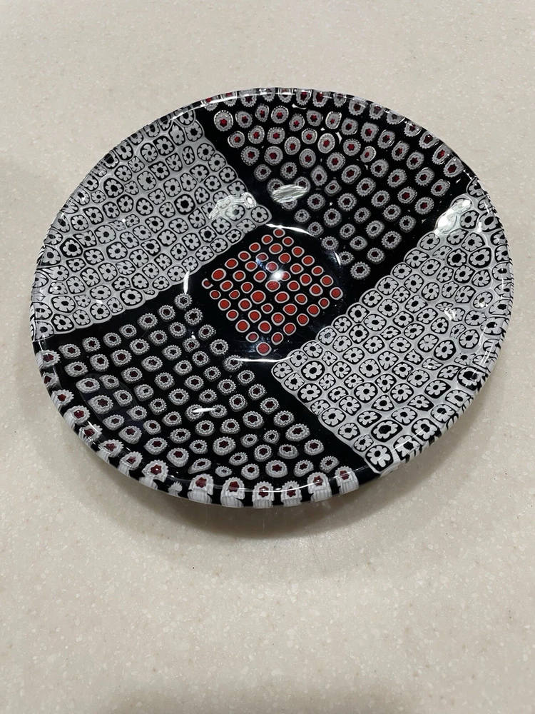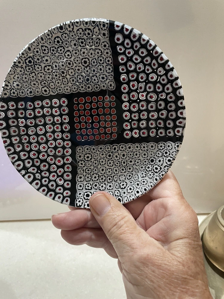 Beautiful 5 1/2" glass dish from Murano Italy crafted in the Murrina/Millefiori technique (aka-1000 flowers) Black & red & white glass canes make each of the "flowers". Stunning piece for display with light behind. Vetro Di Murano Made in Italy transparent label on back. No chips or cracks. Excellent condition.