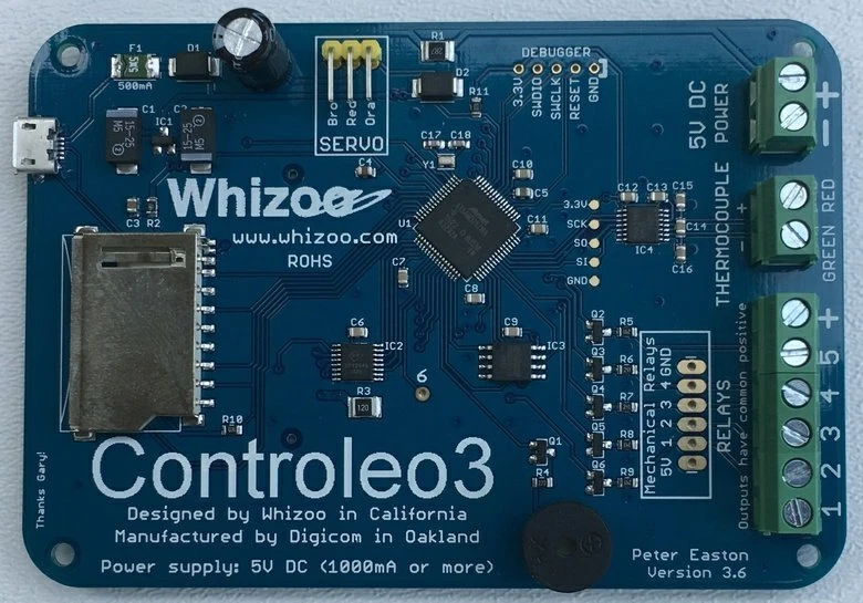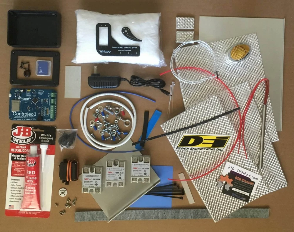 Controleo3 Reflow Oven Controller with Oven Build Kit If you only want the Controleo3 controller, please look at this listing. Follow the step-by-step build instructions here: (Oops, eBay doesn't allow links. Do an Internet search for "Whizoo Controleo3") Built on a solid foundation ControLeo2 was a wonderfully successful product, selling hundreds to customers world-wide. They've been used to control ovens large and small, convection, hot plate or conveyor belt. Such was the power of this well-designed controller and open-source software. We received a lot of feedback from customers. Our customers range from hobbyists reflowing exciting projects in their garages all the way to large corporations doing prototyping of next-generation products while keeping tight control over deadlines and intellectual property. We've also had a lot of feedback from industry experts, commenting on the controller, our build guide and our software. We have been making continuous changes to our web site and build kit to reflect all this expertise. Giant leap forward to Controleo3 Controleo3 was designed to address ControLeo2's shortcomings, and extend the controller's capabilities far into the future. It retains ControLeo2's strengths like ease-of-use, flexibility and openness but dramatically increases performance and usability. 4-inch 480 x 320 color touchscreen Processor is 12 times faster 10 times more memory and 40 times the storage Supports 6 outputs (up from 4) Support for up to 28 profiles PID support, with intelligent tuning SD card support for log files, screenshots and reflow profiles Upgraded thermocouple IC has line-voltage filtering Hardware is more robust (dare we say idiot-proof?) The challenges of building a reflow oven Lead-free solder requires higher temperatures than leaded solder. Take a look at a typical reflow curve for lead-free solder: An important part of the reflow curve is the maximum temperature of 255°C (480°F). It is difficult to build an oven that is capable of reaching those temperatures in such a short duration. However, another important number is the rate-of-rise of temperature at the higher temperatures. At those temperatures it becomes increasingly difficult to achieve the required rate-of-rise without running the heating elements at full blast. You run the risk of damaging sensitive components if the reflow takes too long, and you can create hot spots (damaged components) and cold spots (no solder reflow) if the elements glow red hot. There are a lot of other problems that can occur if the reflow profile isn't followed. Components can be damaged from thermal shock or cracking, solder paste can splatter which can lead to voiding in array type packages, and the solder paste could oxidate or the flux not fully activate. If the maximum allowable temperature of IC's is exceeded, it can damage the internal dies of components and foster intermetallic growth leading to shortened MTBF (mean time before failure) numbers. The time-above-liquidus and cooling rate also affect the quality of the resulting solder joint. What makes Controleo3 the best reflow oven controller? The Controleo3 controller and the oven built in the build guide (on the Whizoo web site) should be considered top-of-the-line . A lot of engineering and experience has gone into making the Controleo3 reflow oven, and there are currently more than 1000 customers world-wide using either ControLeo, ControLeo2 and the latest Controleo3. If you are only doing small boards and using leaded solder paste you can get away with a less-capable controller and poorly insulated oven. But how much is your time worth? What is the value of the components you plan to use? What is the turn-around time to order new boards or components when they get heat-damaged? Do yourself a favor and build yourself a great reflow oven. Do it once, and do it right! Controleo3's advantages: Six outputs Control convection fans, cooling fans and heater elements individually. Better heat distribution Having control over individual heating elements allows you to keep heat away from sensitive components. Hot-spot elimination Intelligent software manages element on-time, reducing hot and cold spots in the oven. Better heat direction Ability to specify if heat comes from the top or bottom, depending on the reflow phase. Better current management Elements are turned on and off independently eliminating the current spikes common in single-relay controllers. Ready-to-run No programming needed. Just configure the fans and elements your oven has and the software will do the rest. Profile support Support for up to 28 user-defined profiles. Intelligent PID tuning PID tuning is done automagically during a learning run. Proven hardware Controleo3 is based on the Arduino Zero. It expands the capabilities of ControLeo2, which was field-tested for years. Open-source Controleo3 is fully compatible with the Arduino programming environment, and runs Arduino Zero sketches. A library and "Reflow Wizard" software for Controleo3 has been posted to GitHub. Reflow Wizard Intelligent software makes it easy to get your oven up and running. Ensures consistent results, run after run. Reflow feedback If you connect Controleo3 to a computer you can track the reflow progress and get data to plot a reflow temperature graph. Support for SD card logging will be added soon. Servo support Supports industry-standard servos, so the oven door is automatically opened at the end of the reflow cycle to start the cooling process. Baking The baking mode supports a full range of temperatures, and a duration of up to 168 hours. Build guide Our comprehensive build guide (on the Whizoo web site) takes you step-by step through building your own oven. The alternatives Cheap China reflow oven (T962/T962A/T962C) These ovens have infrared elements located directly above the boards. There are no heating elements below the boards. Infrared is absorbed at different rates, so expect darker components to heat u