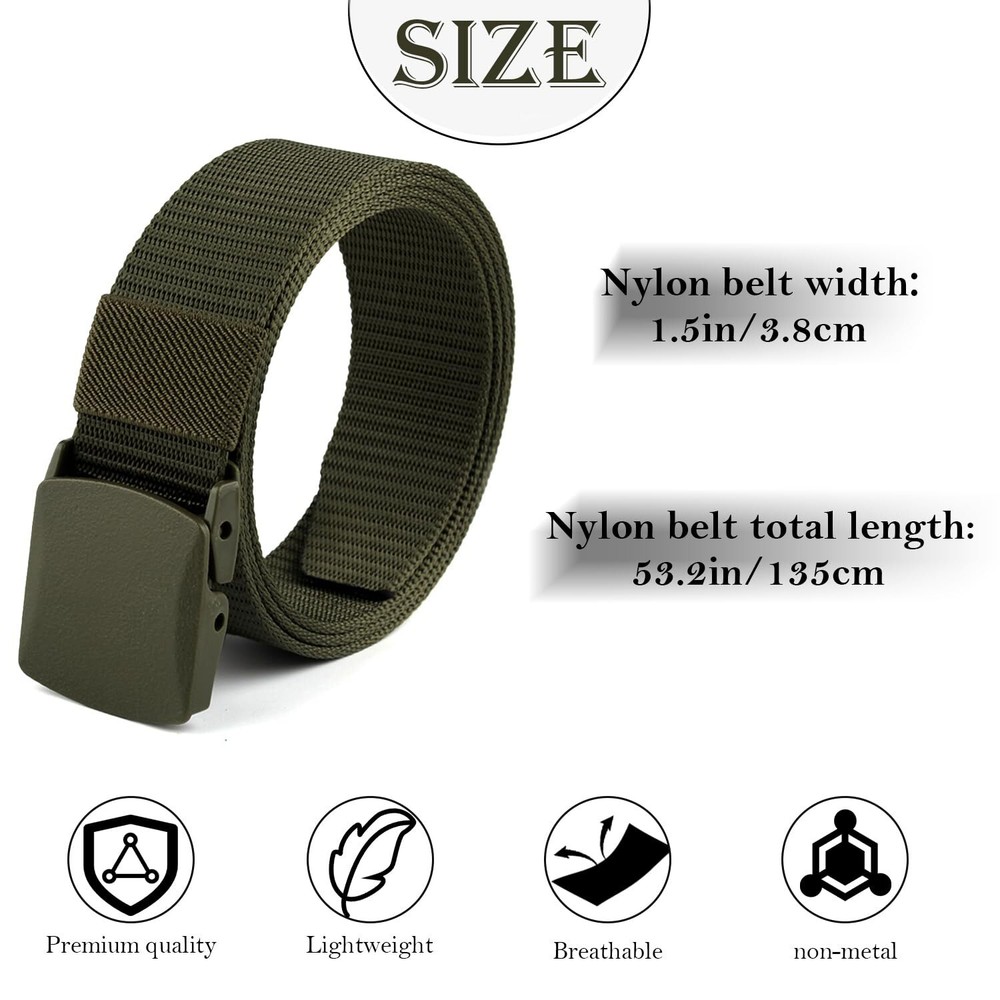Description Description: Our Nylon Military Tactical Men Belt is more than just a belt. It's a dependable accessory built for the rigors of any environment. Whether you’re securing gear or simply need a reliable belt that keeps up with your active lifestyle, this belt is designed to meet your needs. Product Function Detailed Explanation: This tactical belt features a heavy-duty nylon strap, making it not only durable but also resistant to wear and tear. The quick-release plastic buckle allows for easy, one-handed operation—essential when quick changes are needed. It’s designed to be adjustable, fitting up to a 53.1" waist without sacrificing comfort. The versatility of this belt makes it perfect for both daily wear and specialized needs like hiking, military deployment, or outdoor work. The pack includes 3 belts, each with a robust webbing that holds up against the elements. This means no stretching, slipping, or breaking, even under strain. Its adjustable nature ensures it can be tailored to your specific fit, providing comfort and support without restricting movement. Specifications and Usage Instructions: Material: High-strength nylon Buckle: Plastic, quick-release Size: Adjustable up to 53.1 inches in length,and 1.5 Inches in width Color: Assorted for versatile use Pack: 3 Belts,1 replace buckle Usage is straightforward: slide the belt through your pants loops, adjust to fit, and secure with the buckle. The belts can be easily cleaned with a damp cloth and are quick to dry, making maintenance simple and efficient. Additional Information: Our Nylon Military Tactical Men Belt is perfect for those who value durability and functionality. However, it's important to note that while the buckle is sturdy and reliable, it should not be used as a climbing or life-saving device. Regular checks for wear and tear are recommended to ensure maximum safety and longevity. With our military belt, you're not just buying a belt; you're investing in a tool that will serve you reliably in any scenario. Equip yourself with the right gear, and never worry about your kit’s durability again. Lengthening Tactical Belt Military Belt- The nylon military tactical men belt is specially designed in 53.1'',perfectly fits up to a 45" waist below. The easily adjustable buckle ensures a snug fit for daily comfort and tactical utility. Designed for active duty or daily wear, our belt supports rigorous outdoor and military use. Durable Nylon Material- Made from high-strength nylon, this belt is designed to withstand the toughest conditions. Ideal for military personnel and outdoor enthusiasts, it promises longevity and resilience, making it a practical choice for your adventures Quick-Release Plastic Buckle- Our belts feature a sturdy, quick-release buckle for fast and easy removal. This feature is especially useful in emergency situations or when transitioning between work and leisure, enhancing your preparedness and efficiency.Also get one free plastic buckle for changing Versatile Style & Use- These tactical belts seamlessly blend functionality with style, making them suitable for military, outdoor, and casual wear. They are the perfect accessory for any outfit, enhancing both your wardrobe and readiness for any situation Pack of 3 Value- Receive three heavy-duty tactical belts at an unbeatable price, ensuring you always have a reliable belt ready. Whether you're hiking, working, or simply going about your day, these belts provide exceptional value and versatility No Hold & Non-Metallic- The tactical belt military belt nylon belt webbing belt is non-metallic buckle for easy/quick clearance at security checkpoints. Especially suitable for metal allergy to wear. Removable plastic buckles, not easy to crack and breakage