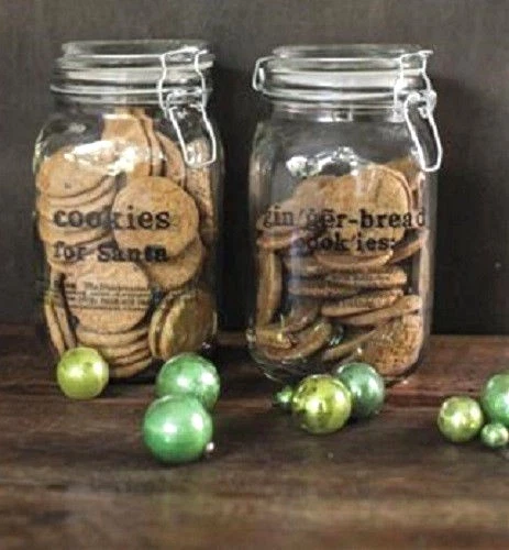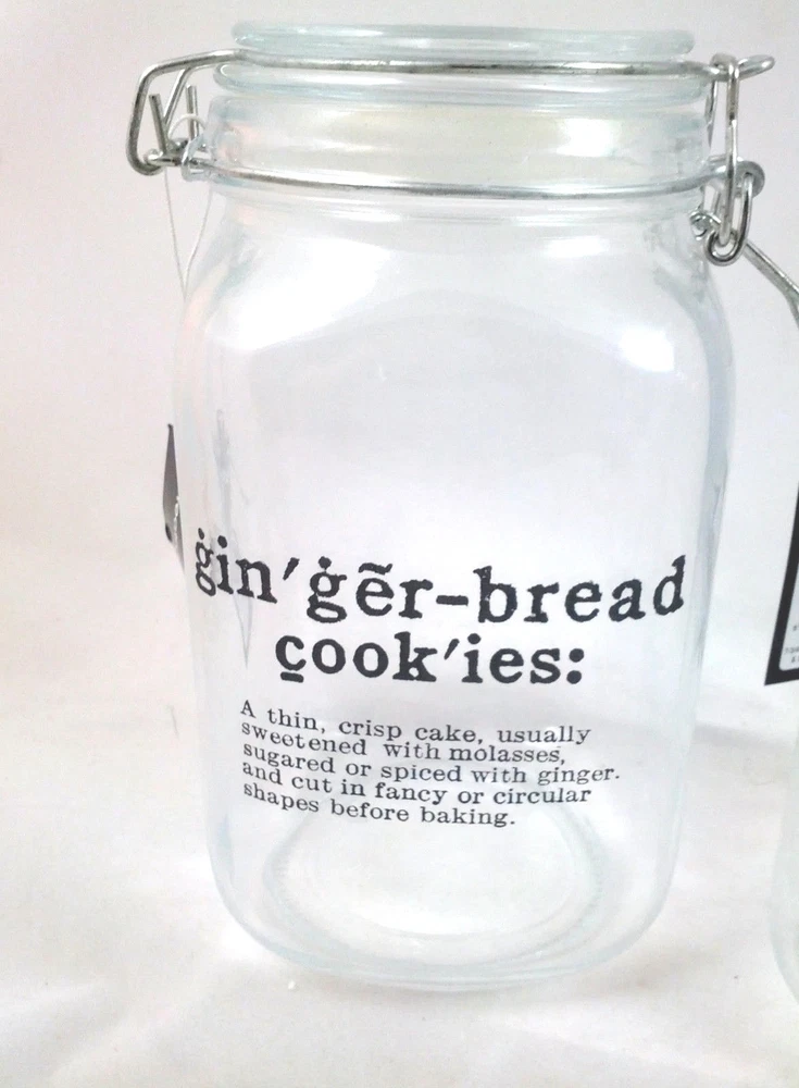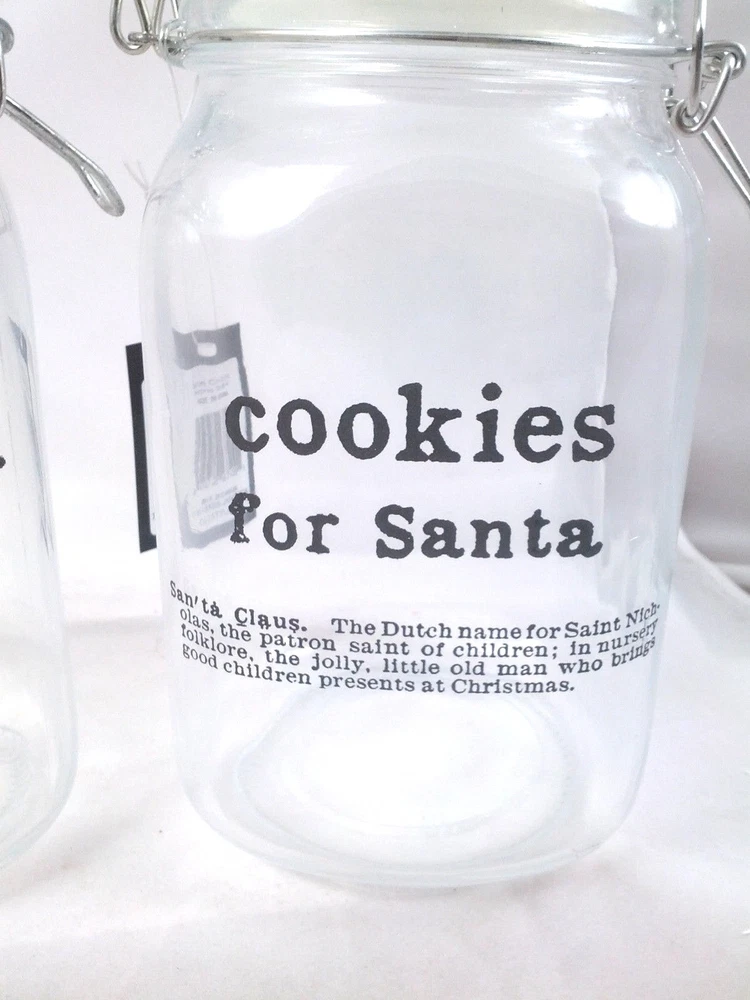 COOKIE GLASS JARS Set of two glass jars with lids that close with metal clasps. One reads COOKIE FOR SANTA and the other GINGER BREAD. These jars are 8" tall and 4.5" wide -set of 2 as shown, NEW
