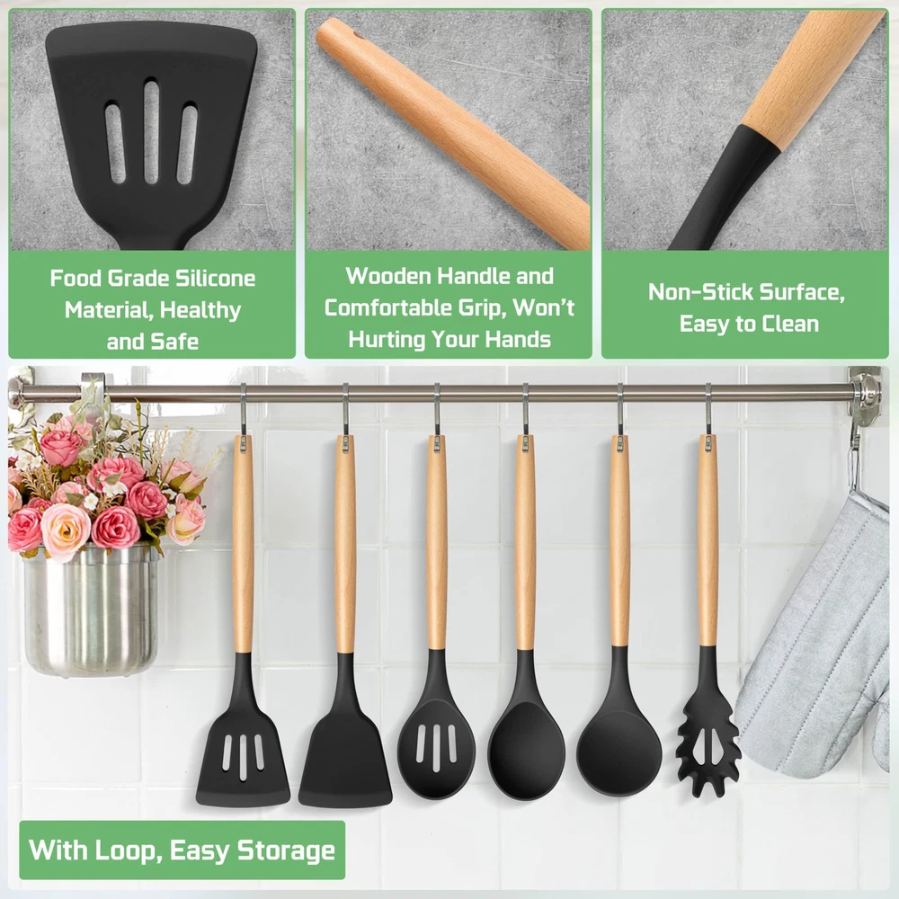 Black Silicone Cooking Kitchen Utensil with Wood Handle Set of 6 are made of food-grade silicone and wood, Without harmful substance leaching into your food, Can bear high temperature up to 446°F/230°C. All pieces utensils are friendly for your non-stick cookware and protect nonstick cookware for long serving time. The kitchen utensils with non-stick surface are easy to clean. The different options you will have with this set and meet your different cooking needs. An economical choice for your family. Specification: Material: Silicone, Wood Quantity: 6 Pcs Color: Black, Wood Tone 6-Piece kitchen utensil kit includes: 1 x Pasta server: 1 x Soup ladle 1 x Slotted turner 1 x Solid turner 1 x Solid spoon 1 x Slotted spoon Craft: Humanized handle, Hang loop, Smooth Features: Non-toxic, Heat-proof, Non-stick, Non-scratch, Easy clean and storage Why Choose Our Black Silicone Kitchen Cooking Utensil with Wood Handle Set of 6? 1. Silicone kitchen utensils’ head are made of food-grade silicone, can bear high temperature up to 446°F/230°C. 2. Smooth and soft silicone head won’t scratch the nonstick cookware. 3. The silicone cooking utensils includes 6 different utensils for many kinds of functions. 4. Ergonomic soft-grip handle with non-slip design can help you cooking better. 5. Small loop is convenient to hang on the wall, Easy to take and save space. Using Instruction: 1. Please wash the utensils before the first use. 2. Please soak them in warm water, wash by mild soap and hand dry after cleaning, store them in the dry place. 3. Please do not scratch the surface with wire balls or sharp tools. 4. Please do not expose to open flames. FOOD GRADE MATERIAL: The kitchen utensils set is made of healthy food grade silicone and wood without harmful substances, No odd smell or leave any other material taste and would not affect the taste of your foods, You can mix and stir it directly into the cookware, Safe and healthy for daily cooking use HEAT-PROOF & NON-SCRATCH: The silicone cooking utensils withstand high temperatures up to 446°F/230°C, Not easy to melt or burn when directly in the high temp, A good alternative choice sturdier than plastic and rubber utensils, Silicone head is scratch-proof and protects your non-stick pans, Extend the lifespan of your kitchen cookware THOUGHTFUL DESIGNS: The soft silicone head bond with wooden handle design makes the utensil firm and not easily breaking off or falling apart, Smooth wooden handles gives you a comfortable grip, Won’t hurt your hands, Modern black and natural wood tone combination decorates your kitchen MULTIFUNCTIONAL KITCHEN TOOLS: Silicone cooking utensil set includes 6 different kitchen utensils set meet many kinds of your cooking needs, Includes slotted and solid turner, deep soup ladle, solid serving spoon, slotted spoon, pasta server, For cooking, turning, serving, mixing, and more, Great tools for kitchen daily use EASY TO CLEAN & EASY STORAGE: The cooking utensil with non-stick surface, Easy to clean up by hand, Every end of the silicone utensil has a hanging loop helps effortless hanging on the hooks, Also ideal for storing in the utensils holder or kitchen drawer, Won’t take up a lot of space