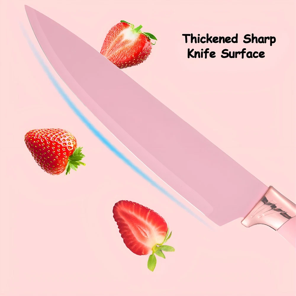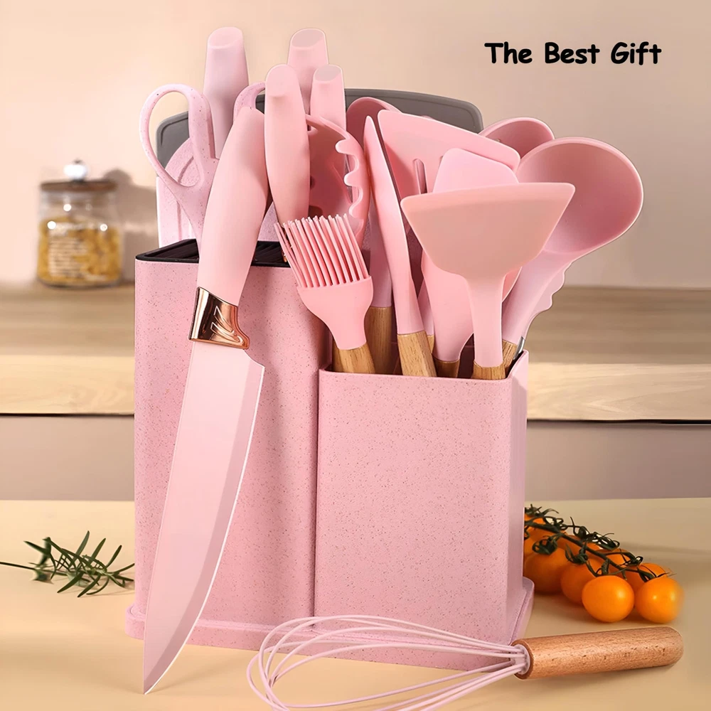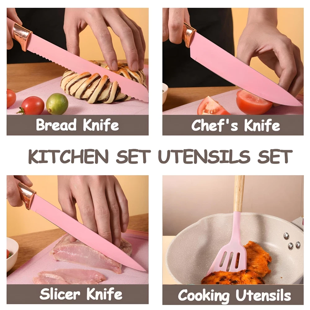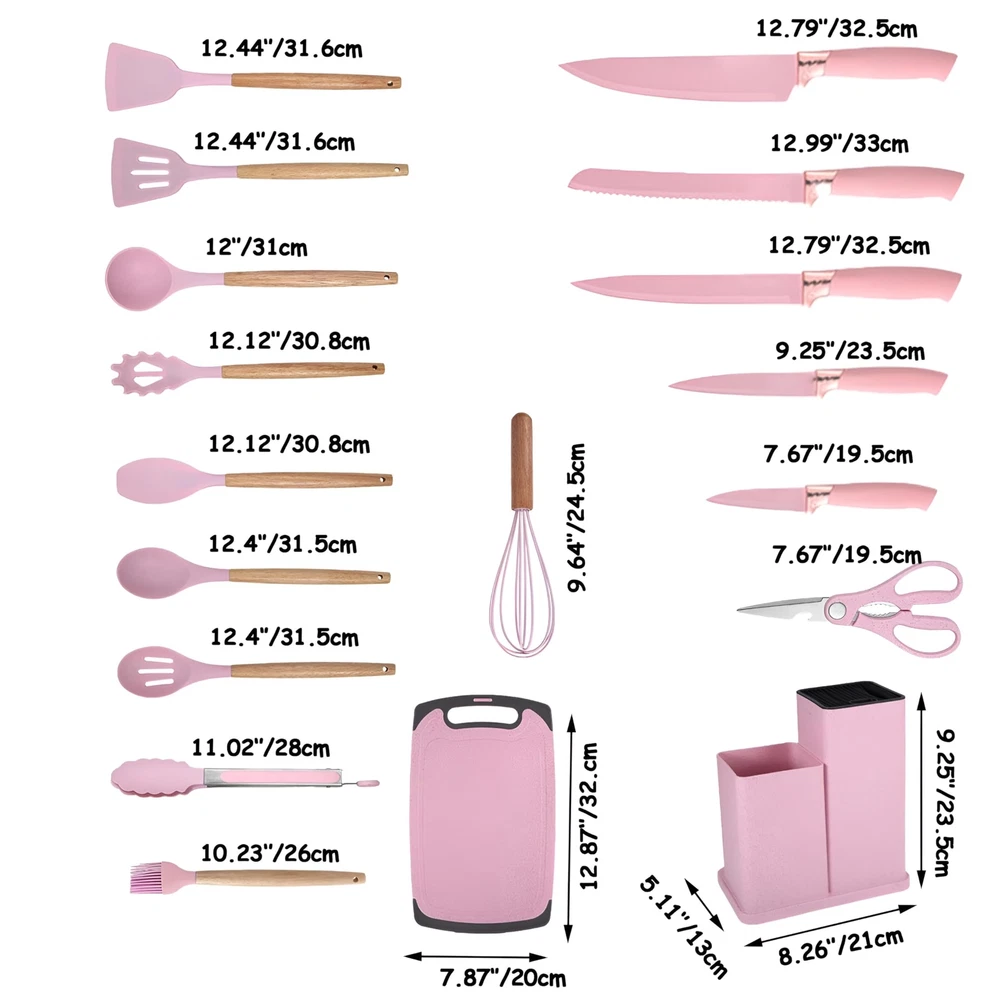 Cooking Utensils Set for Kitchen,19 Kitchen Utensils Set with 11 Non-Stick Silicone Heat Resistant Kitchen Gadgets,5 Anti-Rust Stainless Steel Sharp Kitchen Knife Set Scissors and Cutting Board Material: Stainless Steel Weight: approximately2.2 kilograms Color: Brown Packing:19* Kitchen Knife Set Product features: These knives are designed for both novice and experienced cooks. Each blade is expertly crafted from superior quality. It makes each knife has extremely sharpness, rust-resistance, long-lasting edge, and excellent toughness. The sharp blades make cutting and chopping tasks effortless, and the ergonomic handle provides a comfortable and secure grip. 24H Quality Customer Service: We offer a 365 day service guarantee. If you receive an item that is damaged (including scratches), we will provide a full refund or replacement. We also promise 100% customer satisfaction. Please feel free to contact us or send us an email and we will get back to you within 24 hours. 【Premium Quality Material】Our kitchen cooking utensils set is made of food grade silicone heads and hardwood handles,Made of food-grade silicone, BPA-free, can use in any type of food. And it will probably last longer than the other plastic kitchen utensils. This silicone cooking utensils does not react with food or beverages, you don’t have to worry about the health of your families will not retain odors or colors when you use it for stirring tomato-based food products 【6-In-1 Utility-driven Kitchen Knife Set】 the set includes a 12.99-inch serrated bread knife, 12.99-inch chef's knife, 12.79-inch slicing knife, 9.25-inch utility knife, 7.67-inch fruit knife, kitchen shears, and a knife holder for storing kitchen utensils Block. 【11-In-1 Pieces Silicone Kitchen Utensils Set】Cooking utensils set made of highly durable silicone. Includes Spatulas, Frying Spatulas, Large Spoons, Small Spoons, Spoon, Spatulas, Spatulas, Pasta Spatulas, Flat Spatulas, Oil Brushes, Food Holders, Egg Beaters and Cutting Board. 【Professional High Quality Chef Knife Set】The pink 6-piece knife set with superior stainless steel blades for precision is sharp and sturdy with a thin edge that keeps food from sticking to the knife’s edge, maintaining its ultra-sharp edge for precise cuts. Honed for long-lasting sharpness, the fine-edge blades boast precision cutting. Please stay away from Children because it is very sharp.
