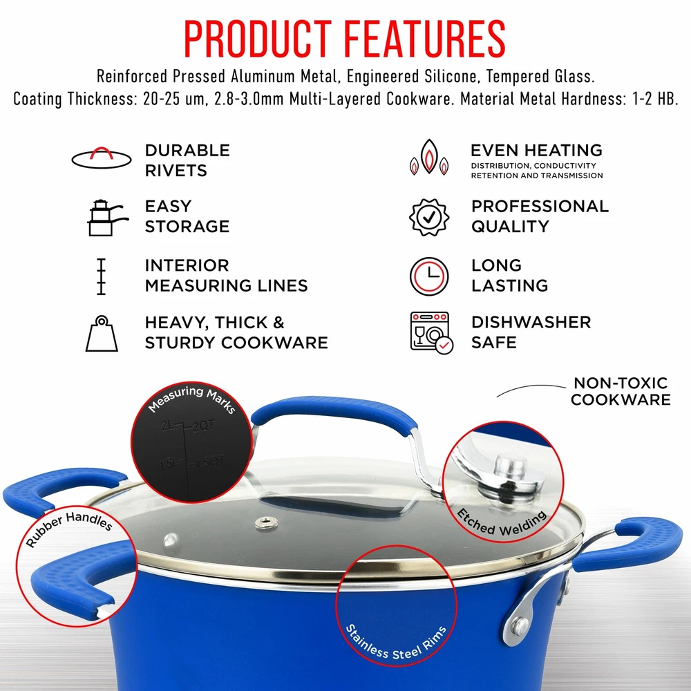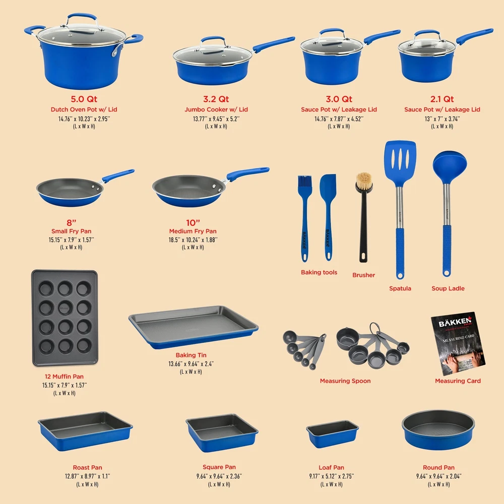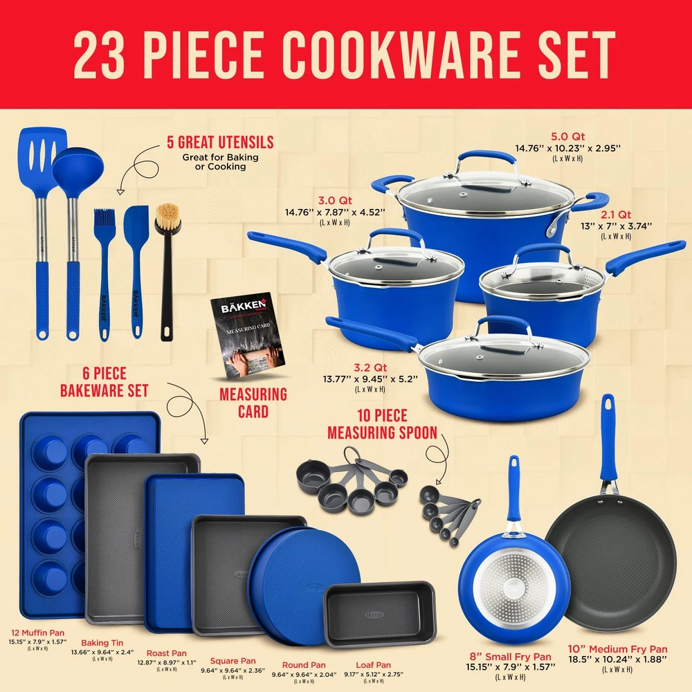 POTS AND PANS – with two sauce pots, a Dutch oven pot and jumbo cooker included you can boil, broil and simmer a range of food items up to a maximum temperature of 500° Fahrenheit (260° Celsius). All our pots come with see-through tempered glass lids for added versatility and measurements inside the pots for convenience. Also included are a small fry pan and a medium fry pan for eggs, pancakes and so much more! COOKWARE SET – update your existing cookware to our professional home kitchenware which features a massive 23 items! Everything you need to create top class meals is included. Our entire pots and pans set has a durable and long lasting non-stick coating as well as comfortable and cool to touch form-fitting handle grips for your convenience. Made from reinforced pressed aluminum metal they are the must have cook set for your home SUITABLE FOR YOUR COUNTER COOKTOP – we have designed our cook ware to be compatible with gas, electric, ceramic and induction counter cooktops. Our pan set is food grade safe and suitable for all abilities and is designed to effectively distribute and retain heat for all-round even cooking. With an integrated plaid wave pattern for exceptional non-stick surfaces in all pans POTS AND PANS – with two sauce pots, a Dutch oven pot and jumbo cooker included you can boil, broil and simmer a range of food items up to a maximum temperature of 500° Fahrenheit (260° Celsius). All our pots come with see-through tempered glass lids for added versatility and measurements inside the pots for convenience. Also included are a small fry pan and a medium fry pan for eggs, pancakes and so much more! UTENSILS INCLUDED – we want you to have everything you need when roasting, baking and preparing delicious meals and snacks which is why we have also included heat-resistant kitchen tool utensils with our pan set. The soup ladle, spatula, brush and measuring spoons are made from engineered silicone and all match the design of the pots and pans so you can enjoy modern cookware in your kitchen LONG LASTING TECHNOLOGY – our pots and pans and bakeware set items are all stain resistant and easy to clean. They are dishwasher safe, but we recommend handwashing for better results. The environmentally friendly construction, stylish color choice and extensive collection of items makes this induction cookware an all-rounder for beginners and experts alike. It is a great gift idea for those starting out in their first home, newlyweds or for friends and relatives who love to cook