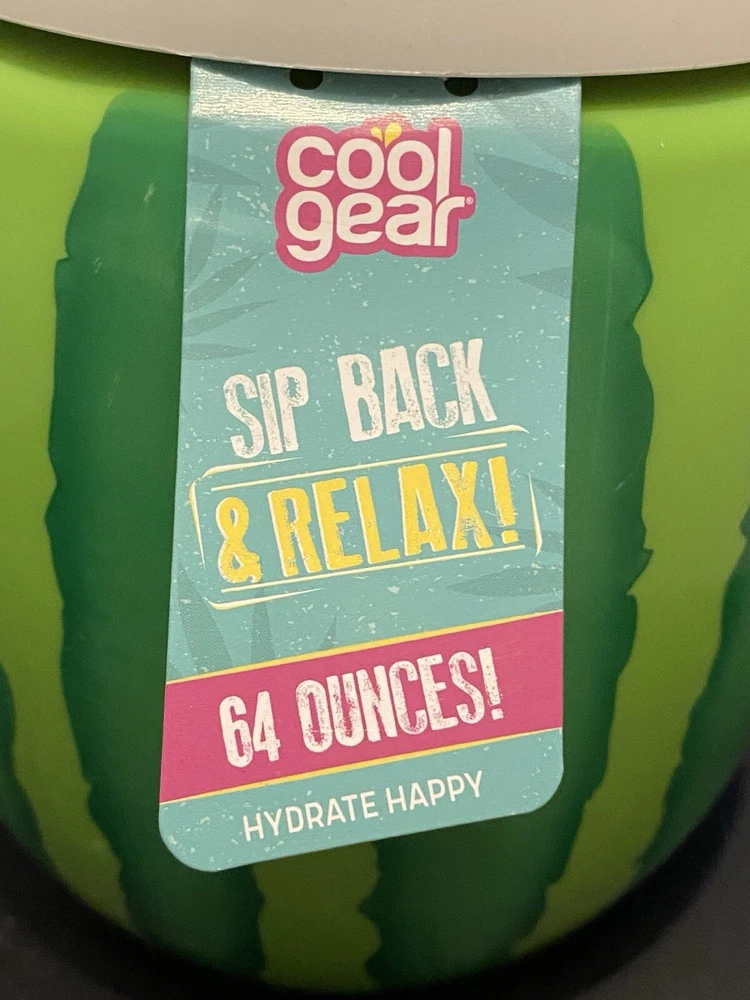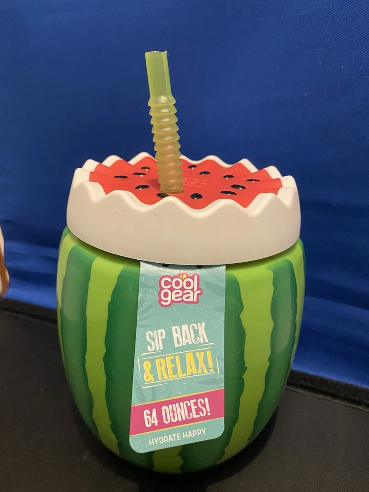 This Cool Gear™ tumbler features a fun watermelon design, perfect for all occasions. Made of BPA-free plastic, the 64oz tumbler comes with a straw and lid for convenience. The round-shaped tumbler is designed for teens and has a pop art style, with a theme centered around fun and curiosity, holidays, and food & drink. The item is 6 3/4 inches in height and 5 1/2 inches in width, making it a unique and practical drinkware option for anyone looking to sip back and relax in style.