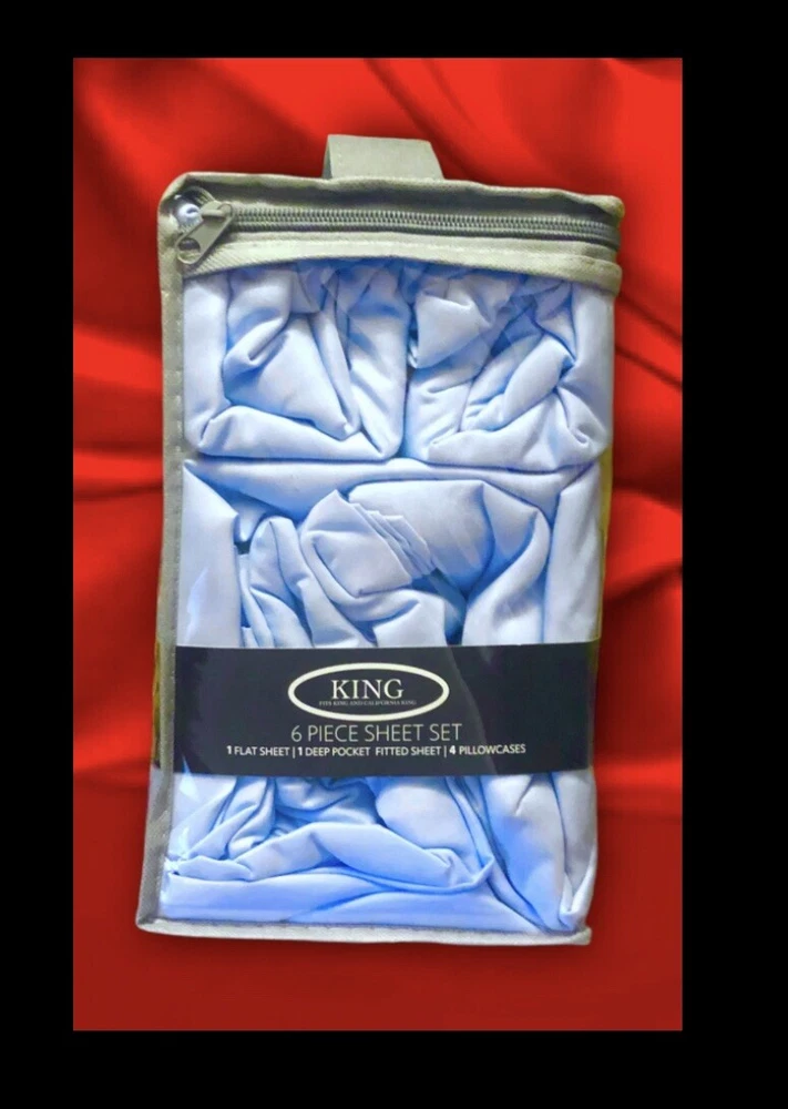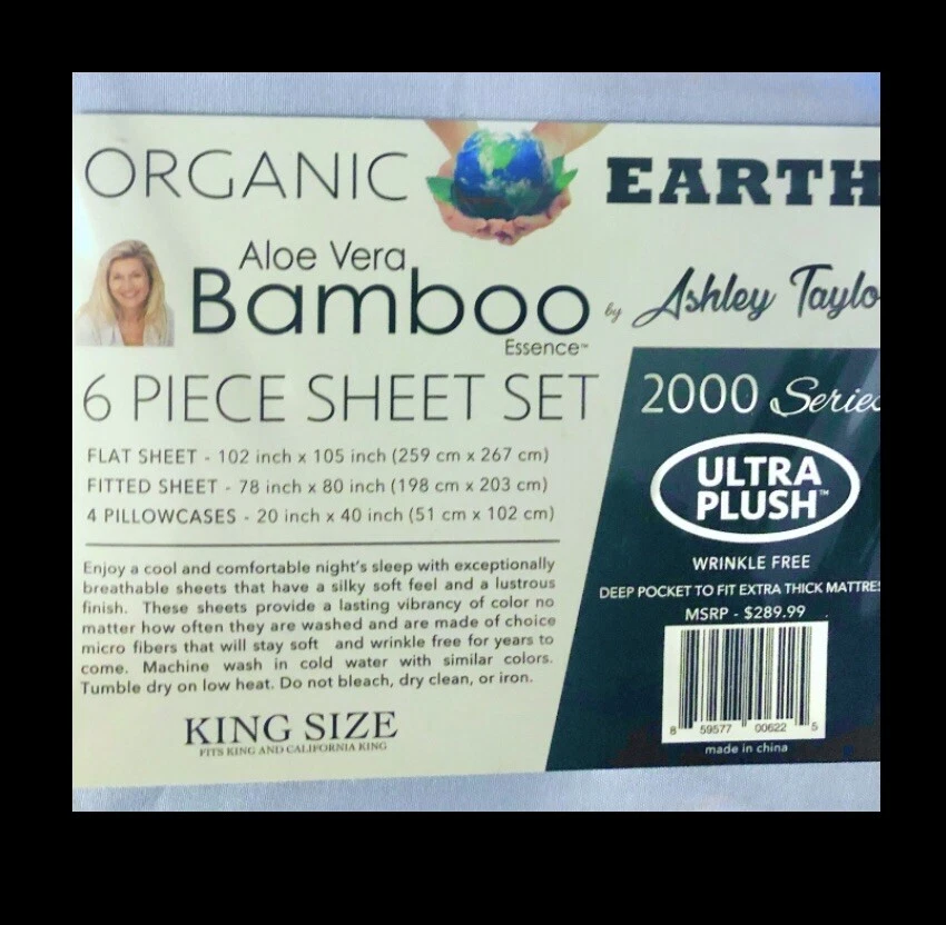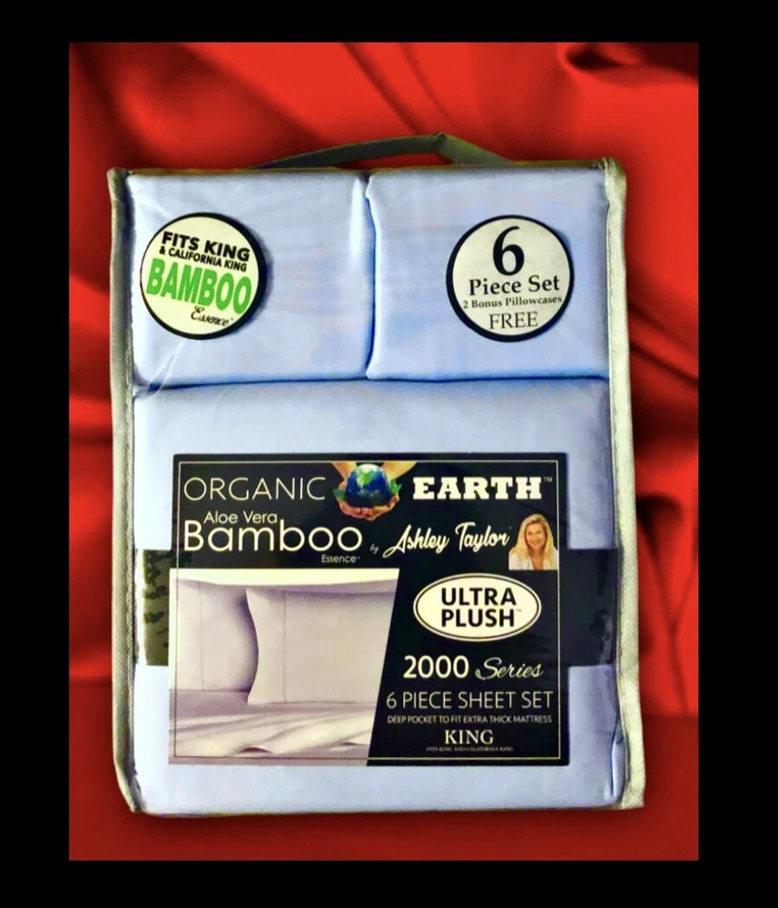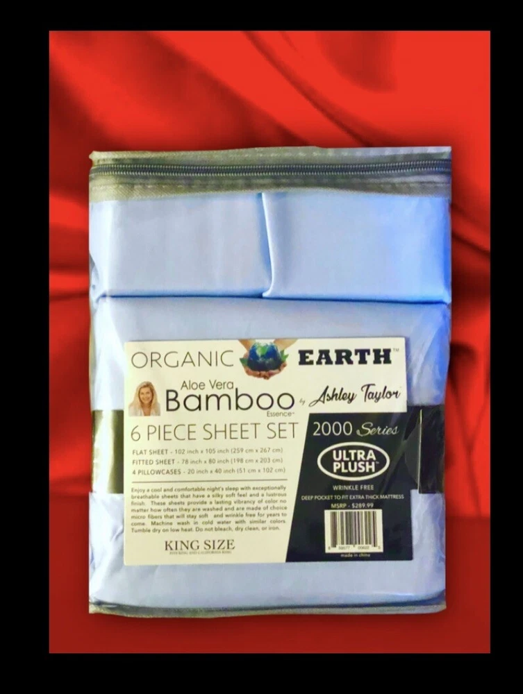 SHIPPED SUPER FAST .SHIPPED OUT BY SAME OR NEXT BUSINESS DAY TO ANYWHERE IN THE USA.NO TIME WASTED.GET YOUR PRODUCT FASTER Thank you for viewing this item. Please take a minute and check out our other wide selections and variety of items also our selection of similar products… Save more when you buy more! (More information from the manufacturer below ). All and any questions are welcome and will be answered ASAP if not -immediately before and also even after receipt of your purchase. *** Our intention is to provide you excellent service. Customer satisfaction is our goal. Positive feedback is very important to us. Negative feedback is damaging and not necessary as we are ALWAYS willing to resolve an issue should it occur. Color is -light blue Silky soft Wrinkle resistant Cooling Aloe Vera Bamboo Essence 6pc Sheet Set DEEP POCKETS fits extra thick mattress (about 11” deep) POPULAR By Ashley Taylor 2000/3000 KING SIZE. Condition is "New with tags". MSRP $289.99 2 FREE PILLOW CASES Allow for tones and color differences due to flash photography and screen/ monitor difference —————————————————- We aim to show you accurate description. The below information is supplied by the manufacturer. We have not verified or tested the validity. We are only able to describe the item as it is described to us by labels and packaging. Details from manufacturer... Features- Ultra plush 2 extra pillowcases 2000 /3000 thread count series Aloe Vera bamboo essence Cool and comfortable Breathable Silky soft feel Lustrous finish fade resistant Stays wrinkle resistant for years to come Deep pocket for extra thick mattress around 11” Enjoy a cool and comfortable nights sleep with exceptionally breathable sheets that have a silky soft feel and a lustrous finish. These sheets provide a lasting vibrancy of color and are made of choice micro fibers, infused with Aloe Vera and bamboo essence that will stay soft and wrinkle resistant for years to come. Machine wash in cold water with similar colors, tumble dry on low heat, do not bleach dry clean or iron Allow for tones, hue and color differences due to flash photography, reflection and monitor differences. — — — — Stock#uncratedboxed