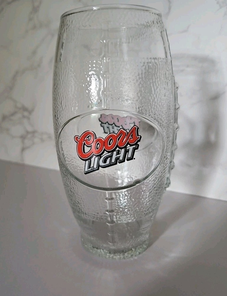 The Coors Light Football Shaped 20 oz. Clear Beer Glass is a unique and collectible item perfect for fans of the NFL or NCAA. Made of glass with a theme centered around breweriana and beer, this glass is a fun and distinctive way to enjoy your favorite beverage. The football shape adds a playful touch while staying true to the brand of Coors Light, making it a must-have for any beer enthusiast or collector of vintage US beer glasses.