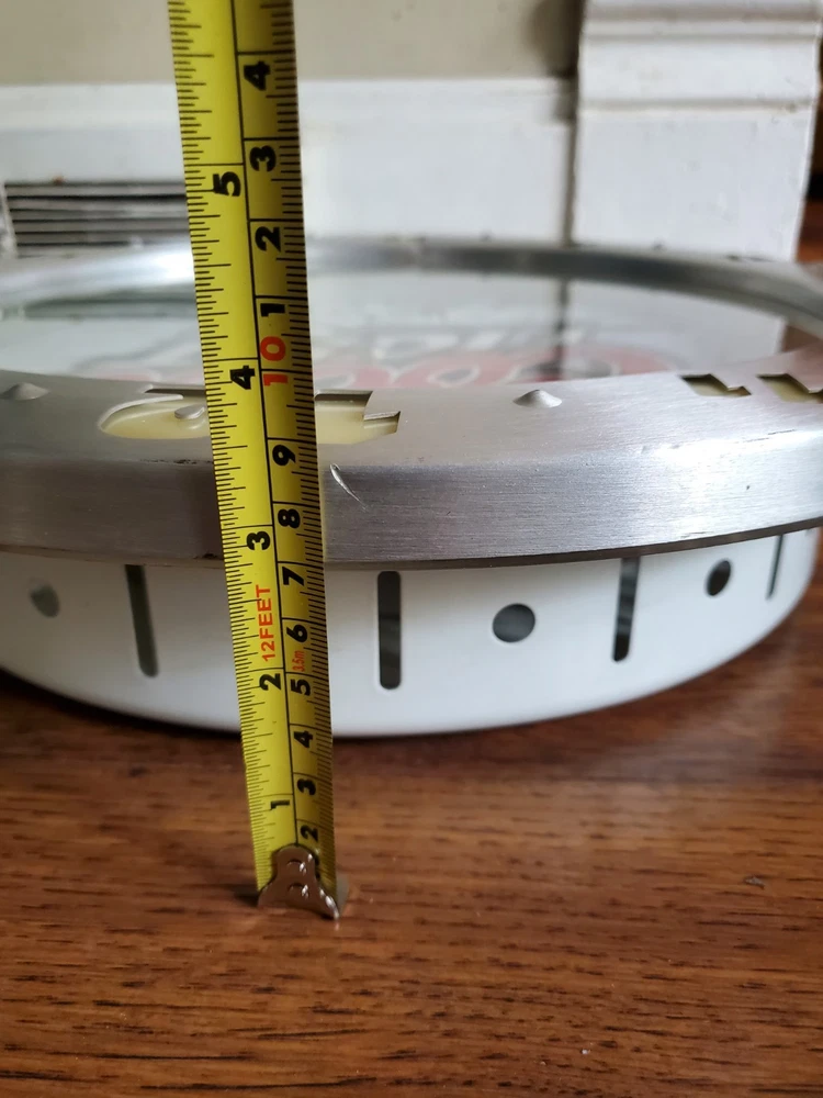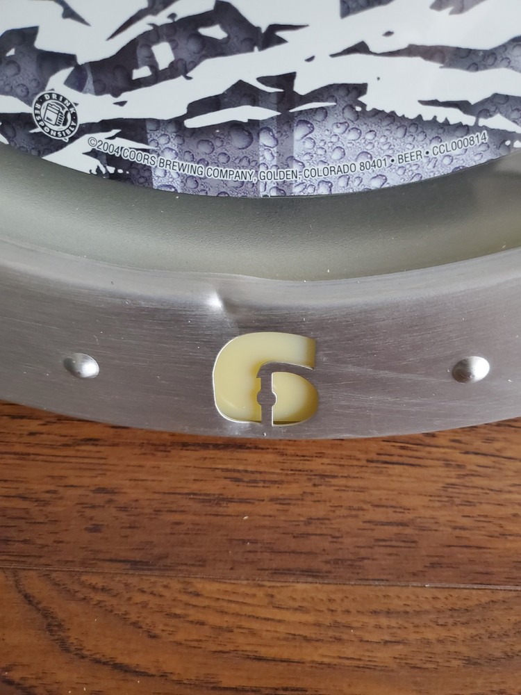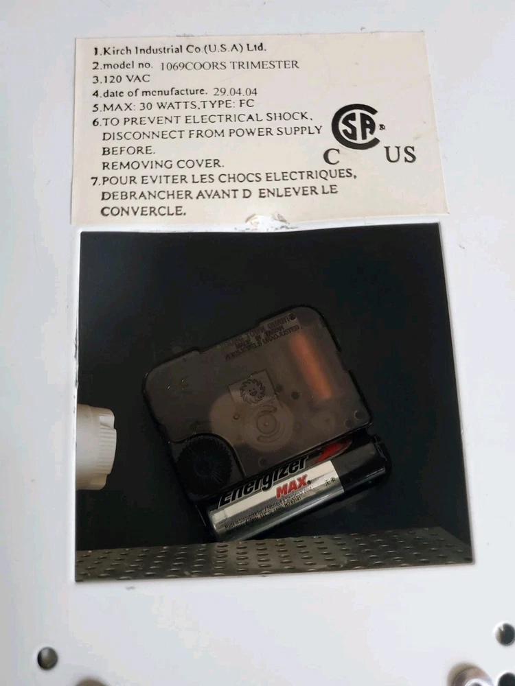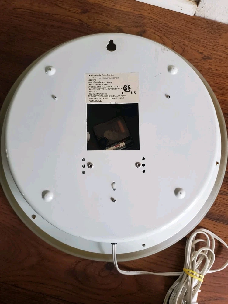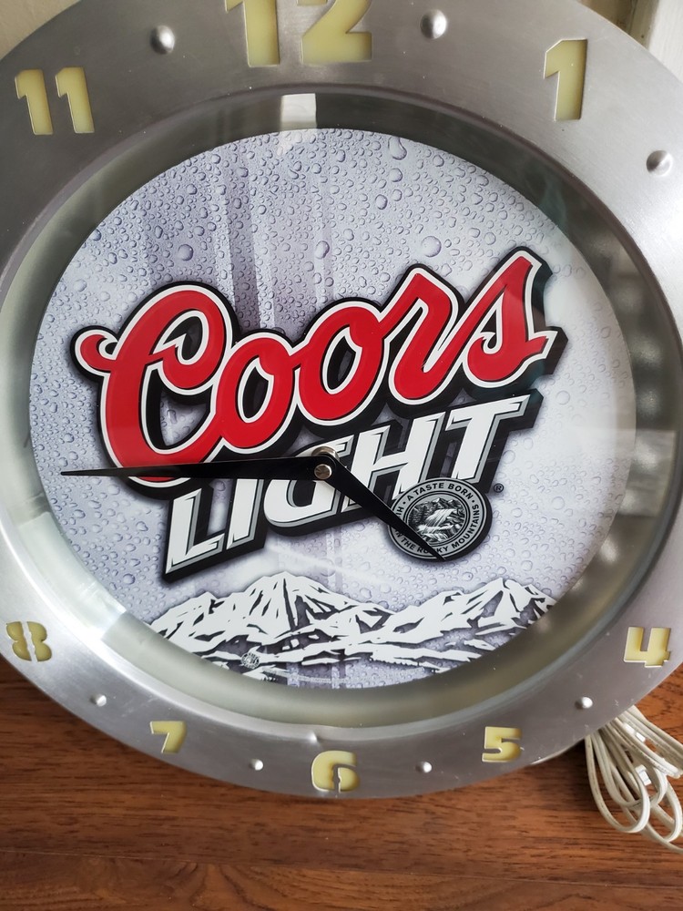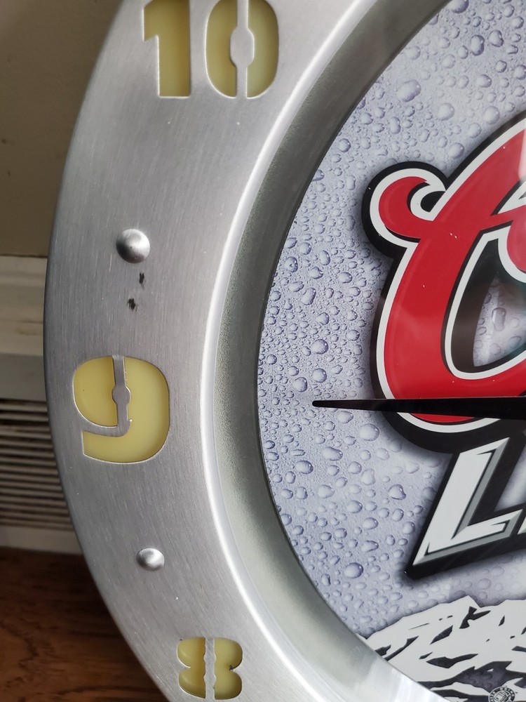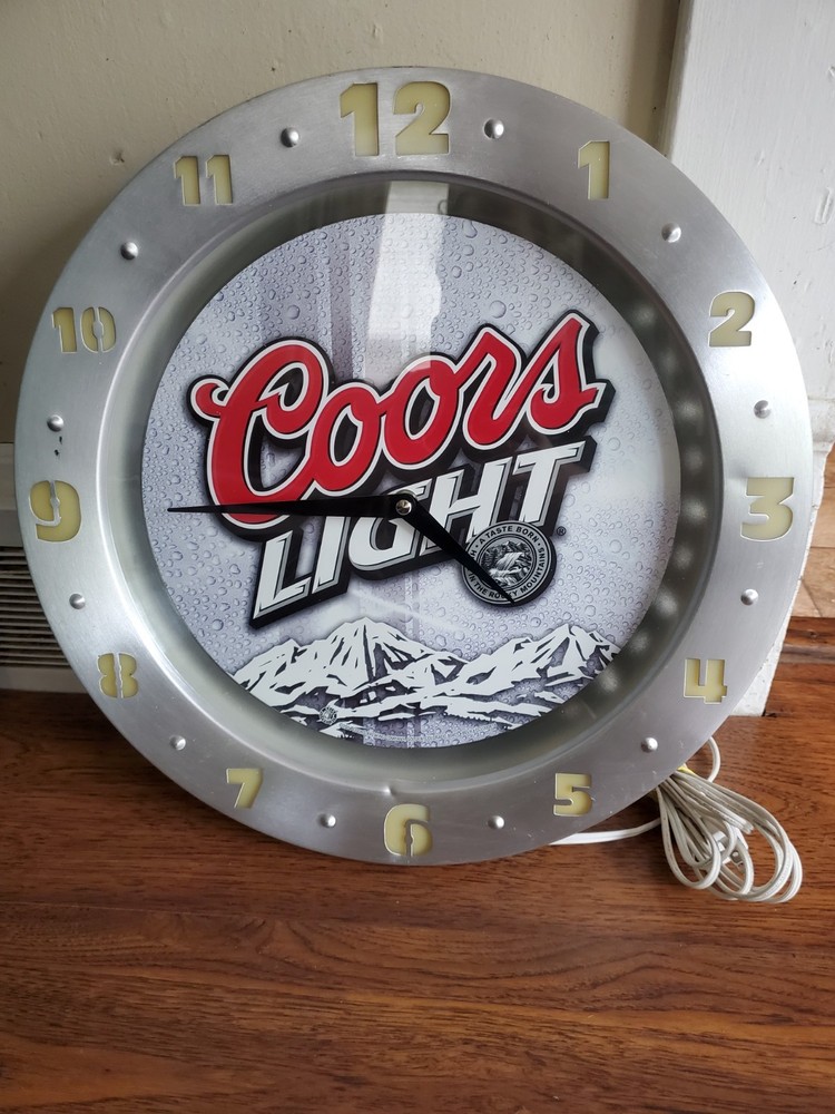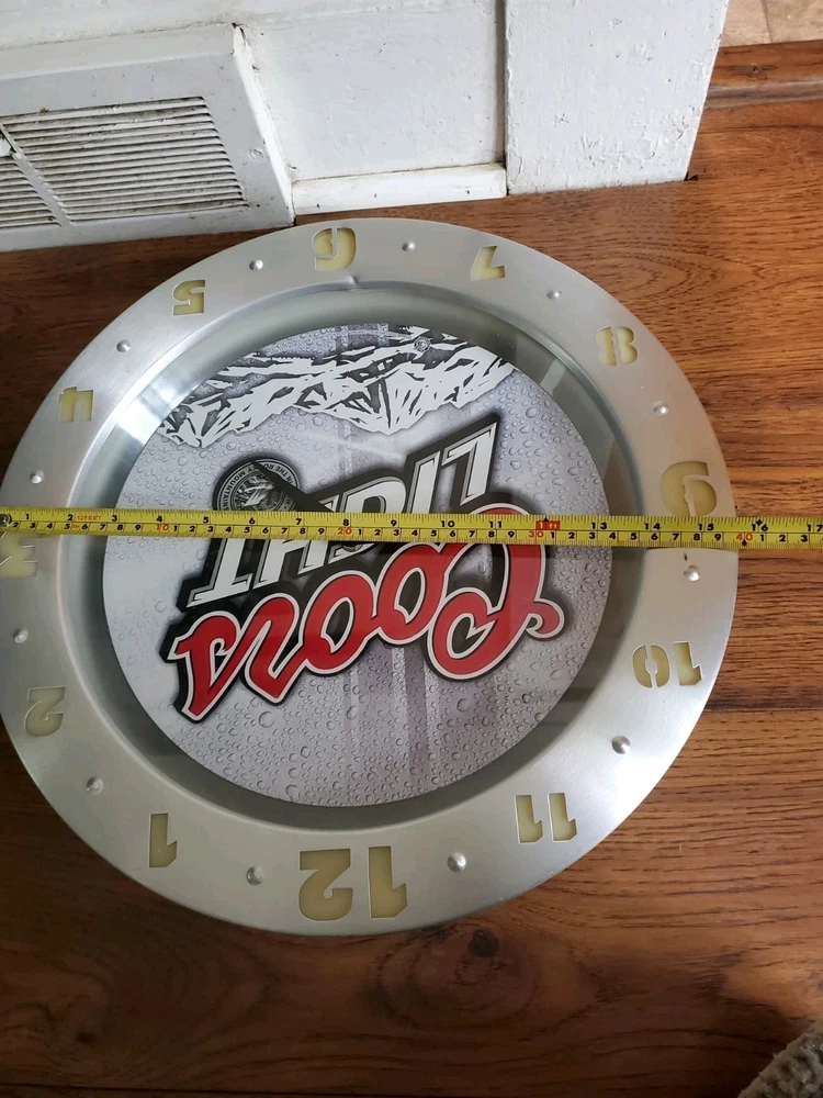 Coor, Light Wall Hanging Battery Operated Lighted Clock, approximately 15.75" wide, 3.25" tall, has a few dents, scratches & missing paint, requires 1 AA battery not included, as pictured no returns. Shipped USPS