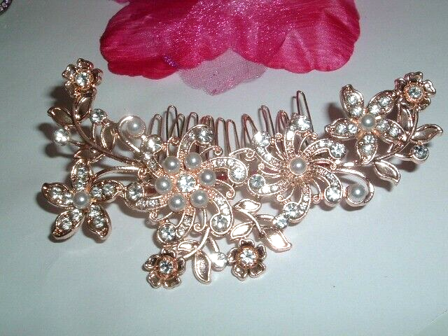Perfect for a wedding, prom, night on the town, anytime you want to be glamorous and sparkle. A 4" wide copper slide hair comb with white pearls and rhinestone flowers, never worn, condition is pristine.