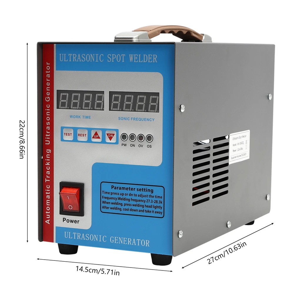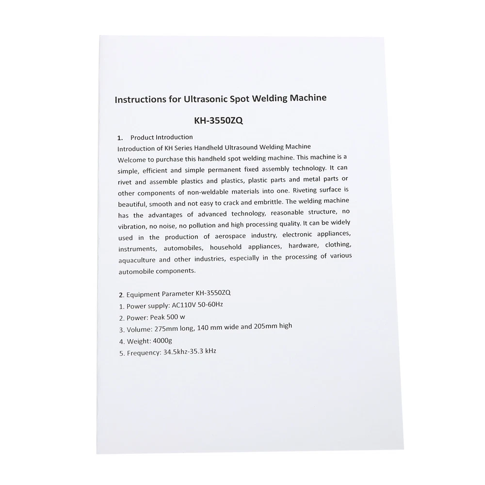 Corded Welding Machine Electric Spot Welder Equipment + Welding Pen 500W Description~ Description A good welding machine is a high precision and high-efficiency welding equipment that provides consistent welding quality and a wide range of application scenarios. Our products feature precise control, easy operation, high-quality materials, and stable performance, bringing you a professional welding experience. So, it will be a good helper for you to weld or DIY in your life and work. Package Included 1* Welding Machine 1* Welding Pen 1* Power Cord 1* Connection Cable 1* English Manual Specifications Model: KH-3550ZQ Color: Silver, Blue Shape: Rectangular Material: Iron, Rubber Technology: Ultrasound Process: Plastic Spraying Number of Pieces:1 Mount Type: Freestanding Assembly Required: No Power Source: Corded Electric Plug: US Standard Power Supply: AC 110V, 50-60Hz Power: 500W(Peak) Current: 0.2-3A Frequency: 34.5-35.3kHz Welding Thickness: Within 1mm/0.0394in Power Cord Length: 1.5m/4.92ft Welding Pen Cable Length: 2.8m/9.19ft Product Size: 14.5*27*22cm/5.71*10.63*8.66inch Package Size: 48*30*25cm/18.9*11.81*9.84inch Gross Weight: 4.5kg/9.92 lbs Key Features Build to Last: Its shell is composed of high-quality iron and sprayed with plastic treatment. which is corrosion-resistant , sturdy, and has a long service life. Welding Assistant: It uses high frequency(50-60Hz) electronic system to convert it into high-frequency mechanical vibration, which can weld and assemble most plastic parts, and the welded items have a beautiful, smooth appearance and are not easy to crack. User-friendly Working Interface: It includes a digital tube screen display showing ultrasonic frequency, time, and one-touch switch, making the operation easier. Powerful Function: It can reach up to 500W power, which can help you easily complete the welding of most plastic items, such as umbrellas, cake boxes, and lunch boxes. An auto-tracking system that allows it to track the frequency automatically instead of adjusting it manually. High-safety: Our product has a frequency deviation alarm, as well as good heat dissipation holes, which can ensure its normal operation and timely remind you of the frequency use problems, so you can use it more safely Easy to Clean: Because of the smooth surface and simple outlook, you can wipe the dirt from this machine with a rag. Ideal Gift: With its good performance and high practicability, it would be an ideal gift for your family and friends who love DIYs. Customer Service: We aim to provide quality products and services. If you have problems, please feel free to contact us. We will reply and solve the problem for you as soon as possible. Details Anti-slip Pads: Four non-slip pads can provide additional support to better maintain the stability of the product, raise the bottom to avoid moisture, and protect your countertop from scratches. Long Wires: The 4.92ft long power cord and 9.19ft long connection cable reduce the distance limitation during operation and make it convenient for you to use. Portable Handle: Its top portable handle allows you to carry it more easily and quickly. Application It is ideal for home DIY and general repair work. It can be used to weld most plastic materials up to 1mm. It can be applied to electronic appliances, auto parts, garment packaging, the textile industry, the environmental protection industry, the toy industry, PP PE conveyor belts, non-woven fabric, instrument panels, sound insulation cotton, footwear, waterproof board, manure belt, egg collection belt, ABS, communication equipment and other industries and is suitable for small deep holes and internal angle welding positions, orthodontics, glasses repair, handicrafts, dentures, DIY, etc. Notes Please beware of electrical safety hazards. Users should hold special operation qualifications. Please read the operating manual completely before use. And pay particular attention to the safety instructions included. Please note that our products can only be used to weld most plastics but not metals. Please allow the slight color difference caused by the shooting light and 1-3cm error due to manual measurement, and make sure you do not mind before you order. DESCRIPTION: Welcome to our store for shopping. Our store has a wide range of product categories for you to choose from. Welcome to click on our store to make a purchase or consult us, and we will recommend the products you need.?? ↓↓↓ Welcome Payment Delivery details Terms of sales About us Contact us Payment We accept ebay payment 。 Fees such as import duties, taxes are not included in the item price or shipping costs. These charges are the buyer's responsibility. Delivery details Shipping: 2-9 working days to: USA Terms of sales We maintain high standards of excellence and strive for hundred percent customer satisfaction. Feedback is very important to us. We hope that you contact us immediately before you give neutral or negative feedback, so that we can address your concerns. It is impossible to address issues if we do not know about them! About us Your satis faction is our ultimate goal. We work hard to earn your trust and future business. Our certified technicians have tested each item before shipping. The unit comes with 1 year limited warranty on all manufacturing defects. a) If you receive a defective item, you may return it or ask for a discount. Please contact us within 14 days after you receive the package. b) What you returned must be intact and in its original packaging as re? u. Customer is responsible for shipping costs of the returned item. c) We will cover the cost of shipping back t with the shipping rate indicated in the registration page. We will send you a new unit or refund the full payment you paid. Thank you. Contact us Business Hour Business Hour: Monday To Friday: 8:30 AM to 5:00 PM (Beijing China time) Due to time zones, our reply to your questions may not be immediately. But within above working time, we will repl