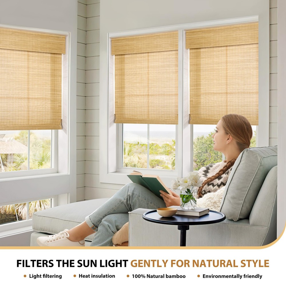 Actual Blinds Size is 22 1/5 inch Width, the clip buckle adds 2/5 inch on each side (total 4/5 inch). Therefore, make sure your window width is at least 23 inch or larger for an INSIDE mount. For OUTSIDE mount, add 1-4 inches wider to your window opening width for better light blocking. Cordless Blinds for Windows: The cord-free design provides a clean, tangle-free look to the window and creates a safer environment for children and pets. Easy to raise up or lower down to gently filter sunlight. Natural high-quality wild bamboo, breathable, keep the indoor air fresh and natural, warm and beautiful. Since these shades are all natural, small gaps between each flat material are normal and help gently filter light for a unique, soft glow. Please understand the color difference and bamboo joint on the blinds because of the nature material. Easily installed in minutes with all necessary hardware included. Smoothly roll up or down to control sun light and wind in your room. Perfect solution for living room, dining room, office, bedroom. If you have any issues or questions in the process of purchasing, installing or using, please feel free to email to us by Amazon message and we will respond to you within 24 hours.