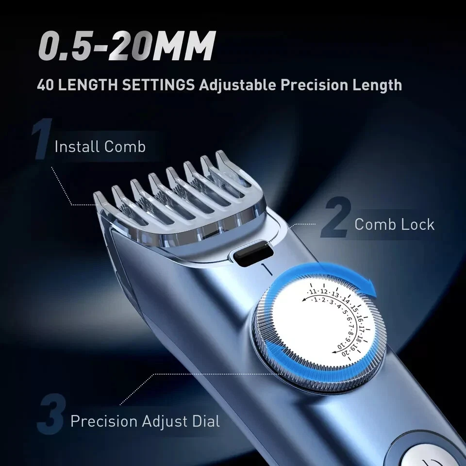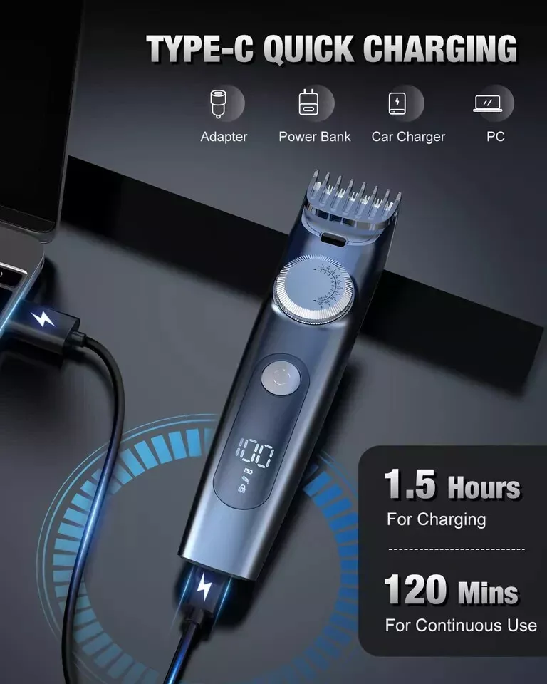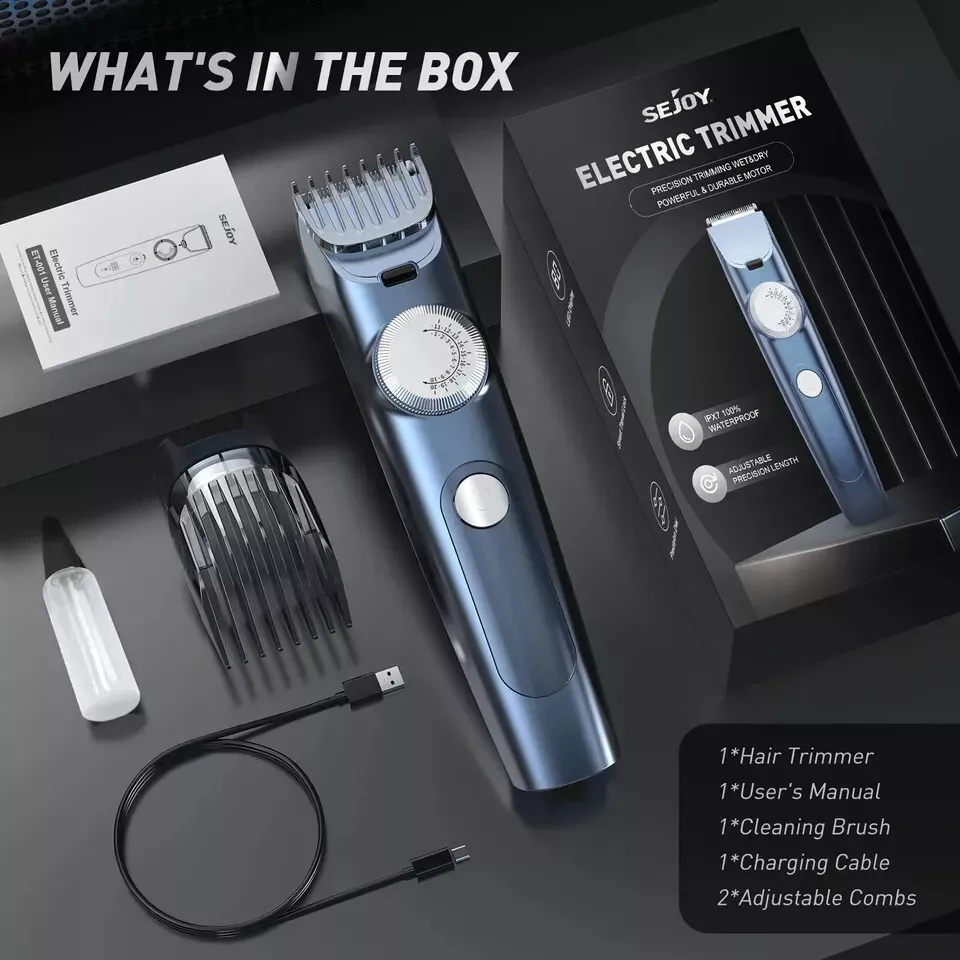 Cordless Beard Trimmer for Men Adjustable Hair Mustache Trimmer with LED Display Description: About this item 【High Quality】 Sejoy hair clipper uses a powerful motor and high quality carbon steel blades to cut easily and quickly without pulling hair. The tip section features a safe R-shaped blunt design that is skin-friendly. Professional zero gapped hair clippers for any man's hairstyling needs, this trimmer can be used at home or as a barber's hair cutting kit. 【0.5mm-20mm Length Adjustment】 This hair trimmer for men comes with two different length guide combs (0.5-10mm / 10.5-20mm), a free length adjustment dial and up to 40 precise length settings, so you can use it according to your desired hair length. The noise level during operation is less than 60 dB, so you won't be bothered by noise. 【TYPE-C Quick Charge】 Professional hair clipper is powered by a powerful lithium-ion battery that runs for at least 120 minutes after a full charge of approximately 90 minutes. Type-C charging port for connecting a USB adapter or other USB powered device. The cordless hair clipper's LED display clearly shows the percentage of battery remaining. 【Easy to use and clean】 The beard trimmer's blades can be easily removed and rinsed under the tap. It is recommended to clean any hair left on the blades with the included brush after each shave and haircut. Cordless and compact, lightweight and portable, the men's and women's hair trimmers are well made and durable for use at home or when travelling. 【Best Gift】 Designed to give you professional quality results in the comfort of your own home, this rechargeable hair clipper is not only for men and children, but also for pets and women. Great as a holiday gift, anniversary gift for someone you love!