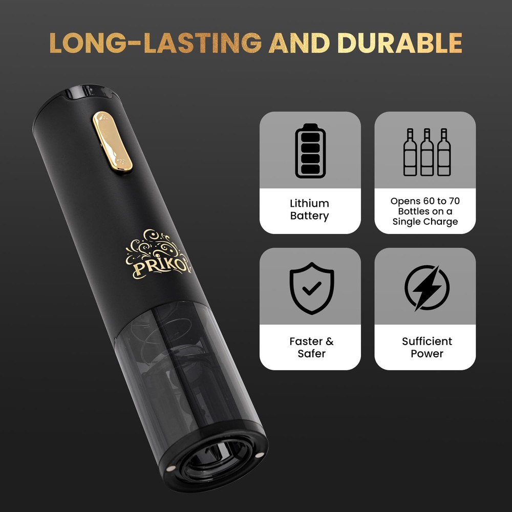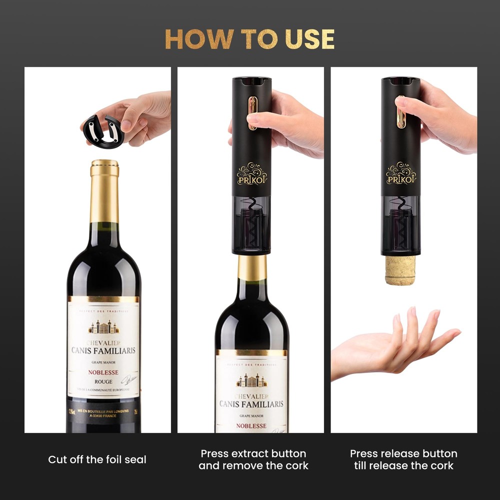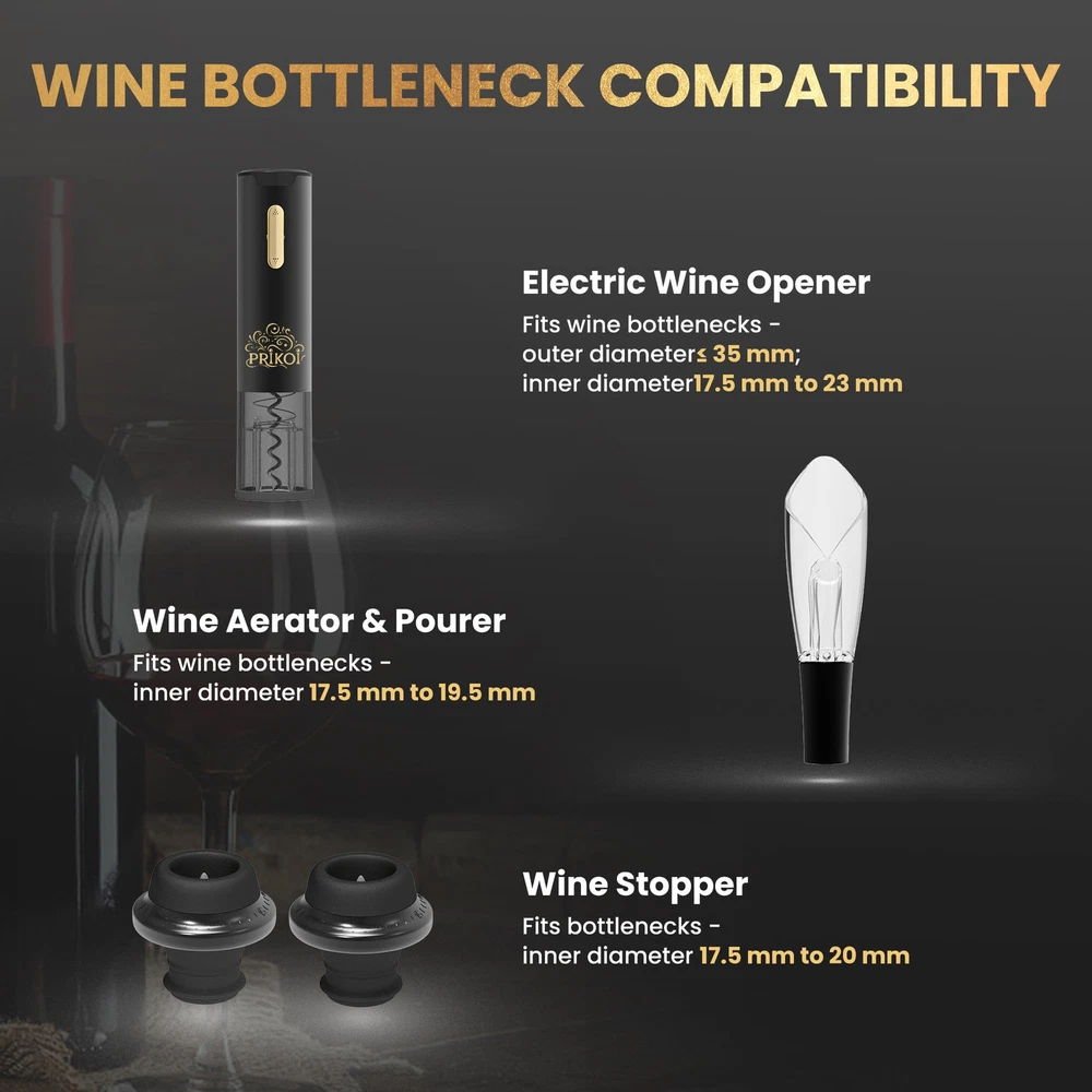 【All-in-one Wine Opener Set】 This electric wine opener set offers everything you need to start enjoying your favorite wines! The set includes: an electric wine opener, wine aerator, vacuum pump, 2 wine stoppers, and foil cutter, catering to all your wine opening, pouring, and preservation needs for any occasion. 【Powerful & Efficient】 This wine opener is equipped with a new lithium battery that is more durable and powerful, providing enough power to remove all corks. It allows you to open up to 60-70 bottles on a single charge, so you can use it anywhere, whether at home or on the move. 【Rechargeable & Storage Base】 Featuring a Type-C charging base, it fully charges in just 2.5 hours, making the electric opener easy to recharge and ensuring it is always ready to go. Thanks to its storage function and sleek design, this base keeps everything looking great on your kitchen countertop. 【Easy to Use】 Just put it on the bottle, press the button, and the cork can be removed in seconds. It easily removes corks, saving you time and effort so that you can enjoy a hassle-free wine-opening experience. 【Perfect Gift Choice】 Our product has a stylish design, making it the perfect gift for wine lovers. It's also great for use in restaurants, bars, hotels, or any wine and dining business.