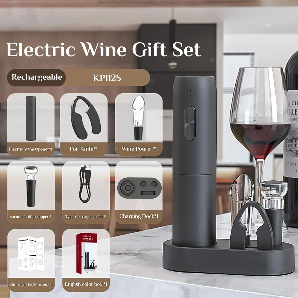 【RADIO CHARGING BASE】 Say goodbye to batteries! The rechargeable feature and included charging base ensure that your electric wine opener is always ready to go. No more searching for batteries. 【CONVENIENT AND SAFE】 The Electric Wine Corkscrew removes cork and releases in 6-8 seconds. Enjoy fast and smooth cork removal without leaving any marks. 【COMPATIBLE WITH MOST WINE BOTTLES】 The most efficient and convenient way to open a bottle without damaging the cork or creating cork fragments, no pulling, twisting or breaking of cork fragments. 【VACUUM STOPPER】 Vacuum stopper is made of food-safe material, stable pouring speed reduces spills and mess. The freshness preserving vacuum pump prevents wine waste and slows down the oxidization process. 【THIS IS A THOUGHTFUL PRODUCT FOR WINE LOVERS】 Electric rechargeable wine bottle opener is a must-have for every wine lover, whether it's a holiday, a birthday or a special occasion, you can give it to your beloved ones so they can enjoy more wine.