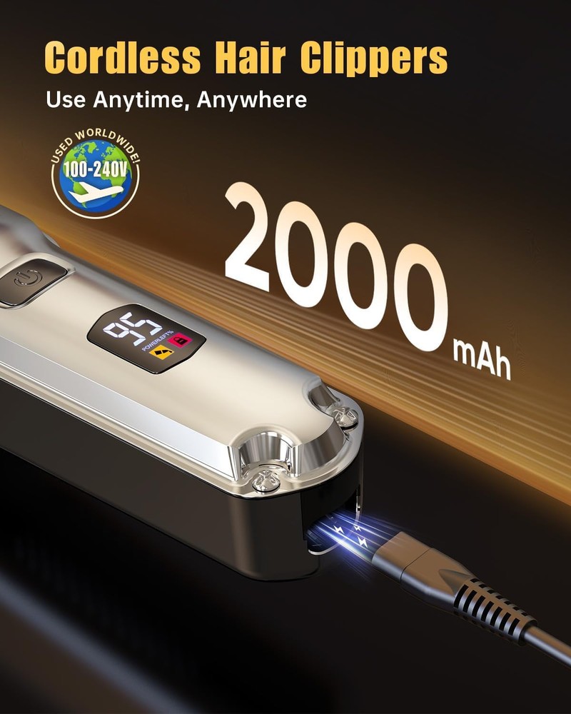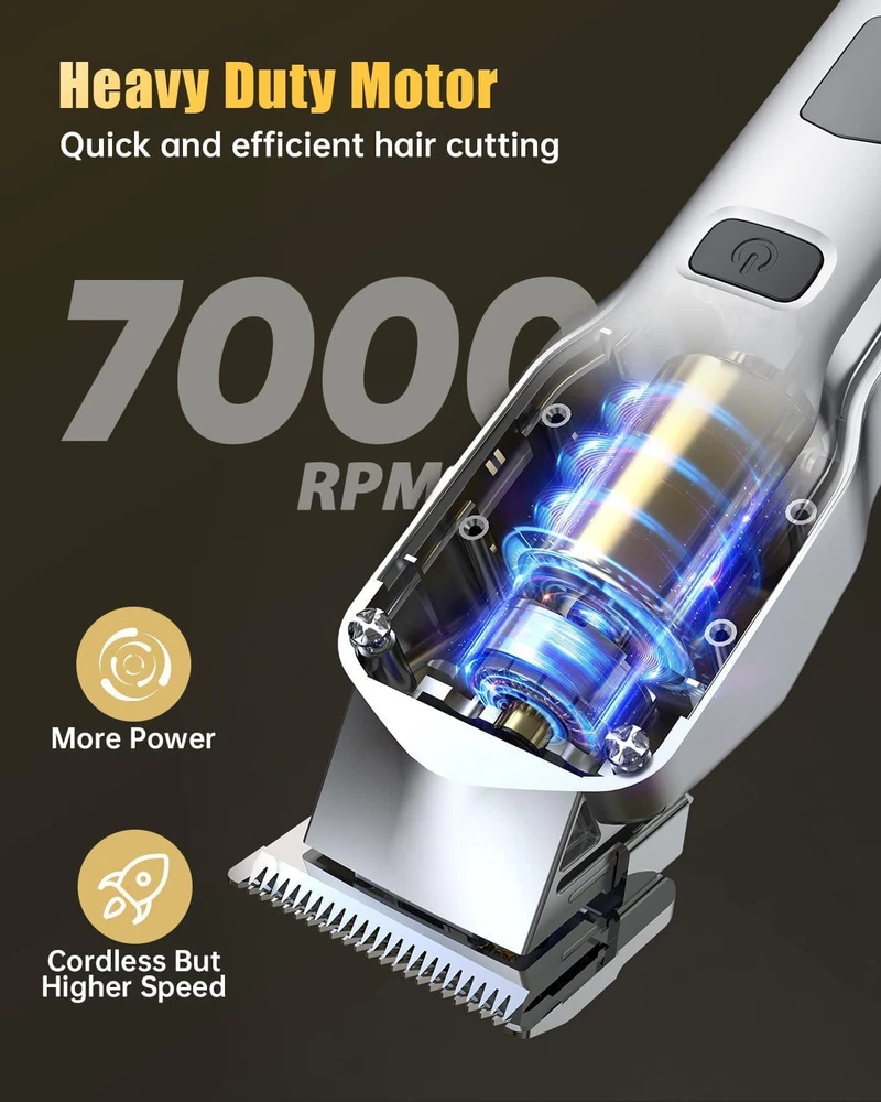 All In Clippers and Trimmers Set : Our professional hair clippers kit are designed specifically for home users with precise cuts, and we cooperation with families around the world , easy to use. It can easily trim fading,blending,art carving,sideburns,edges and hair cutting.Give you a perfect grooming experience like in a hair salon.Also suitable for barbershop Detail Trimmer For Fading & Blending : The hair clippers adjustable taper lever offers precise control (0.8-2mm),the T-blade trimmer accurately to 0.1mm, and we offer hair clippers 6 guide combs (1/16”, 1/8”, 3/16”, 1/4”, 3/8”, 1/2” ),and 4pcs hair trimmer guide combs (1,3,5,7mm) makes it more suitable for blending and fading precision short cuts Sharp Stainless Steel Blade : mens hair clipper adopt precision carbon steel blades, more sharper. It is strong enough to cut through your hair like butter without pulling your hair.the precision ground blades cut through all hair types and stay sharp longer LED Display& Long Battery Life : Our cordless hair clippers allows for flexibility during haircuts. Built-in 2000mAh high-capacity battery can run for at least 4 hours after 3 hours of charging.LED display, allowing you to know the power at any time Heavy Duty Motor : Our clippers for hair cutting is equipped with a heavy-duty motor 6800 RPM,cut through even the thickest hair easily and efficiently.The motor is also quiet, which ensures a peaceful and comfortable hair cutting experience IPX7 Waterproof & Easy to Clean : The hair clippers for men with 𝐈𝐏𝐗𝟕 𝐰𝐚𝐭𝐞𝐫𝐩𝐫𝐨𝐨𝐟 𝐝𝐞𝐬𝐢𝐠𝐧. You can rinse directly under the tap for easier cleaning.The clipper is also lightweight ,making it perfect for both barber and home use Idea Gift Choice : clippers and trimmer set is perfect for family use. Also a good choice as Father's Day gifts, birthday gifts, Christmas gifts New Year's gift for your friend, husband, father, brother What You Get : With a clipper,t-blade trimmer,10 guide combs for hair clipper and 4 guide combs for detail trimmer,lubricate oil, cleaning brush and barber apron ,𝟐 𝐮𝐬𝐛 𝐜𝐚𝐛𝐥𝐞.Includes everything you need to trim your hair