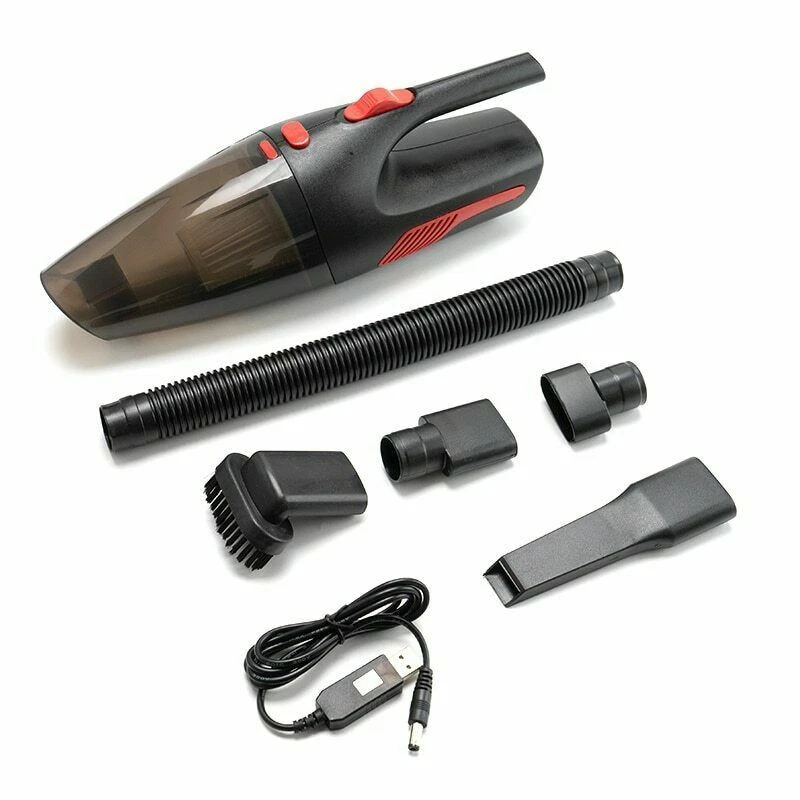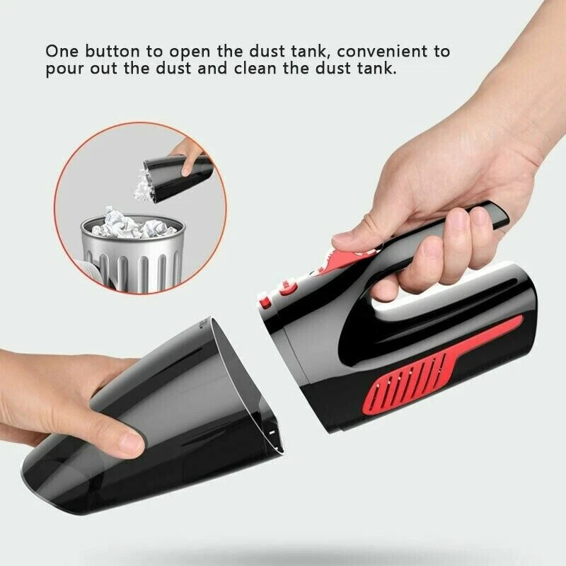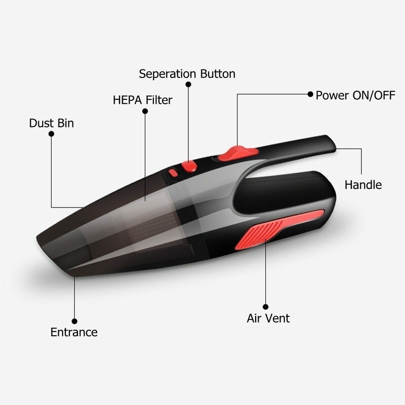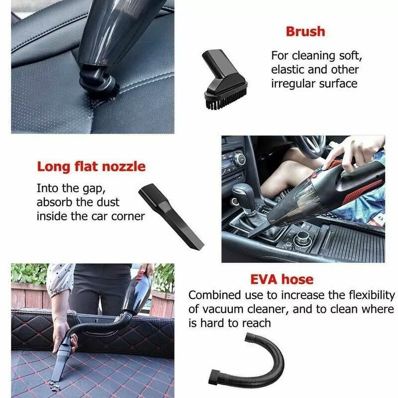 Car Vacuum Cleaner Wireless Hand-Held Vacuum Cleaner Work Wet and Dry Feature: 1.One-key control, easy and convenient to use. 2.One button to open the dust tank, convenient to pou r out the dust and clean the dust tank. 3.Removable and washable HEPA filter makes the vacuum cleaner with maximum suction power and continuous cleaning efficiency. 4.This vacuum cleaner can work wet and dry, cleaning spills, dust and dirt and making your car as clean as new. 5.Shark-gill type heat emission hole can efficiently reduce its working noise. 6.Hand-held design with rear charging port makes this cleaner easy to operate. 7.It can work for 30min after charged for 2 hours. 8.It is suitable for a variety of surfaces including carpets, interior decoration, tiles, furniture, mattresses, bedding, corners, skirting boards and automotive int eriors. Specification: Item Type: Car Vacuum Cleaner Voltage: DC 12V Rated Power: 120W Current: 8A Suction Power: 5kPa Size: 30x5.5x8.5cm LED lighting Battery:2200mAh Package Included: 1 x Car Vacuum Cleaner 1 x Brush Suction Nozzle 1 x EVA Hosepipe 1 x Long Flat Suction Nozzle 1 x Long Suction Nozzle 1 x Short Suction Nozzle 1 x USB Cable