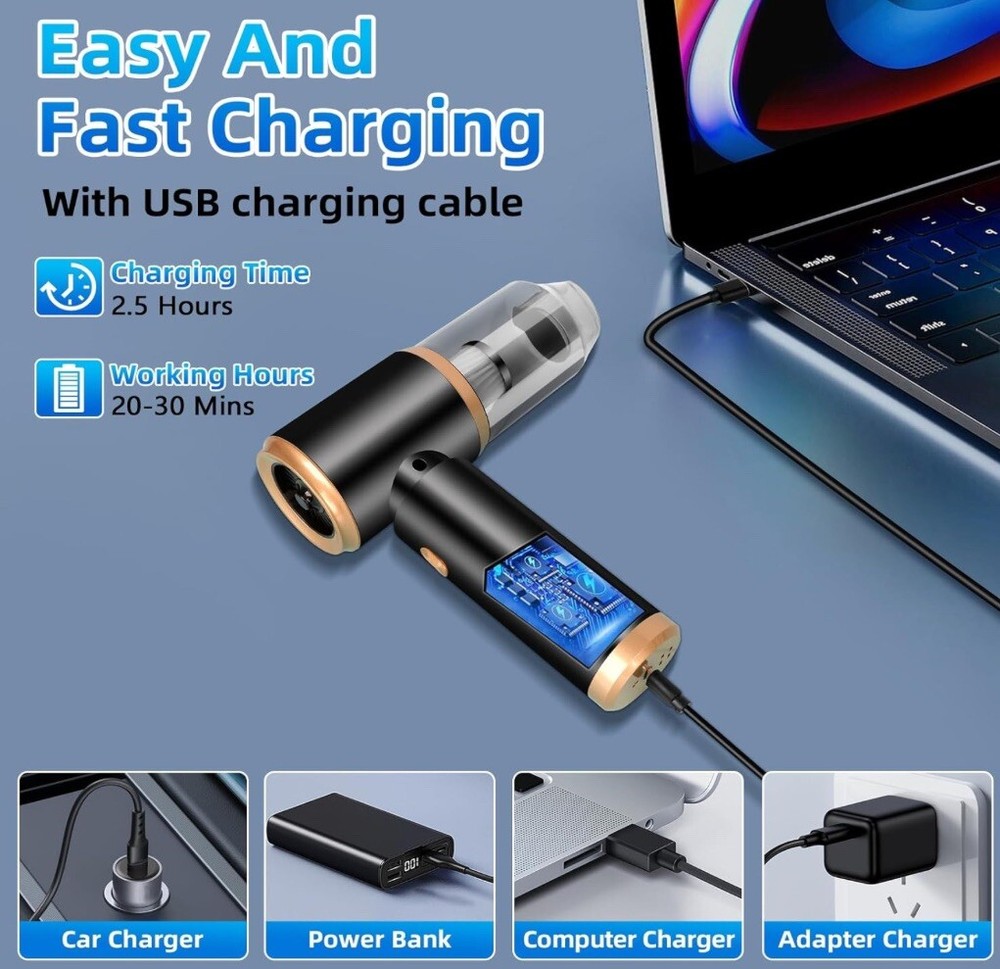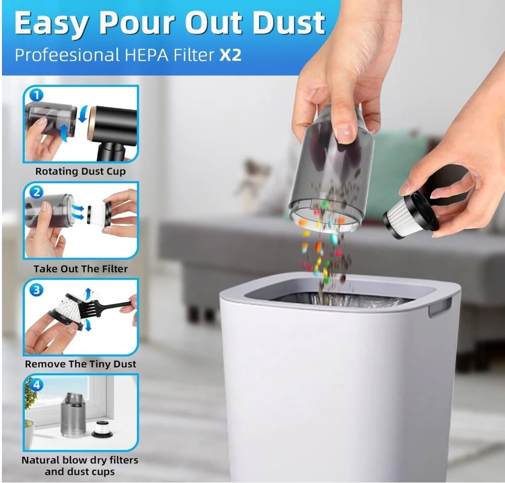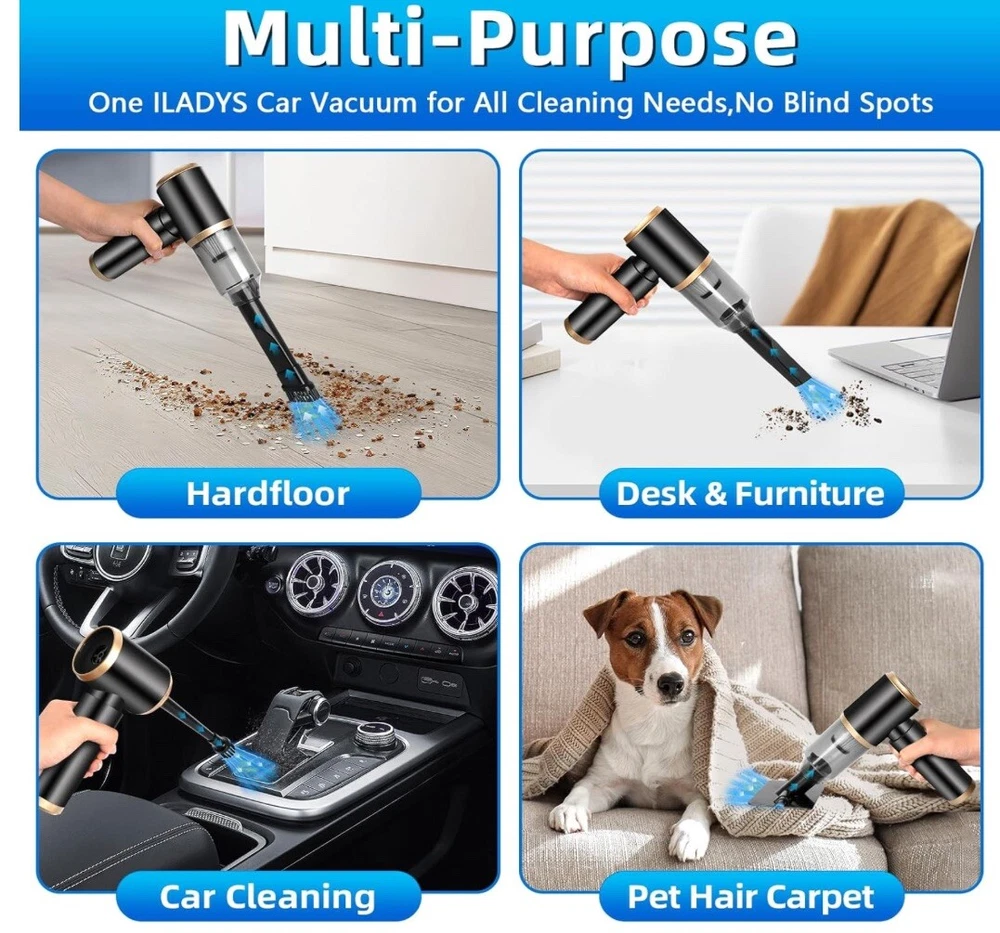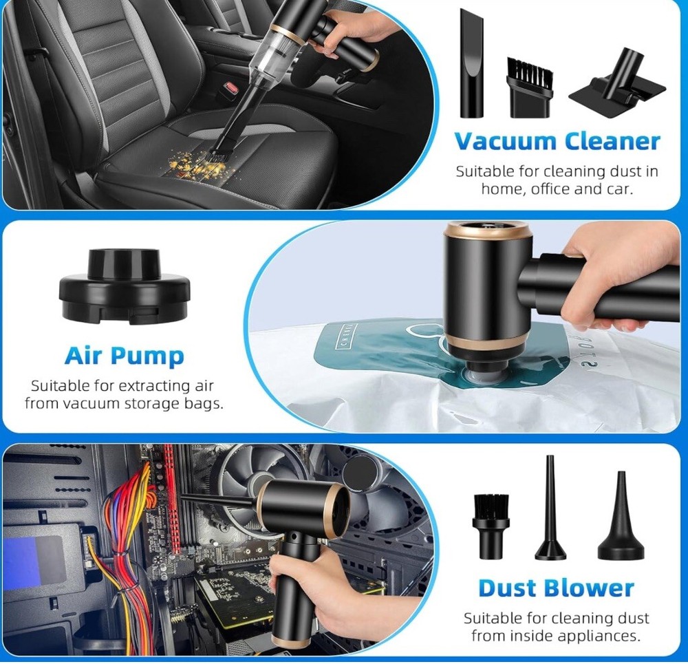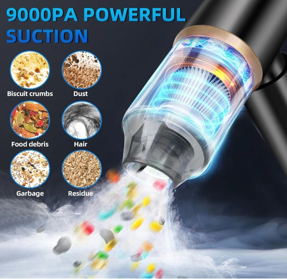 This handheld vacuum is a game-changer for quick cleanups! The 9000Pa suction power easily picks up crumbs, dust, and pet hair from cars, sofas, and tight spaces. Love that it's cordless and lightweight—no more struggling with bulky vacuums. The battery lasts long enough for a full car clean, and the HEPA filter keeps dust trapped. Super convenient with multiple nozzles for different surfaces. Works great in the office too—super quiet and efficient! Highly recommend for hassle-free cleaning on the go.