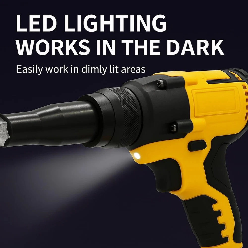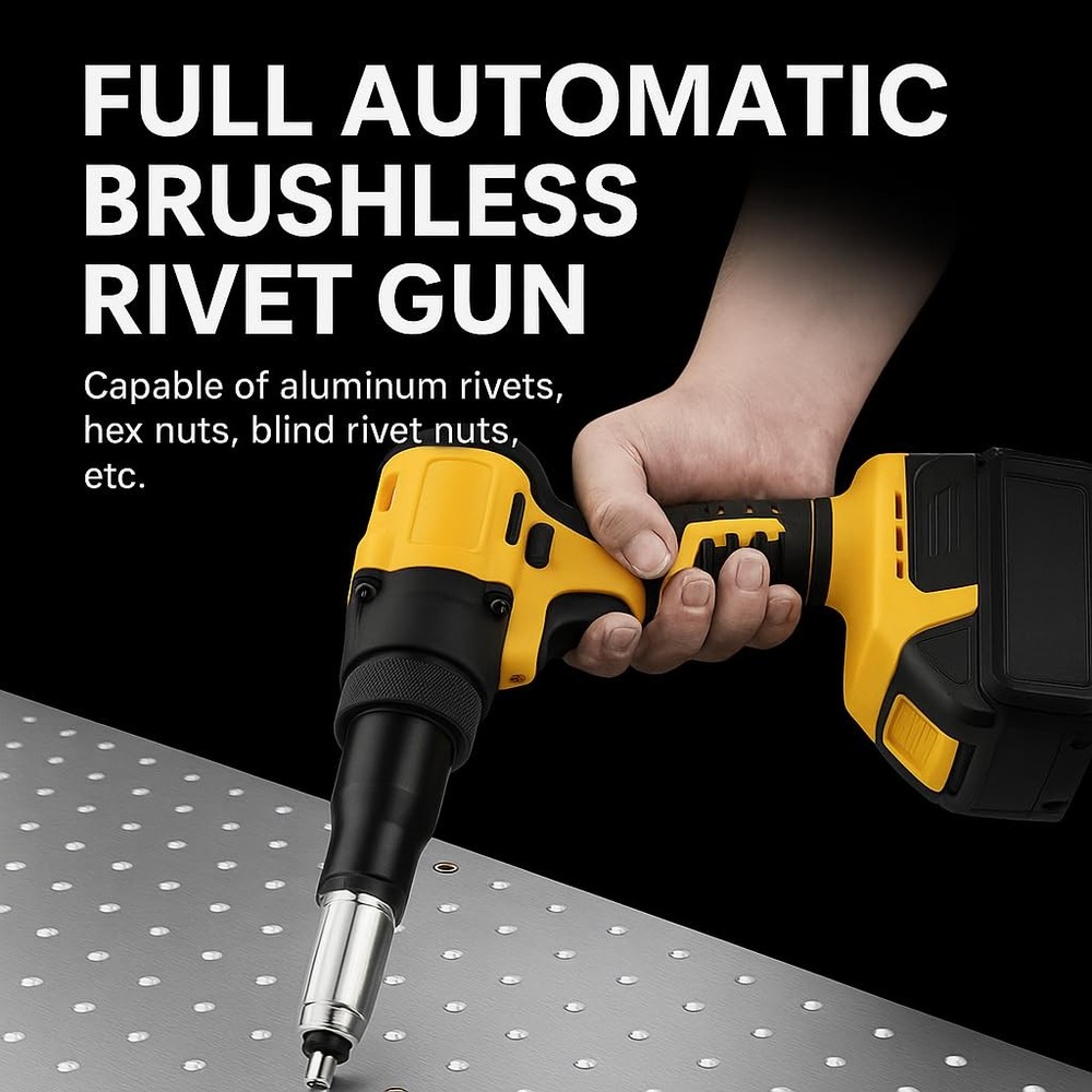 20v Cordless Rivet GunKit:Professional-Grade Power Meets Unmatched Portability Key Selling Points & Features: 1.Heavy-Duty Versatility: Effortlessly pull3/32"", 1/8"", 5/32"", and 3/16"" steel orstainless steel rivets across metals ofvarying thicknesses-ideal for auto repair,steel fabrication, or marine projects. 2.Unrivaled Cordless Performance: The firstwireless rivet tool to deliver 2,000 lbsof pulling force, completing up to 450+1/8"" steel rivets per charge. Eliminatecompressors, hoses, and 60%+ manualeffort. 3.Ultra-Compact Design: At just 6.5"" long,tackle tight spaces (door panels, kayakhatches, RV interiors) with precision. 4. Pro-Grade Durability: Engineered forjobsite toughness-2x longer lifespan thancompetitors, built to withstand drops, dustand daily abuse. 5.Universal Compatibility: Works seamlessly with for 20V batteries (soldseparately), making it a go-to upgrade forexisting tool ecosystems. Category Keywords: rivet gun ,rivet gun,cordless rivet gun,rivet nut tool,electric rivet gun,rivet gun 20v Why Choose 20v Rivet Gun? Whether you're reinforcing aluminumboat hulls at the beach,repairing garageequipment,or securing campervan windows,this tool redefines efficiency. lts 0.8”stroke length ensures rapid, consistentpulls-no jams, no fatigue. For mechanics,metalworkers, or DlYers, it's the ultimateblend of muscle and mobility For Marine Use: Fix corroded rivets ondockside kayaks in minutes. Auto Shops: Replace door panel rivetswithout wrestling with air hoses. RV/Camper Maintenance:Secure loosefixtures in cramped interiors effortlessly Value-Driven Design: Ditch bulky pneumatic kits.With weather resistance and a lightweight frame,the Cerycose thrives in humid, dusty,or greasy environments.Includes a 60-piecequick-set accessory kit (mandrels, nozzles)for instant adaptability Specs: Max Pull Force: 2,000 lbs Stroke Length: 0.8"" Weight: 4.2 lbs (tool only) Upgrade Your Toolkit-Experience cordlessfreedom without sacrificing industrialstrength.Perfect for pros who demandMilwaukee-tier performance at a smarterprice. " Cordless Freedom: Get the job done right without the hassle of cords! Our cordless pop rivet gun runs on a De--Walt 20V battery (battery not included), giving you the power to work anywhere, anytime. No more tripping over cords or being limited by outlets - just pure, unrestricted movement for all your auto repair, metalwork, and DIY projects. It's professional-grade performance, but with the convenience of cordless. Brushless High-Torque Motor: Handles Tough Jobs with Ease!This electric pop rivet gun is equipped with a brushless high-torque motor, specially designed to tackle even the most stubborn rivets! Its powerful pulling force ensures rock-solid, precise riveting every time. Whether it's high-intensity work in auto repair shops or precision tasks in metalworking, its reliable and durable performance makes it your ultimate workhorse. Get More Done, Faster: The ApMiexYo cordless rivet tool makes switching rivet sizes a breeze—no tools needed! Just pop off the nose piece and swap in the size you need. It comes with three sizes (1/8", 5/32", 3/16") and 20 aluminum rivets (20 of each size). Need speed? Hit the mode switch for pneumatic rivet gun power. Need precision? Flip to electric nail gun accuracy. Perfect for HVAC installations and trim work—it’s your all-in-one solution for tough jobs! One Gun, Endless Possibilities: Whether you're dealing with 1/8" or 3/16" rivets, this bad boy handles them all—no extra tools needed! It's your go-to partner for everything from auto repairs to weekend DIY projects. Need to secure threaded drive nuts or blind rivets in tight spots? This electric beauty delivers pinpoint accuracy with zero hassle. Just point, pull, and done—your all-in-one solution for tough jobs! Automatic & Reverse Switch, Easy Work! This cordless beauty has a built-in brain: release the trigger, and it automatically spits out rivets like a pro. Need to adjust a rivet? Hit the reverse switch and tweak it on the spot—no more second-guessing. It’s the ultimate precision tool for auto techs and metalworkers who demand accuracy and flexibility. One pull, perfect placement every time.