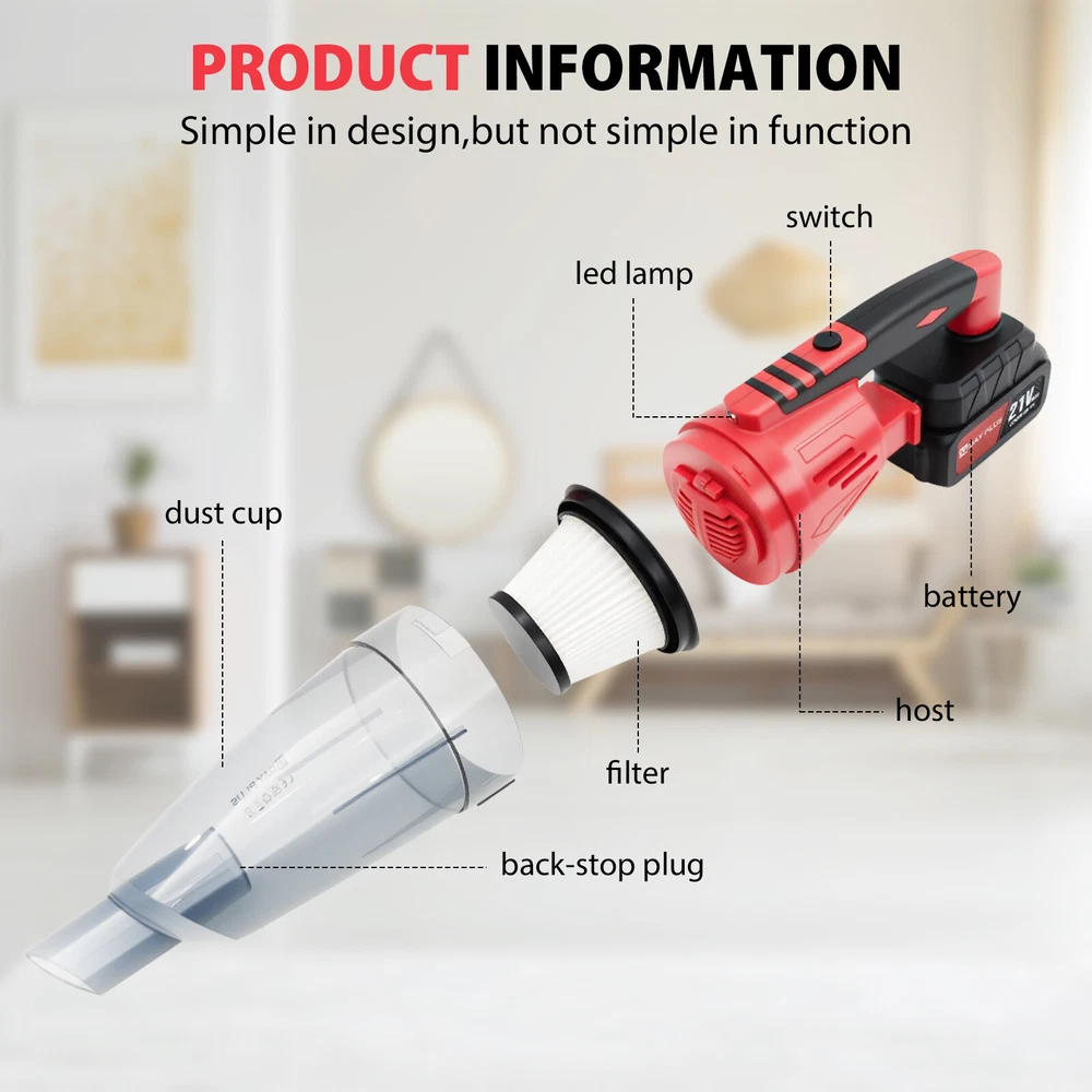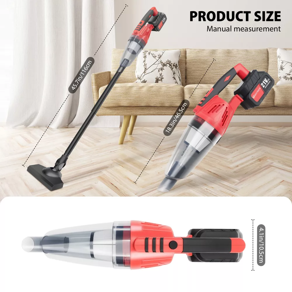 Cordless Stick Vacuum Cleaner Rechargeable Lightweight Carpet Floor Car Vacuum Cordless Vacuum Cleaner Home Stick Vacuum 3 in 1 Lightweight Handheld Vacuum for Pet Hair/Carpet/Hardwood Floor Features: 【 Strong Suction& Large Capacity Battery 】Vacuum cleaner features a powerful motor with strong suction, household vacuum cleaners can easily complete deep cleaning for carpets, hardwood floors, and pet hair. Equipped with Large-Capacity Batteries and Super Fast Charging, the long runtime of this vacuum cleaner carpet can meet your daily cleaning needs perfectly. 【 Double-Cyclone Filtration 】Vacuum cleaner stick's breakthrough Double-Cyclone Filtration System ensures that 99.98% of microscopic dust particles as small as 0.1 microns are filtered out, providing you and your family with fresh air. Stick vacuum cleaner cordless upgraded Double Cyclone Filter provides Powerful Suction so that no dust can escape upright vacuum cleaner and your notice. 【 Multifunctional 】Vacuum cleaner have combination of attachments, including brush head, long crevice tool, and cotton filters etc. Pet hair vacuum cleaner can deep clean curtains, beds, floors, carpets, and any dead corners. this lightweight portable vacuum cleaner ensures that house cleaning is no longer tiring. 【 LED Light 】With strong LED headlights can easily adjust the angle to clean particles and dust in dark places. Carpet vacuum cleaner with a large-capacity dust container makes cleaning easier than ever. Specification: Product :Handheld car and home dual-use hoover Colour:Red and black Packing Weight :2.15KG Collection Container Volume:0.6L Packing Size:385mm*185mm*155mm Voltage : 21V Battery capacity: 2200MAH Rated power : 120W Noted: 1、Don't use it in direct sunlight, high temperature or high pressure place. 2、Don't use petrol or volatile stain remover to wipe the body. 3、Don't take down the front shell when the motor is rotating 4、This product is a car tool, prohibit children from using it alone to avoid danger. Payment Delivery details Terms of sales About us Contact us Payment 1.We accepted PayPal only! 2.Please keep the consistency of the address from Paypal and eBay. 3.Payment must be received within 3 days since you won the item, or eBay will launch Unpaid Reminder Against you. Delivery details Sincerely thank you for choosing us, we suggest you reading our shipping terms and conditions. 1.All items are shipped within 1-2 business days after we confirm your payment and your shipping address. 2.We only ship our items to the areas that our logistics provider covers. 3.To ensure you receive item safely, please offer the concrete and complete shipping address 4.If you are in Puerto Rico,Hawaii,Alaska,APO/FPO,US Protectorates, please contact us via eBay message to discuss the shipping. 5.Please keep the consistency of the address from Paypal and eBay. 6.Sometimes your order may be impacted by extreme bad weather, strikes or other unexpected events. 7.If there are any problems with your order, including late delivery or being lost, please do not hesitate to contact us. We are happy to offer solutions to your inquiries. Terms of sales 1. If you are satisfied, we sincerely hope that you can leave us a positive feedback and 5-star Detailed Seller Ratings, which are of vital importance to the growth of our company. 2. Besides, PLEASE DO NOT leave us 1, 2, 3 or 4-star Detailed Seller Ratings because they are EQUAL TO negative feedback. Like we said before, if you have any questions, please contact us first coz disagreement cannot settle problems. We really appreciate your support! 3. We Strive for Five Star 5/5 detailed rating positive feedback. If for any reason you are not satisfied please give us the opportunity to resolve the issue before leaving feedback or opening a dispute on Paypal or Ebay. Thank you! About us Our advantages are favorable prices, local warehouse, fast delivery, quality assurance and after sales service. Contact us If you have any question,Please no hesitation to contact us via ebay message, we will reply you within 24 working hours.