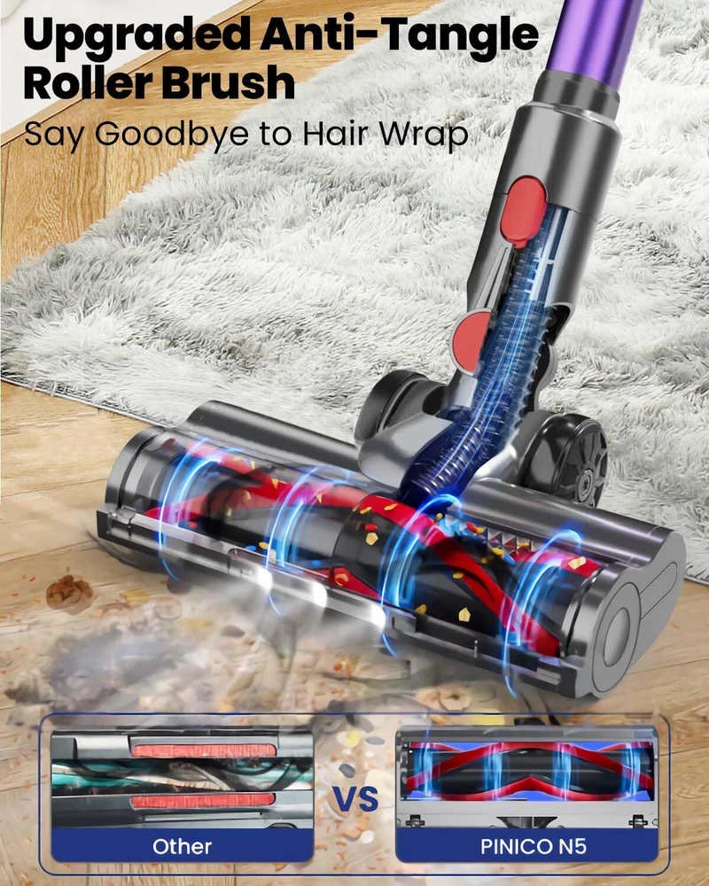 【Unmatched Deep Cleaning in One Stroke】:Experience the extraordinary strength of the vacuum cleaner. Upgraded 200W high-power motor unleashes an astonishing suction power of up to 25000Pa, easily penetrating furniture gaps and deep carpet fibers to capture stubborn dust and microscopic particles in one fell swoop, bringing a refreshing transformation to your home environment. 【Unparalleled Freedom with Extended Battery Life】:Feel the unparalleled freedom of the cordless vacuum cleaner. With its exceptional battery performance, it effortlessly tackles spaces up to 2200 square feet in a single charge. Boasting a runtime of 40 minutes and interchangeable accessories, it allows you to clean every corner of your home as you wish, effortlessly enjoying the joy of cleaning. 【6-Stage Filtration for Pure Health】:Savor the health benefits of the wireless vacuum cleaner. The 6-stage Filtration system captures 99.9% of dust and fine debris. Whether on hardwood floors, carpets, or furniture surfaces. Provides you and your family with a fresh, healthy living environment.Let every breath be a delight. 【Effortless Dust Management with Super Dustbin】: Discover the convenience and efficiency of the stick vacuum cleaner. 1.5L dustbin significantly reduces the hassle of frequent emptying.One Click Empty Design makes the dust disposal process exceptionally simple; with just a gentle press, the dust and debris inside the dustbin can be quickly cleared, making your cleaning tasks easier and more efficient. 【Innovative Anti-Tangle & LED-Lit Floor Brush】:Appreciate the thoughtful design of the vacuum cordless rechargeable. Innovative anti-tangle roller brush effectively prevents hair and debris entanglement, smoothing the cleaning process.Addition of the LED floor brush like a searchlight, illuminating blind spots and ensuring every inch of space is as clean as new!